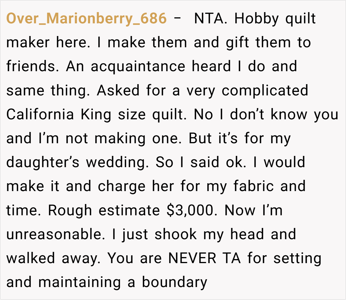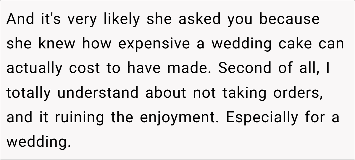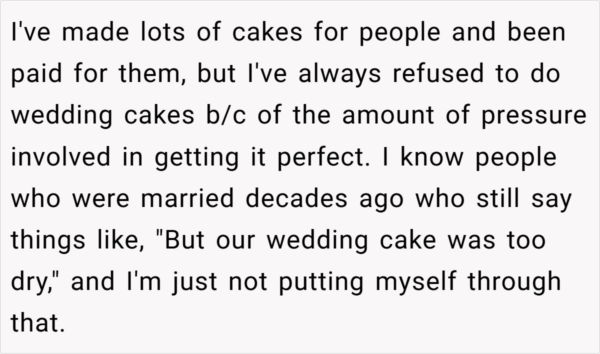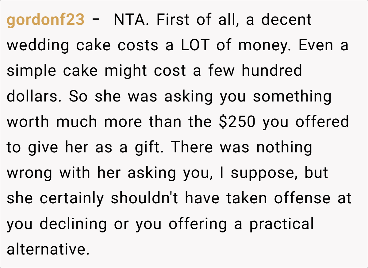 The Reddit community overwhelmingly supported the baker’s decision. Many commenters pointed out that her offer of $250 was not only reasonable but also a respectful way to honor her passion without compromising her enjoyment. They noted that expecting her to produce a wedding cake that far exceeds her budget and comfort zone was both impractical and unfair. The consensus? She’s NTA for setting and maintaining her boundaries, and her cousin’s reaction reveals an unbalanced sense of entitlement.