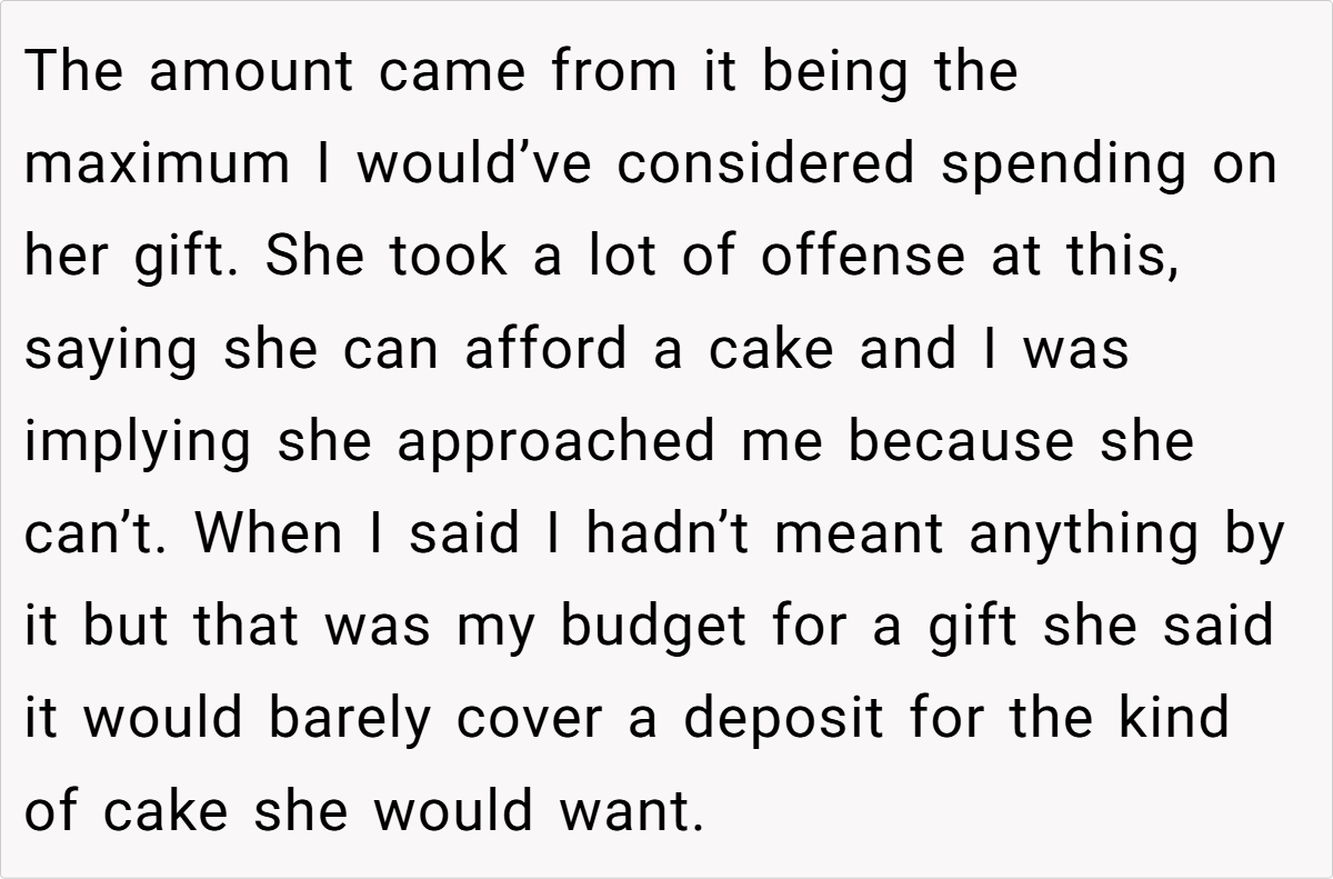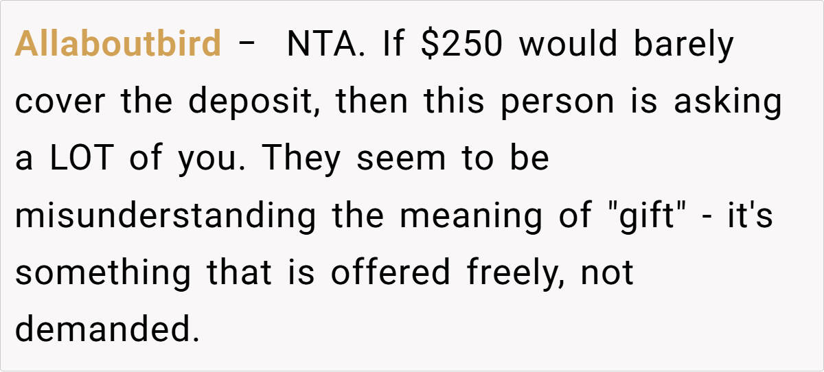 Additionally, when a loved one insists on something that doesn’t align with your values or enjoyment, it’s perfectly acceptable to offer an alternative. Dr. Harper adds, “Sometimes, the best gift is the one that acknowledges your limits while still showing care. A cash gift, when given with clear intent, is both practical and thoughtful.” The baker’s offer of $250 is not an afterthought—it’s the exact amount she feels comfortable spending, ensuring that her gift remains sincere and within her means.