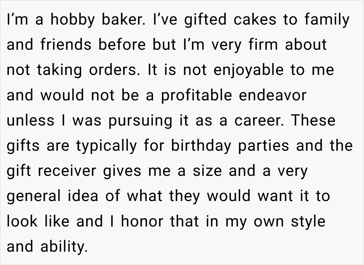 Gift-giving is meant to be a thoughtful expression of love, but sometimes the best gifts come with clear boundaries. In this case, a dedicated hobby baker—who usually creates custom cakes for birthdays and special occasions—was asked by her cousin to make a wedding cake as a wedding gift. While she cherishes baking, she’s also firmly decided not to take orders, as the pressure and work involved simply aren’t enjoyable for her. With her own standards and style in mind, she had always given her cakes as heartfelt gifts rather than professional services.