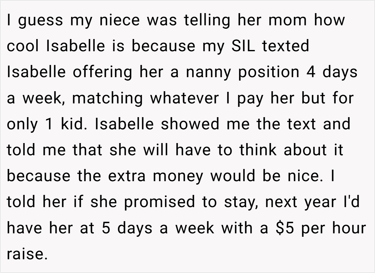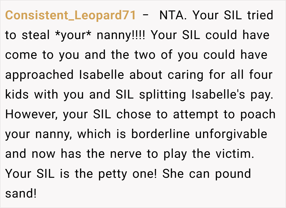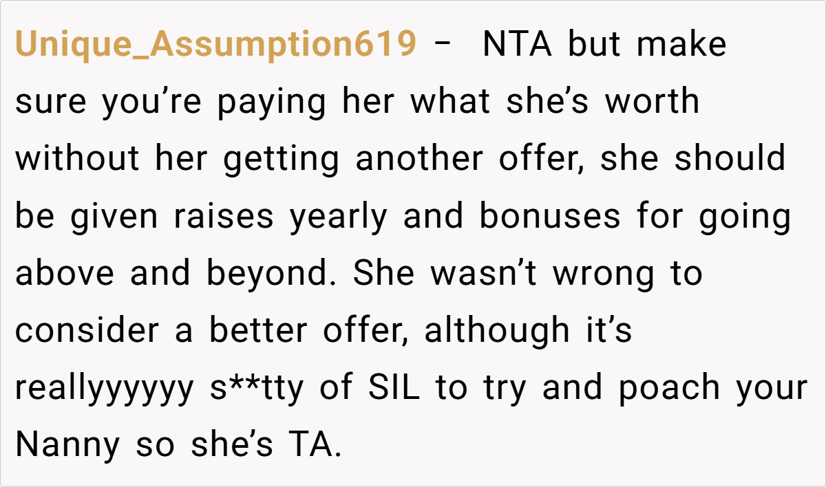 Analyzing the situation reveals two distinct perspectives. On one side, the OP’s proactive measures to secure Isabelle’s services underscore a parental instinct to safeguard what works best for the children. On the other, the sister-in-law’s attempt to entice Isabelle away suggests a willingness to disrupt a successful arrangement for personal gain. This clash of priorities not only exposes underlying family tensions but also raises important questions about fairness, respect, and the true cost of quality care.