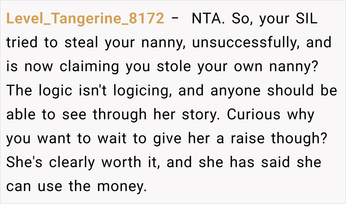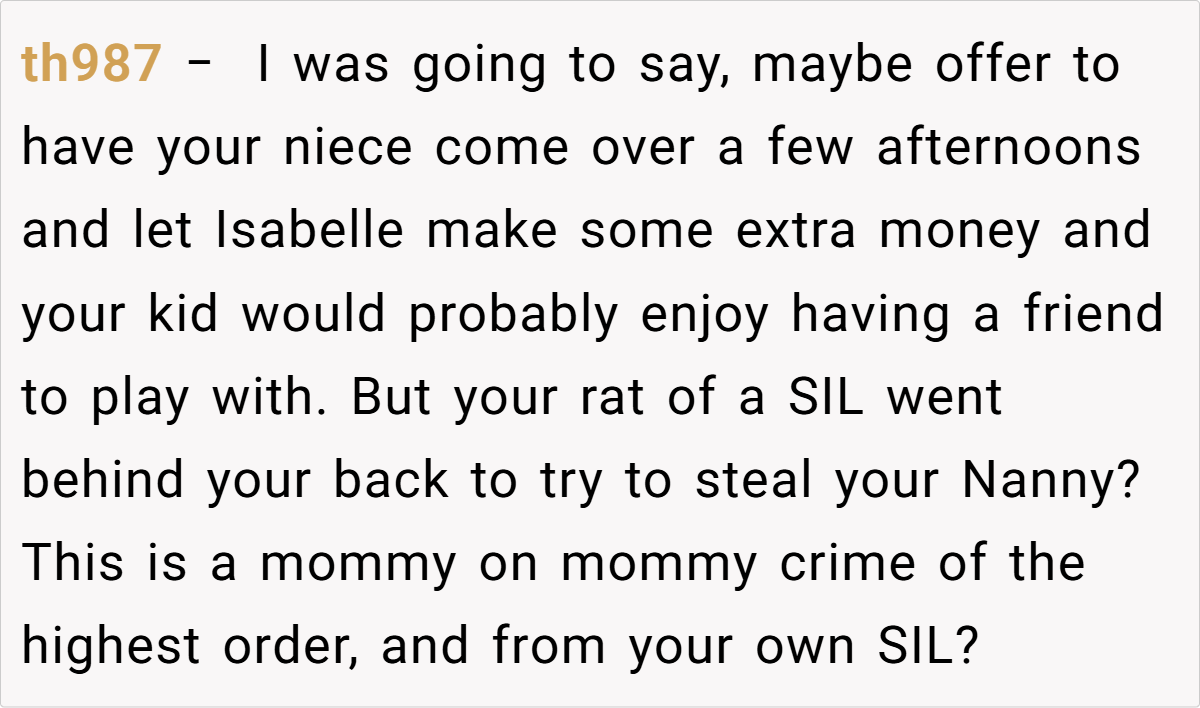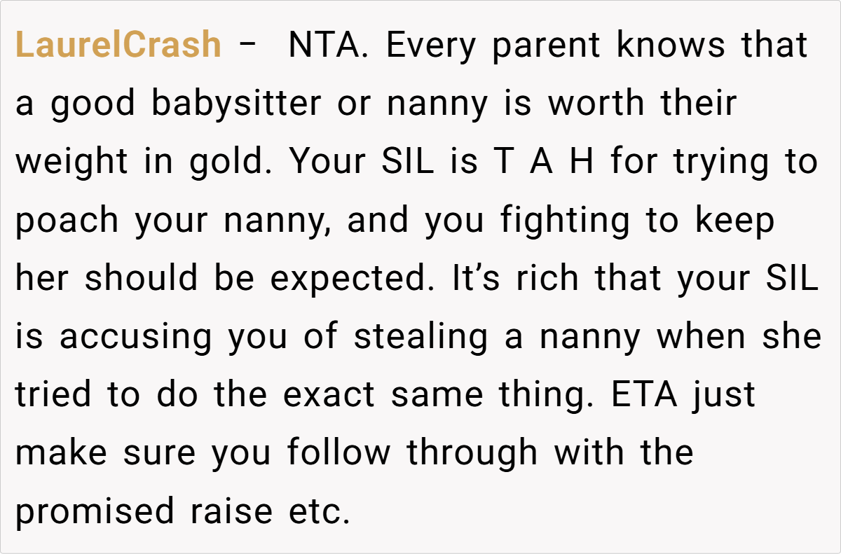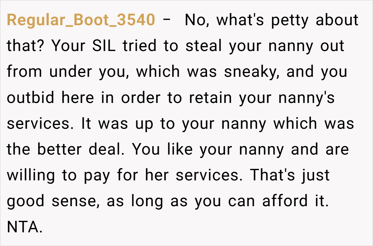 Analyzing the situation reveals two distinct perspectives. On one side, the OP’s proactive measures to secure Isabelle’s services underscore a parental instinct to safeguard what works best for the children. On the other, the sister-in-law’s attempt to entice Isabelle away suggests a willingness to disrupt a successful arrangement for personal gain. This clash of priorities not only exposes underlying family tensions but also raises important questions about fairness, respect, and the true cost of quality care.