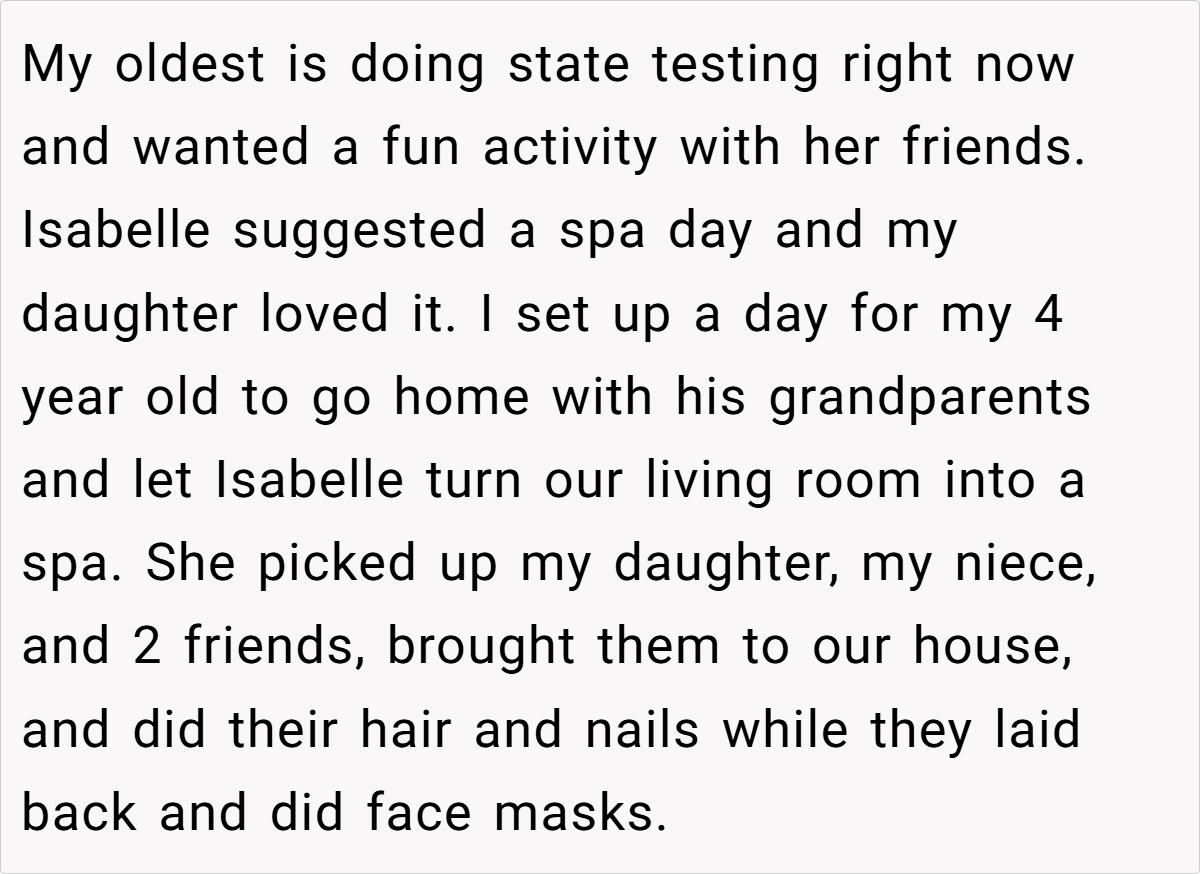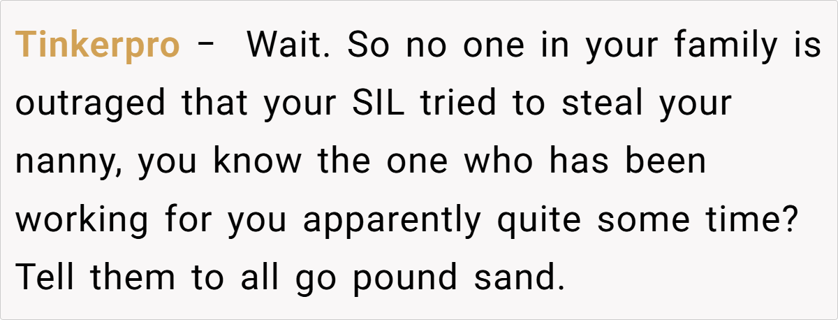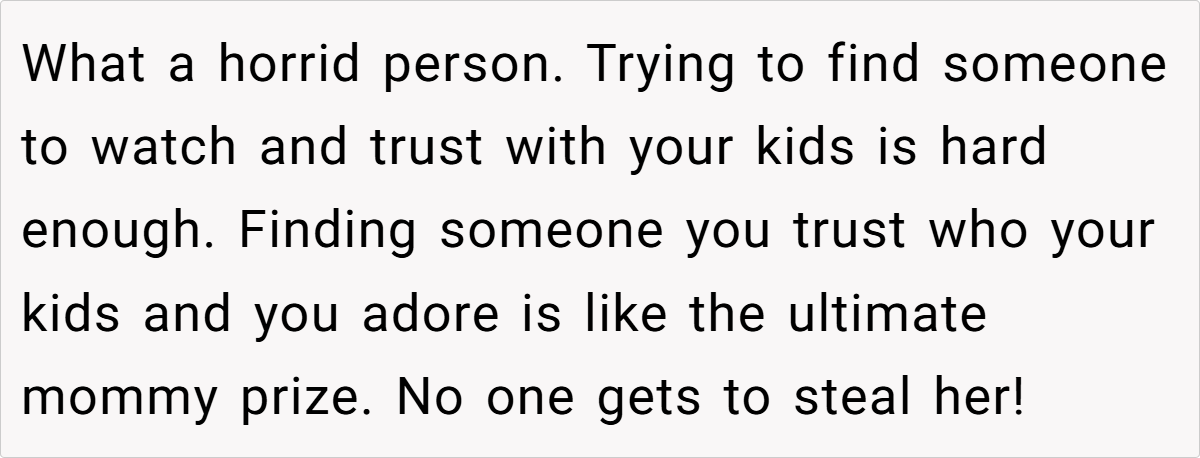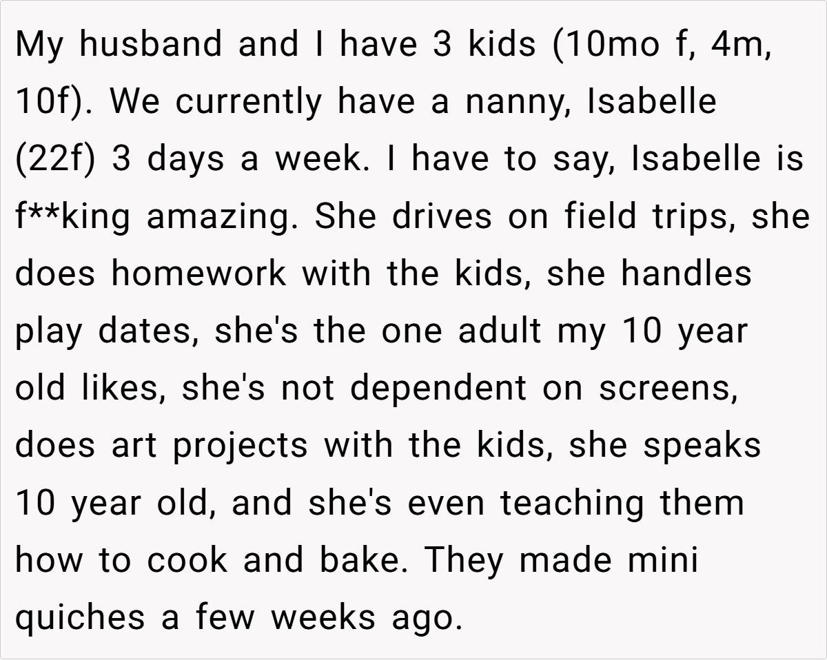 This story highlights not only the importance of a trusted caregiver but also the complexities that arise when personal and familial expectations collide. The OP’s commitment to Isabelle is unmistakable—she fills the home with warmth, creativity, and stability. Yet, when a competing offer emerged from within the family circle, what began as a simple matter of childcare morphed into a delicate tug-of-war over loyalty and trust.