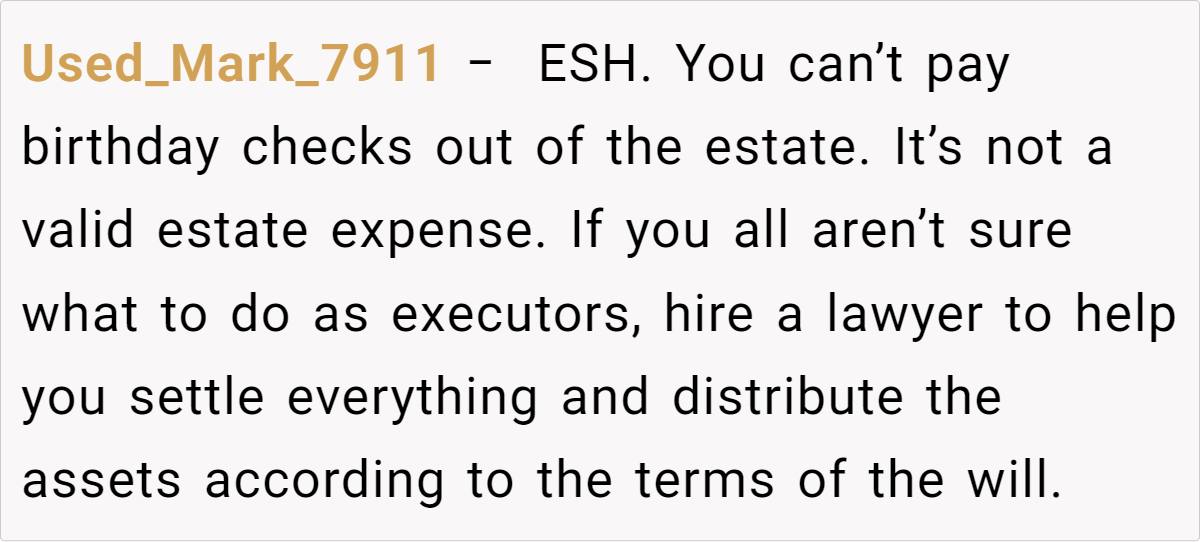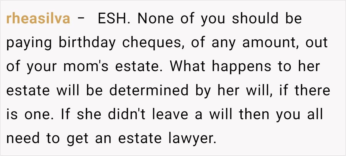 The Reddit community has been abuzz with opinions on this delicate issue. Some users argue that birthday checks should never come from the estate, insisting that such expenses are personal gifts rather than estate obligations. Others feel that if the family unanimously agrees, there might be room to adapt the tradition—though many caution that altering a long-held practice could set a dangerous precedent. The varied responses—from “ESH” to “YTA”—underscore just how complex matters of family legacy and fairness can be.