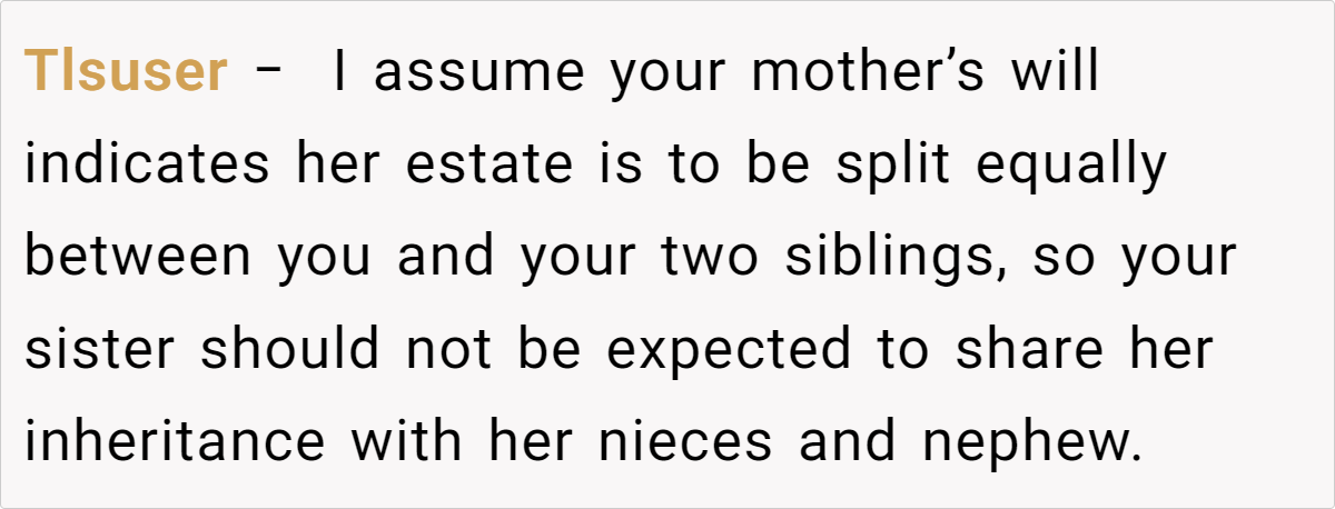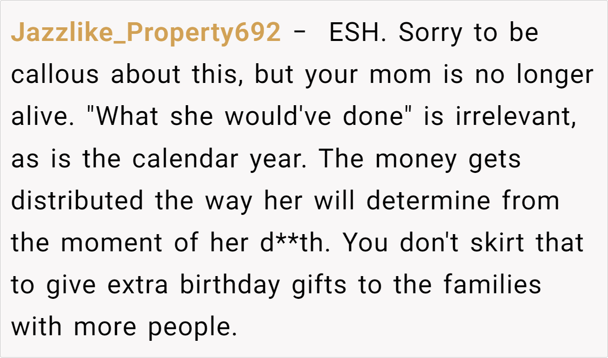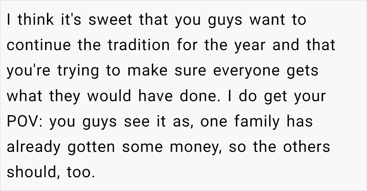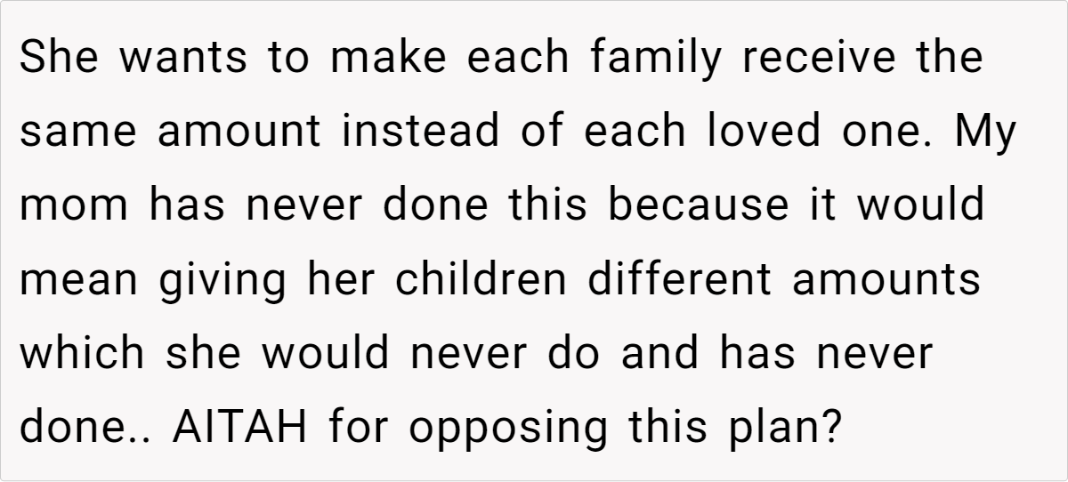 At the heart of the matter is a proposed change: one sister wants to adjust the payouts so that each family receives the same total amount, rather than giving each person an equal share. Our OP, however, believes that this new approach would stray too far from the values and practices their mom cherished. This clash over honoring a beloved tradition versus adapting to new circumstances has left the family—and readers—wondering where the right balance truly lies.