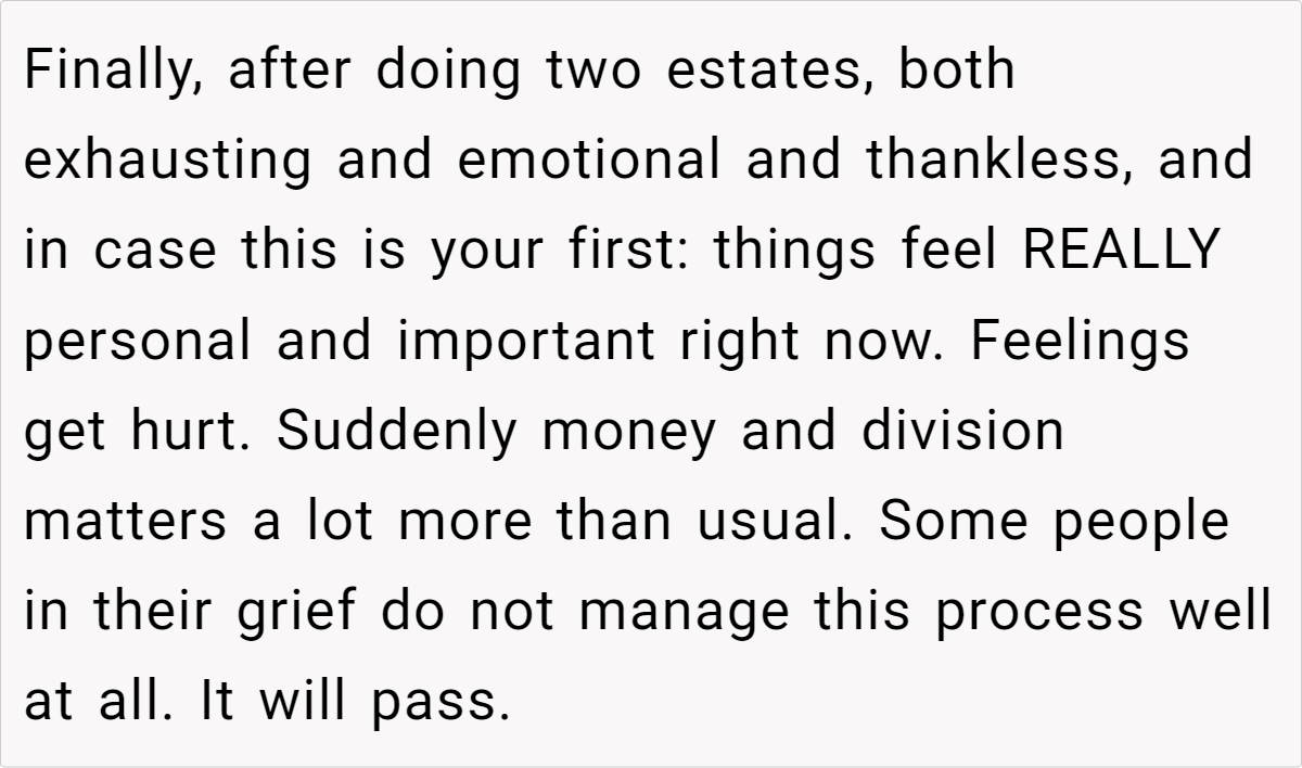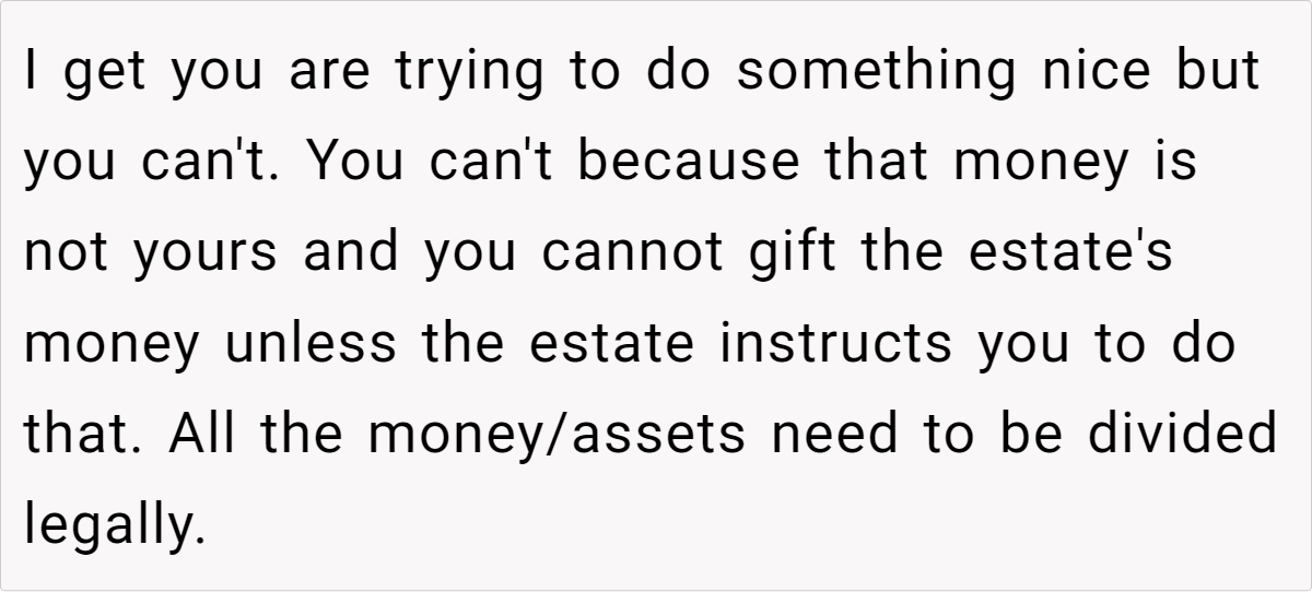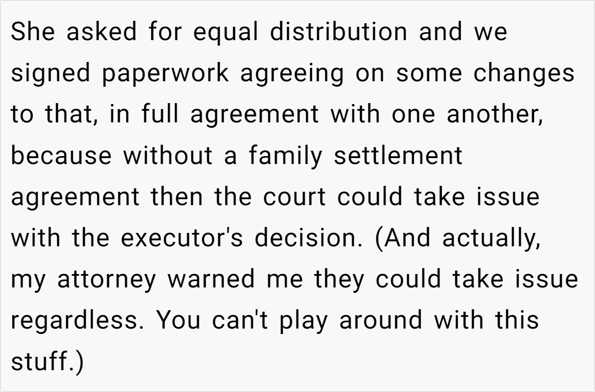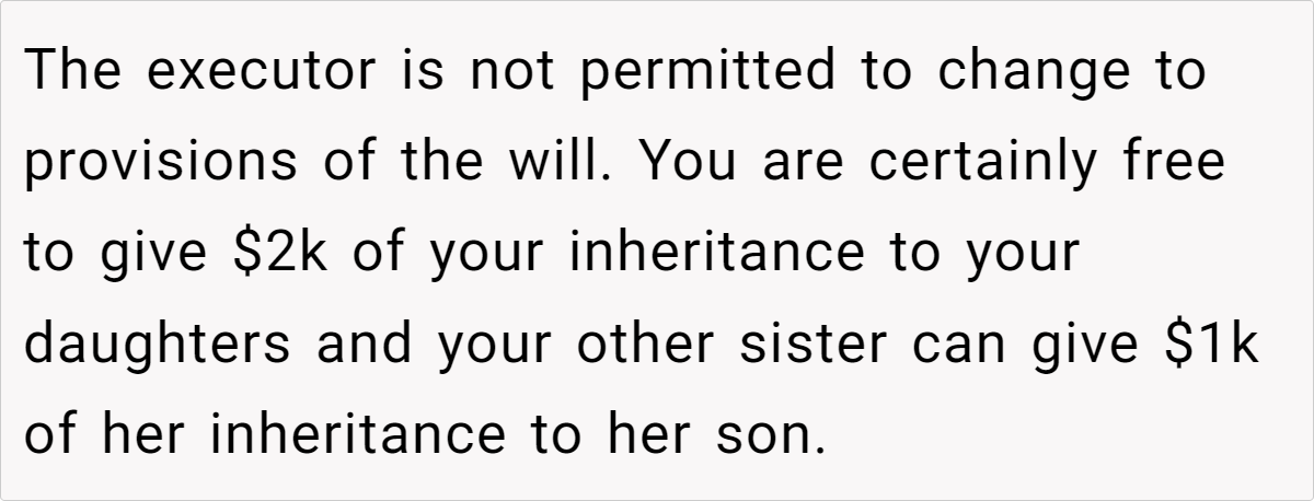 Ultimately, this debate isn’t just about money—it’s about preserving a legacy and honoring a loved one’s traditions while navigating the practical realities of estate law. Whether you believe the OP is right to stand by her mother’s way or that adapting to a new approach is more equitable, it’s clear that these decisions are never straightforward.