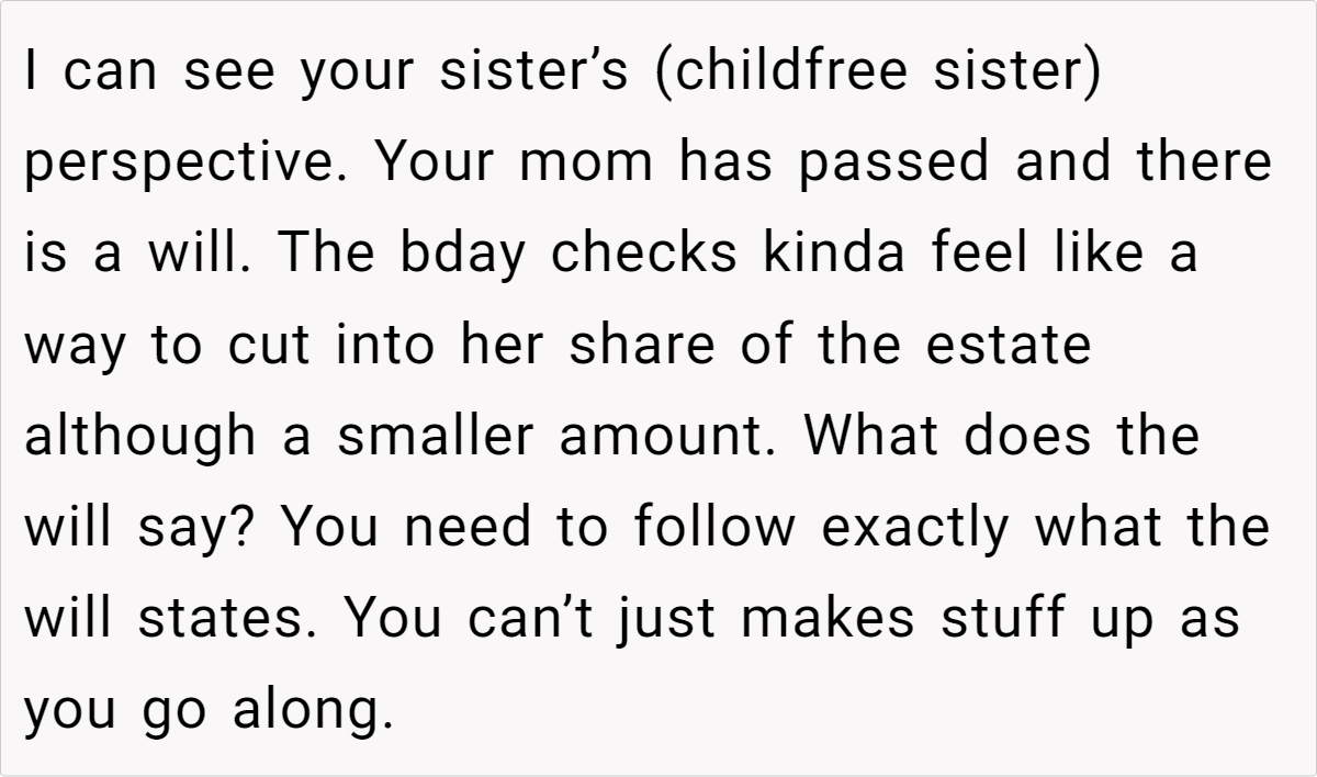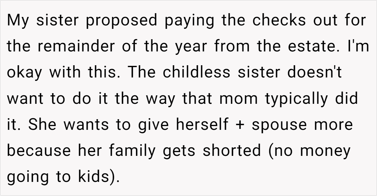 The core issue here is a disagreement about how to distribute funds from the estate. The OP’s mother had a tradition of giving birthday checks to family members, and the OP wants to continue this tradition for the remainder of the year. However, her childless sister proposes a different approach, arguing that the distribution should be equal across families, rather than individuals, to compensate for the fact that some families have more members (and thus, would receive more money under the original plan).