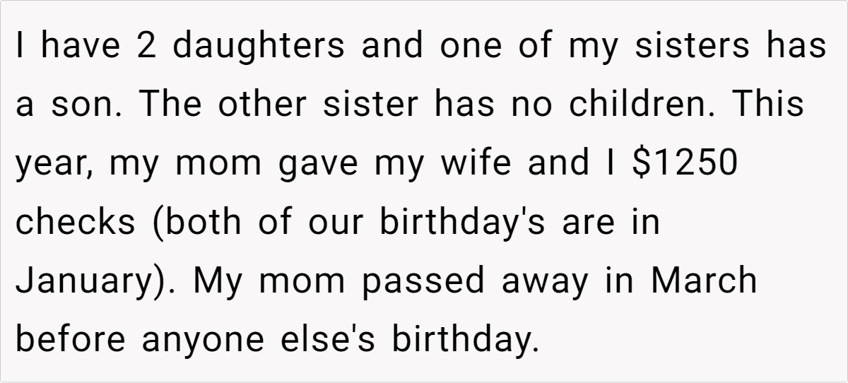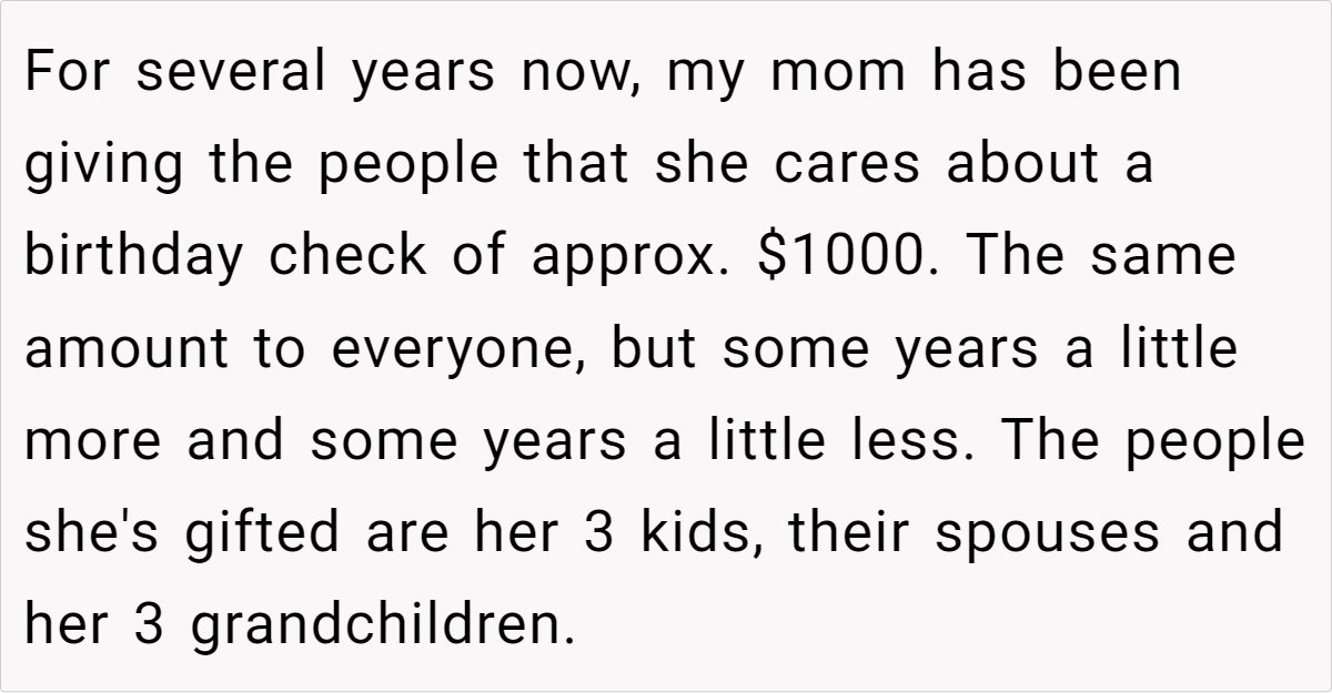Losing a parent is never easy, and when traditions come into play, emotions can run even higher. For years, our OP’s mom lovingly handed out birthday checks—around $1,000 each—to her closest loved ones, treating every individual equally. Now, with her passing and a will in place, the question of how to honor that tradition has sparked a heated family debate.