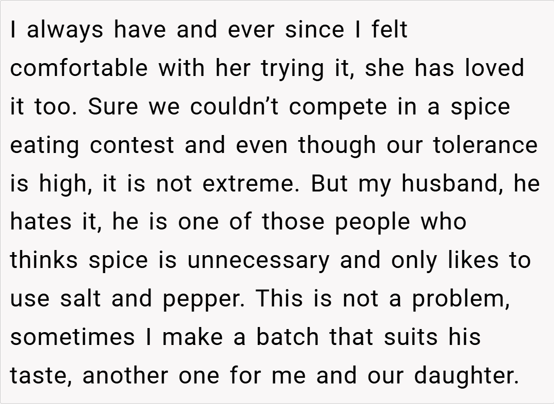 In the end, this isn’t just about a spicy meal—it’s a reminder of how simple communication can prevent big arguments. Do you think that partners should always check in about everyday matters like meals, or should one assume the best when someone’s been away? How have you navigated differences in food preferences in your relationships? Share your thoughts and experiences in the comments below!