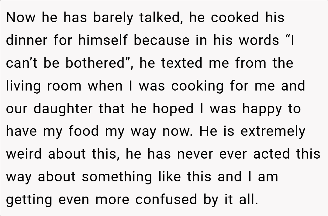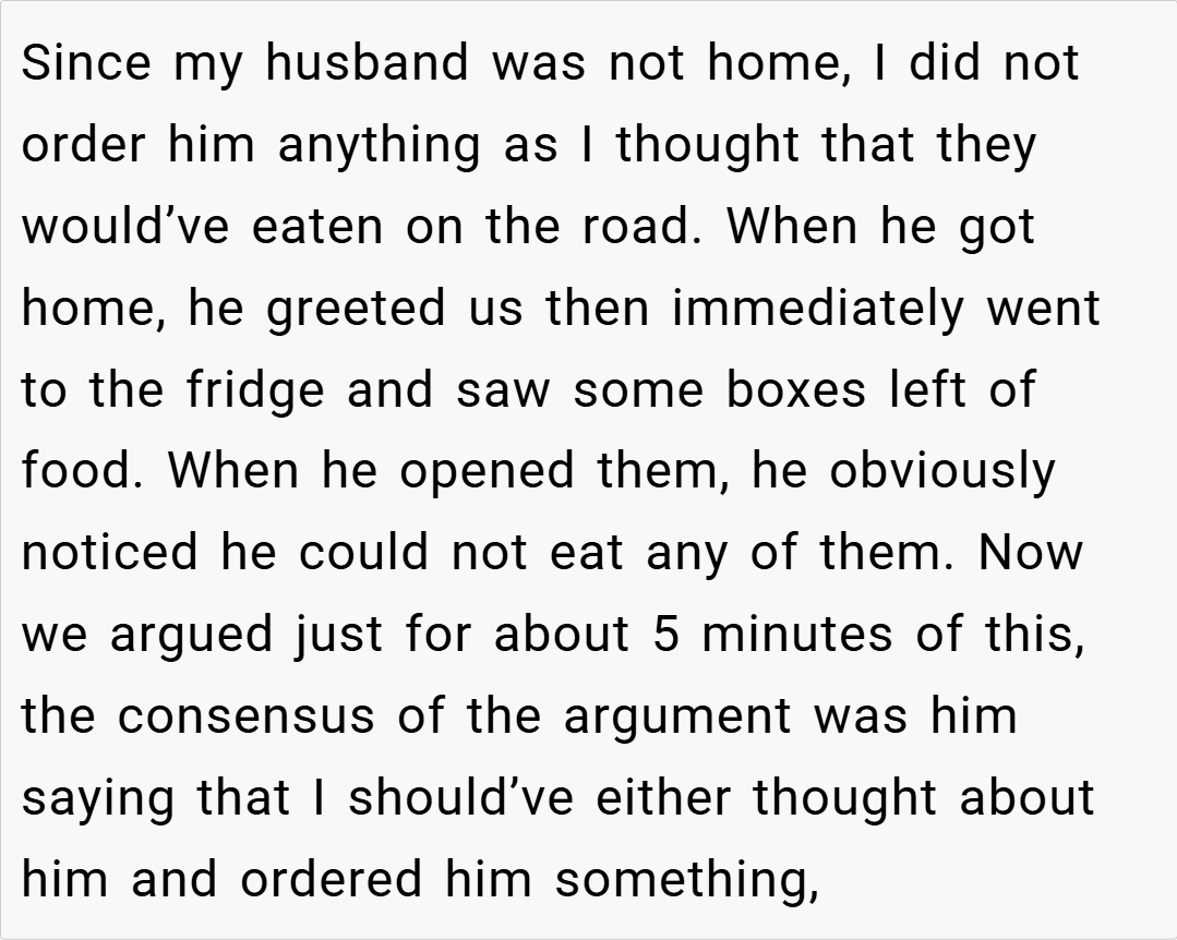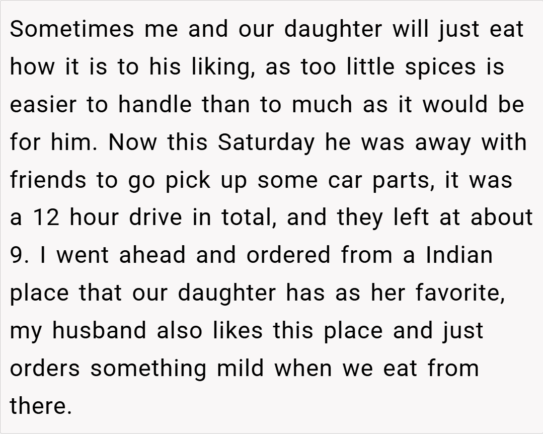 The situation unfolded on a Saturday when my husband was away on a long car trip picking up parts. I assumed he’d eaten along the way, so I ordered a meal that catered to my and our daughter’s love for spice. However, when he returned to find only boxes of food he couldn’t eat, our disagreement quickly flared up. Now, I’m left wondering if my decision was justified or if I should have foreseen his reaction better.