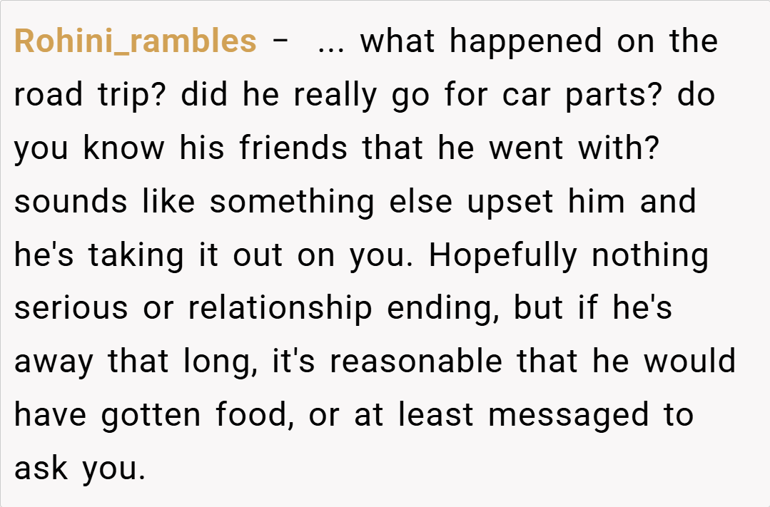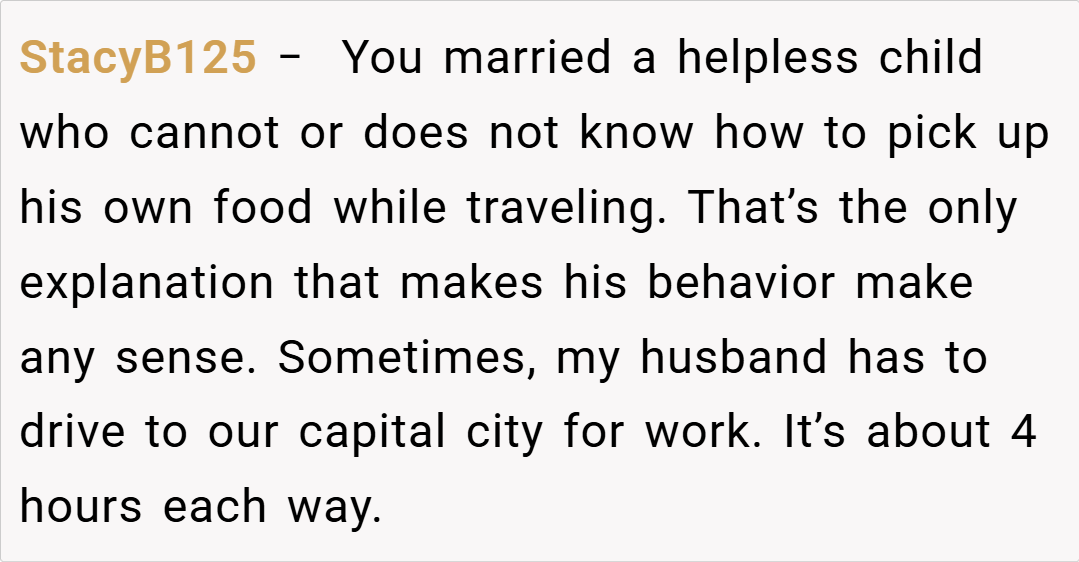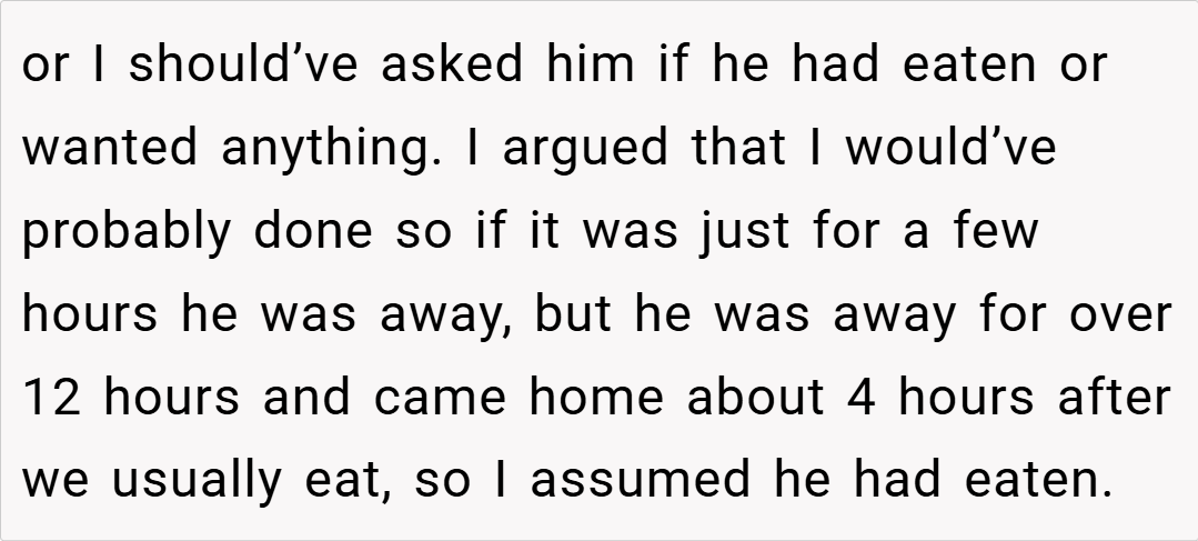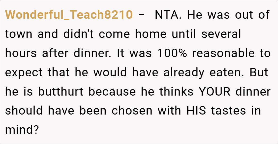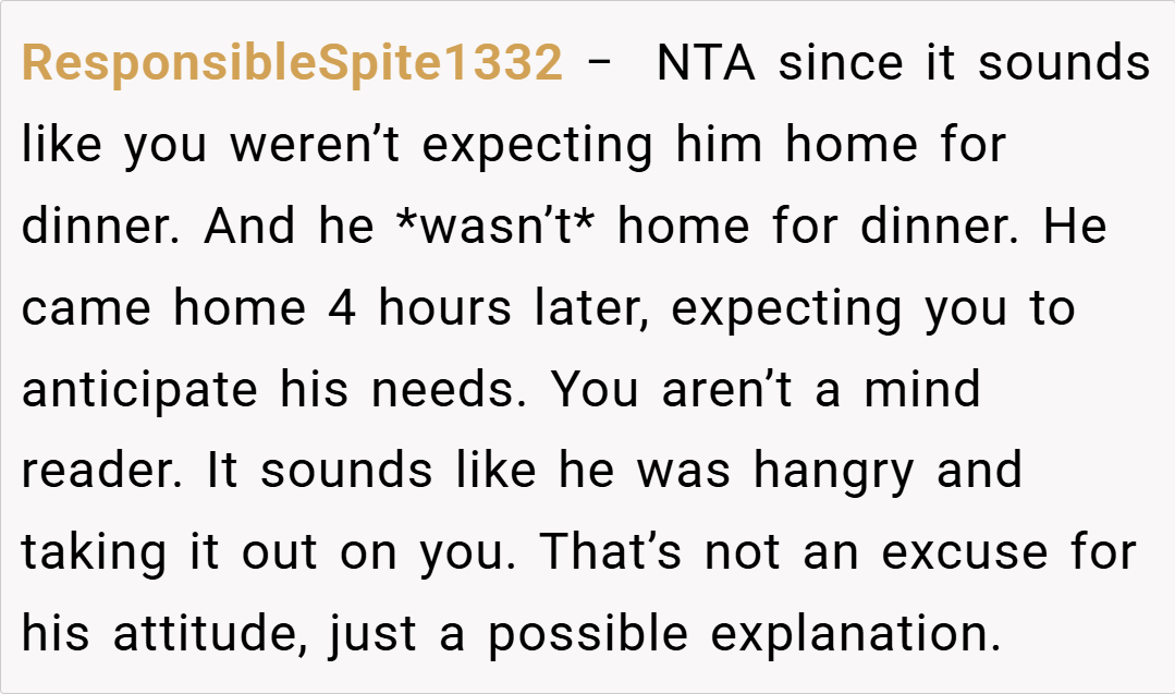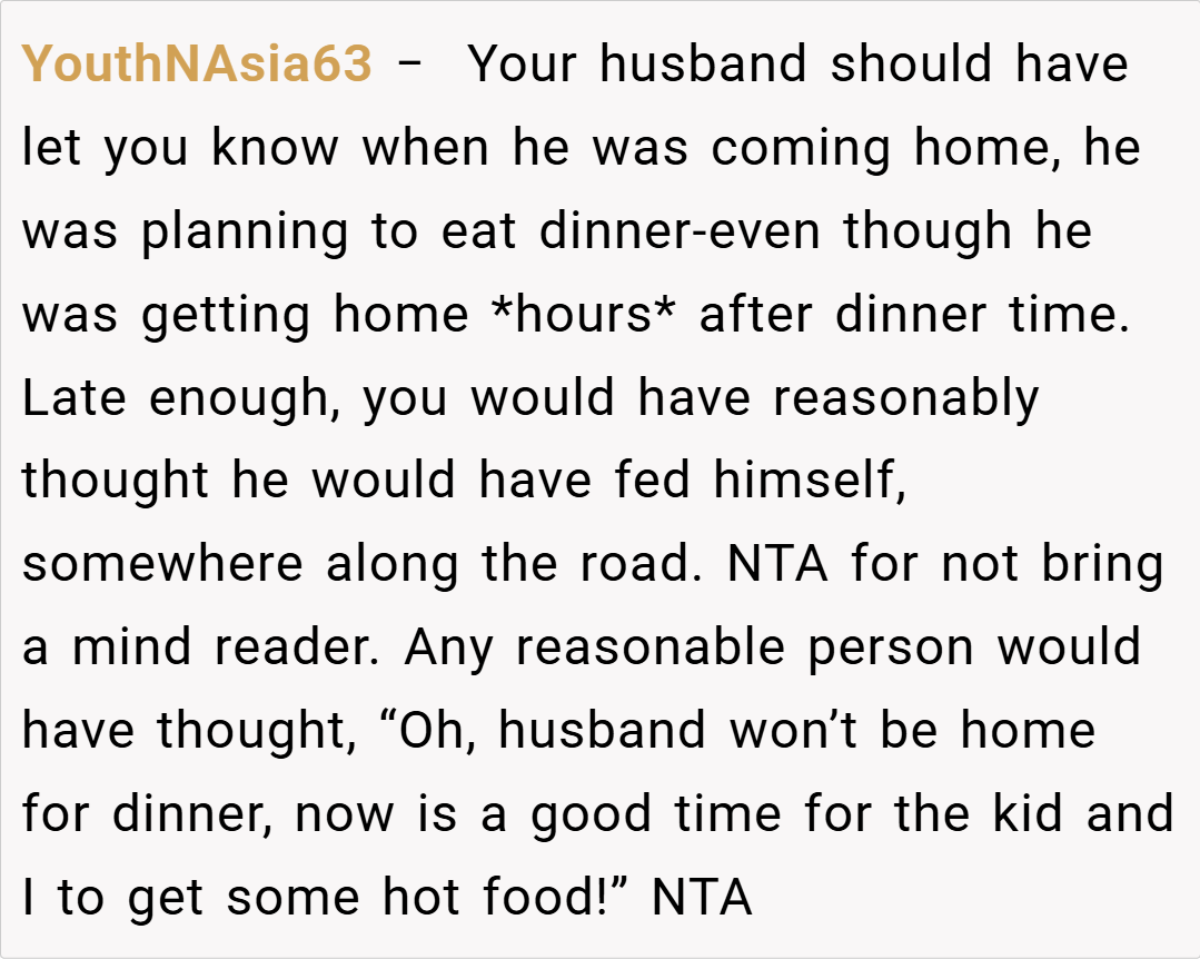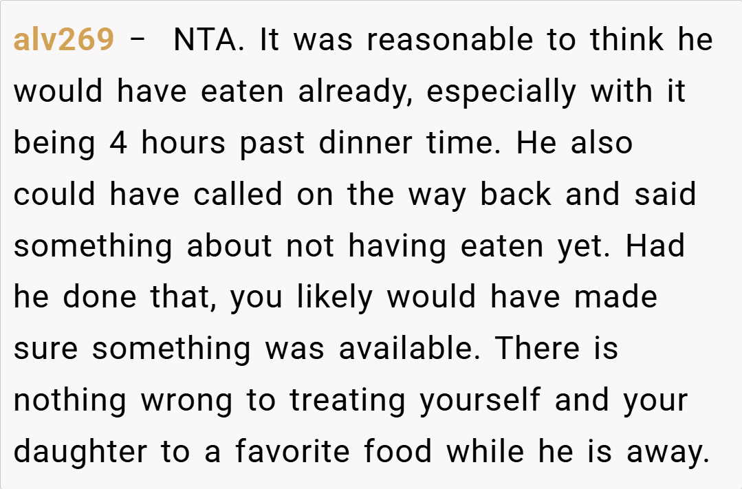 Redditors are largely in agreement that I’m NTA. Many pointed out that my husband should have communicated his hunger or dietary needs when he was on the road. Others speculated that his reaction might be rooted in deeper issues, such as feeling unappreciated or even being a bit hangry after a long drive. Overall, the community consensus is that it’s unreasonable to expect someone to be a mind reader—if you’re away for 12 hours, it’s safe to assume you’ve had dinner unless you say otherwise.
