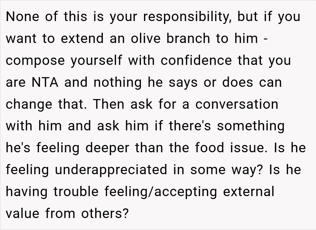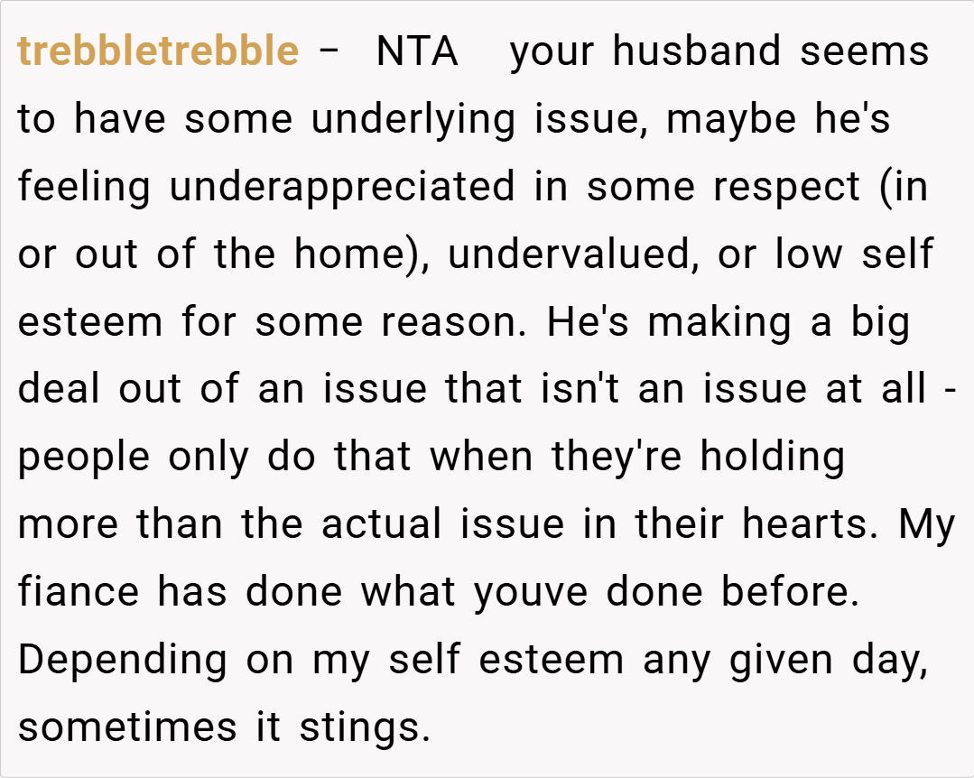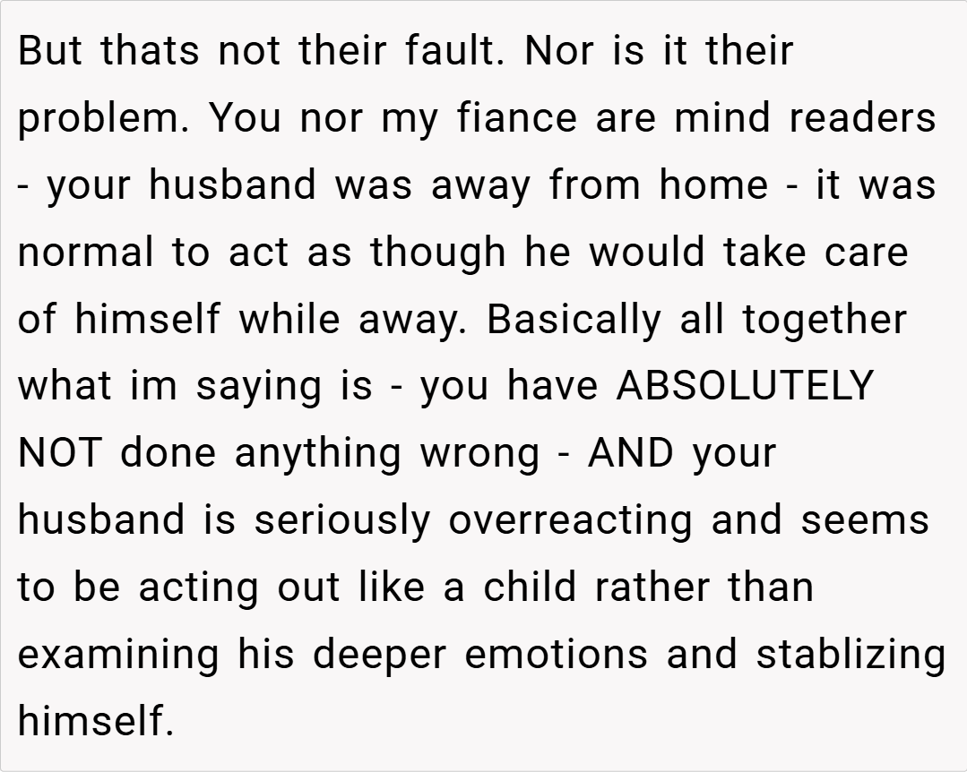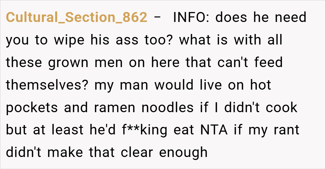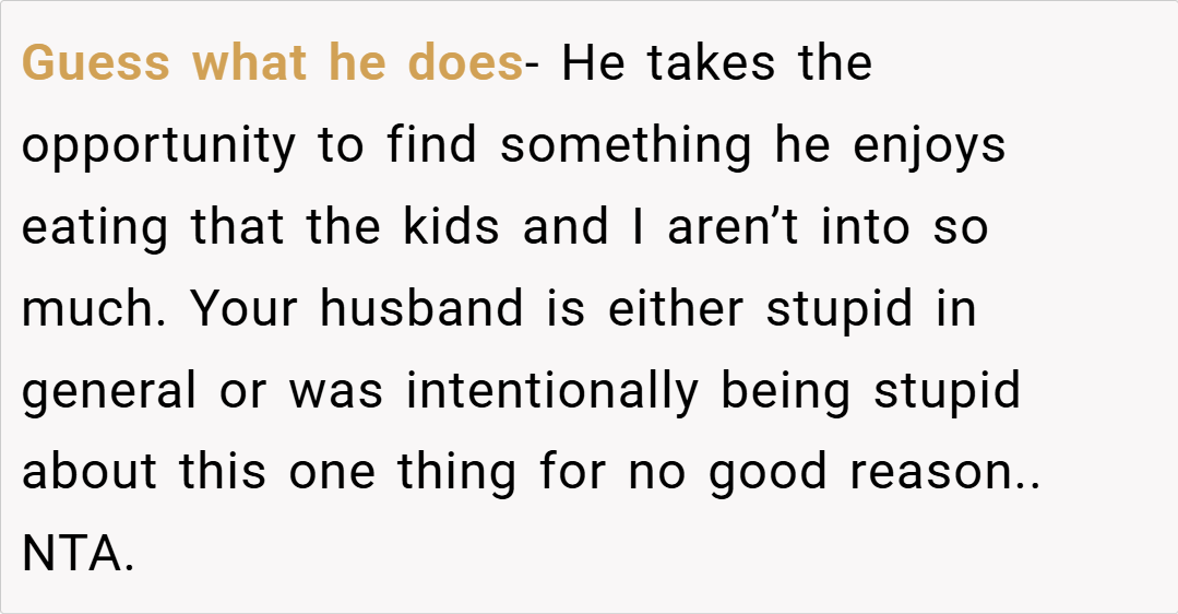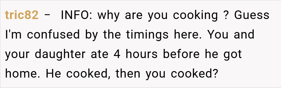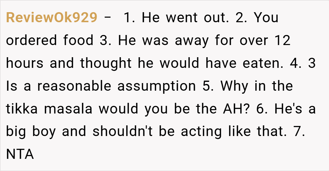 Redditors are largely in agreement that I’m NTA. Many pointed out that my husband should have communicated his hunger or dietary needs when he was on the road. Others speculated that his reaction might be rooted in deeper issues, such as feeling unappreciated or even being a bit hangry after a long drive. Overall, the community consensus is that it’s unreasonable to expect someone to be a mind reader—if you’re away for 12 hours, it’s safe to assume you’ve had dinner unless you say otherwise.