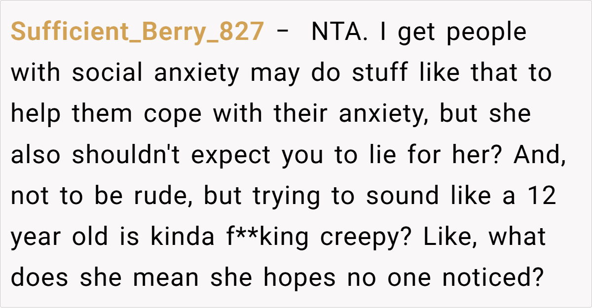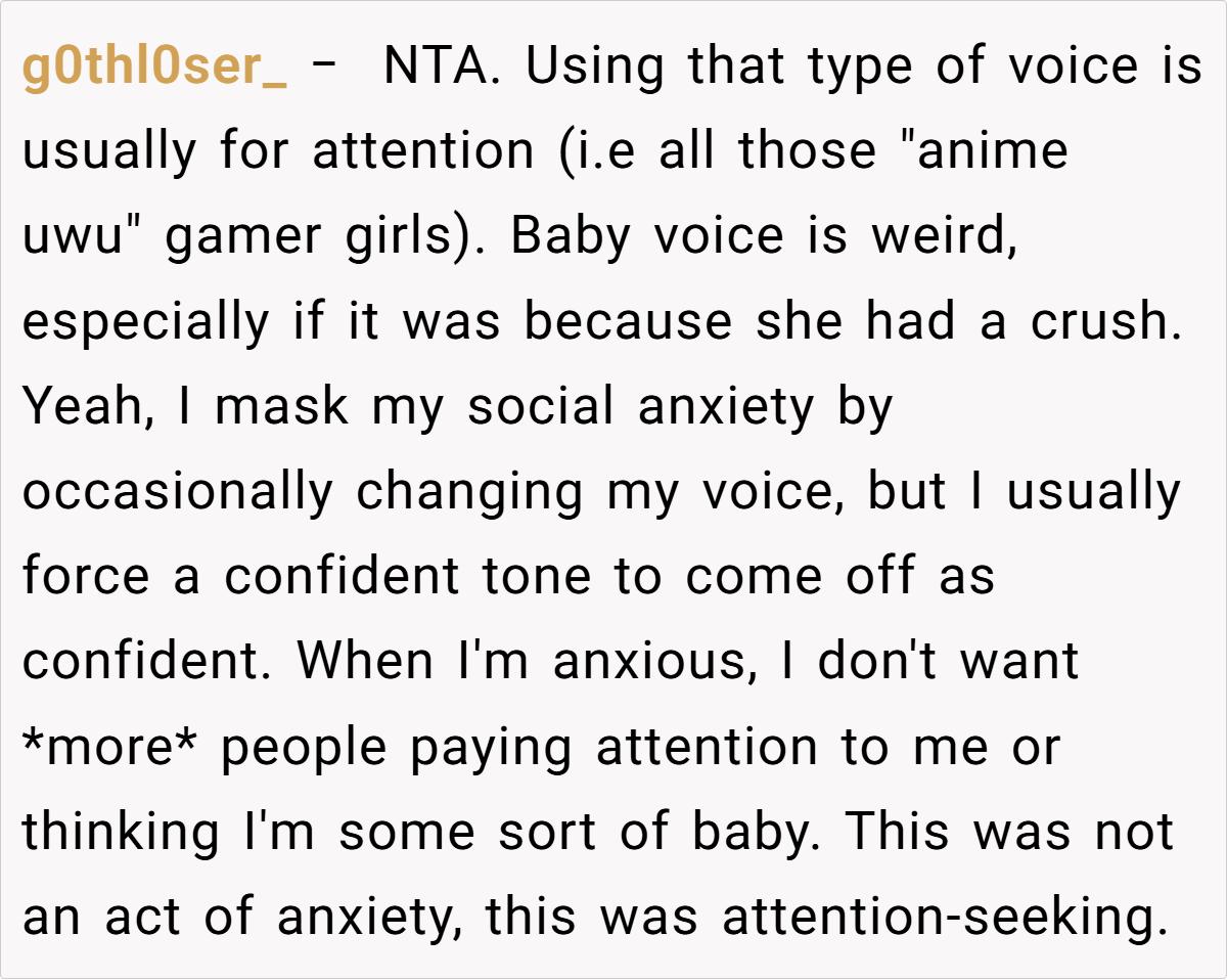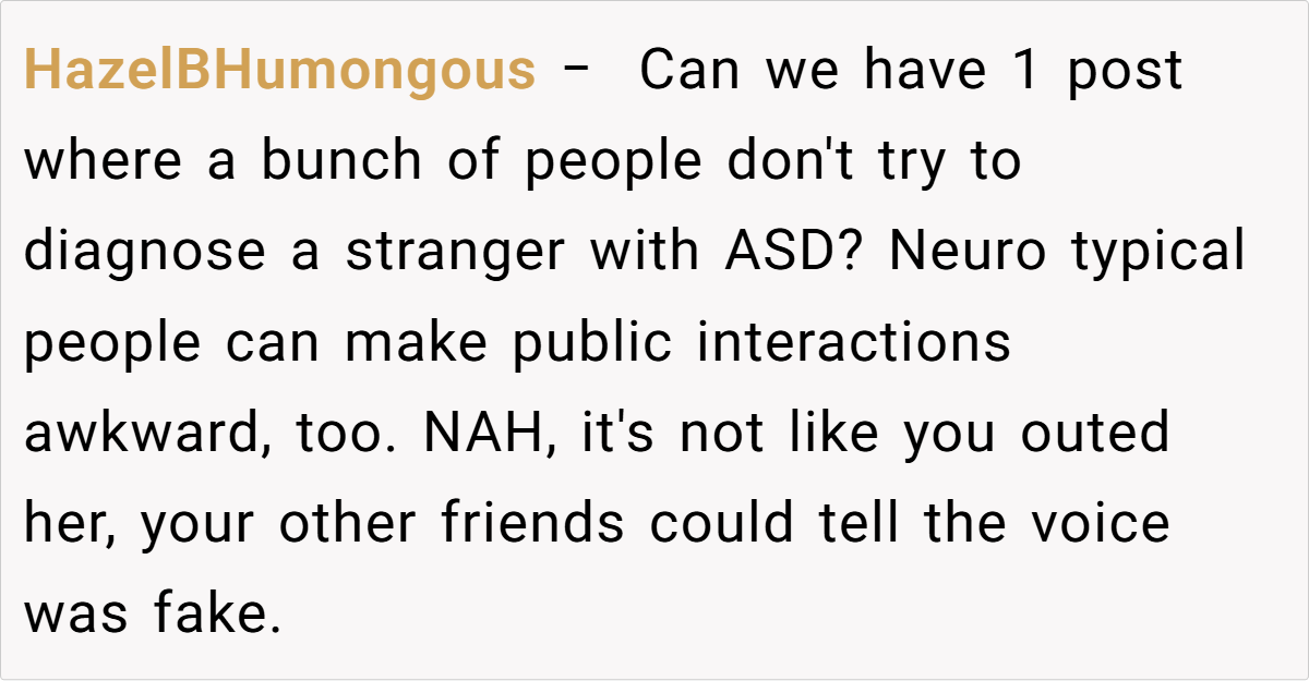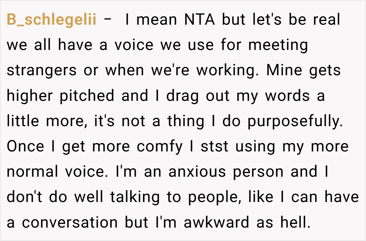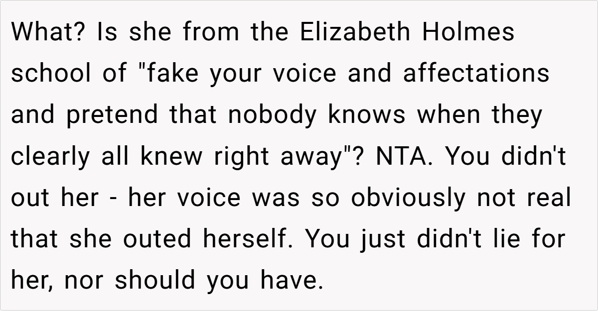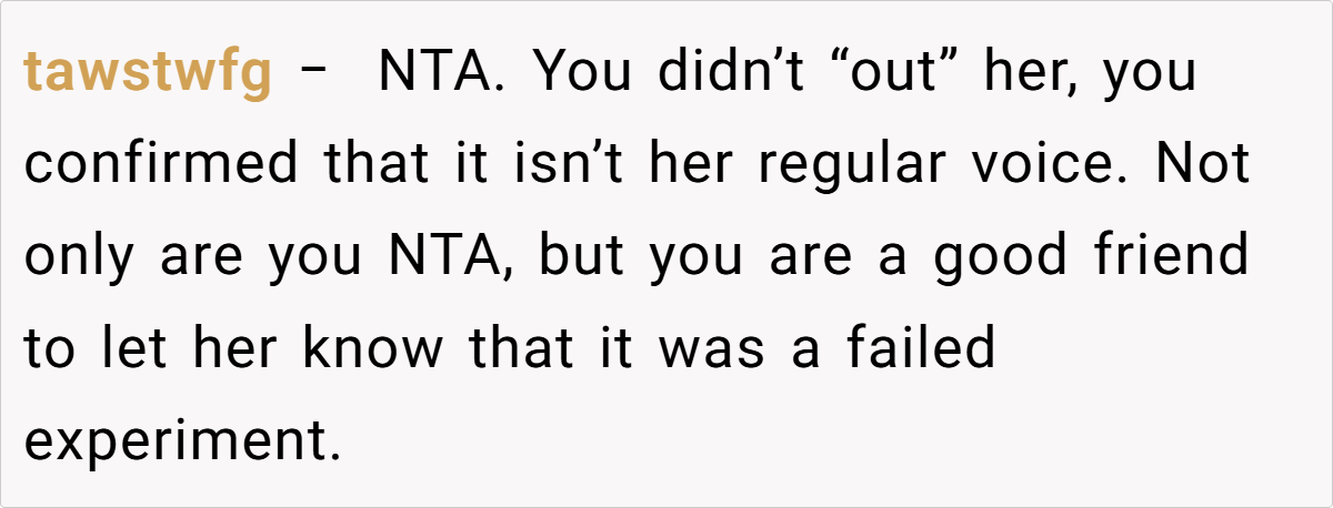 In the end, the incident isn’t about accusing someone of dishonesty but rather about understanding and managing social anxiety. The OP’s effort to point out the discrepancy in her friend’s voice may have been well-intentioned, yet the manner in which it was done has clearly hurt her friend.