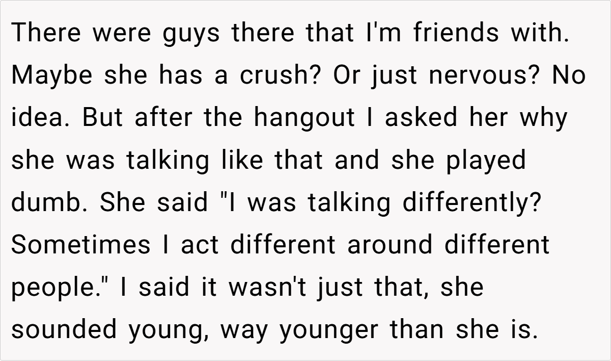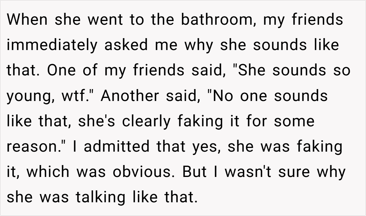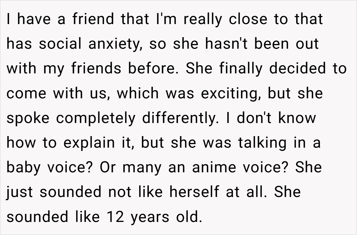 In this case, the friend’s unexpected change in voice may have been her way of feeling less vulnerable in an unfamiliar group setting. Rather than a deliberate act of deception, such a vocal adjustment is a common strategy for those struggling to fit in or ease social pressure.