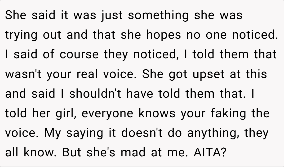 ‘AITA for outing my friend that her baby voice isn’t her normal voice?’