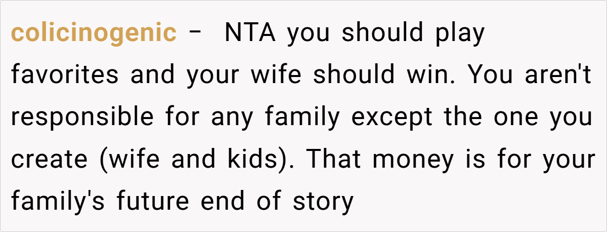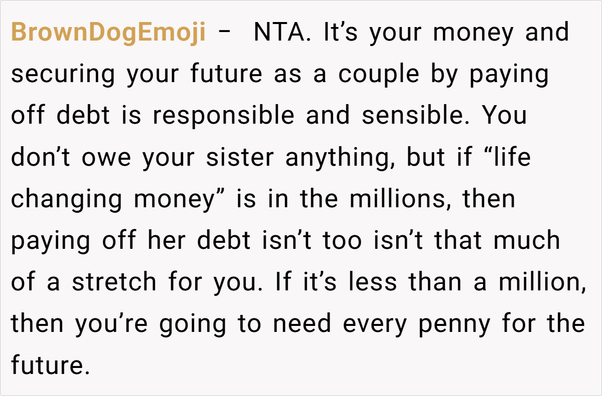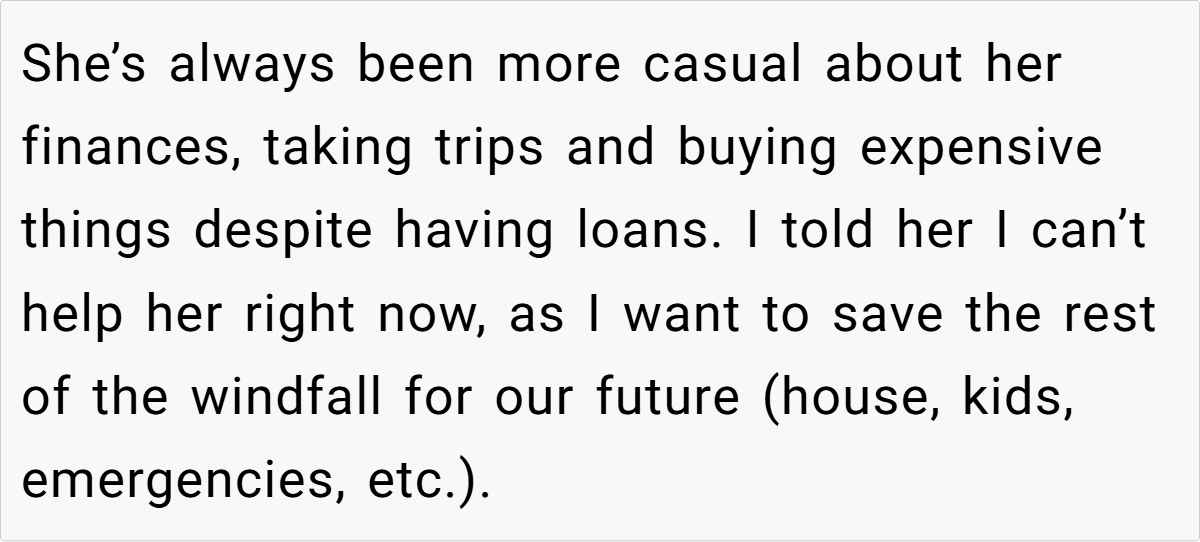 Many redditors applaud OP for his clarity, with one commenter noting, “If you’ve made it clear that your future is off-limits, you shouldn’t have to subsidize someone else’s financial irresponsibility.” Another user remarked, “Family help is great until it undermines your own dreams; your wife’s future comes first.” A third pointed out, “Your sister can learn to manage her money. Your windfall isn’t a free-for-all family pot.” Finally, another redditor added, “Sometimes you have to draw a line in the sand—even if it means ruffling some family feathers.”