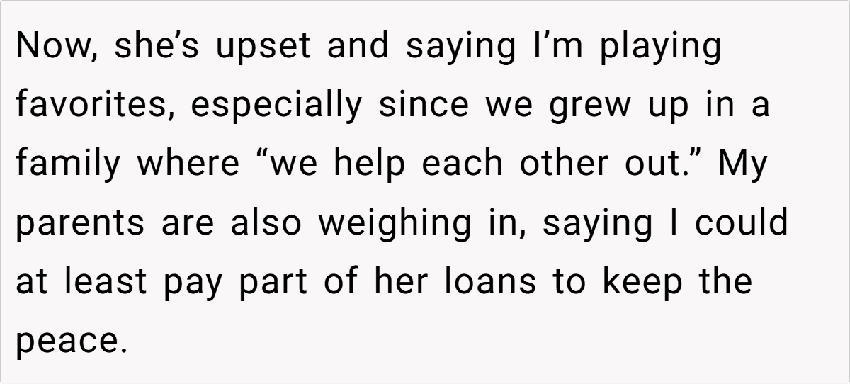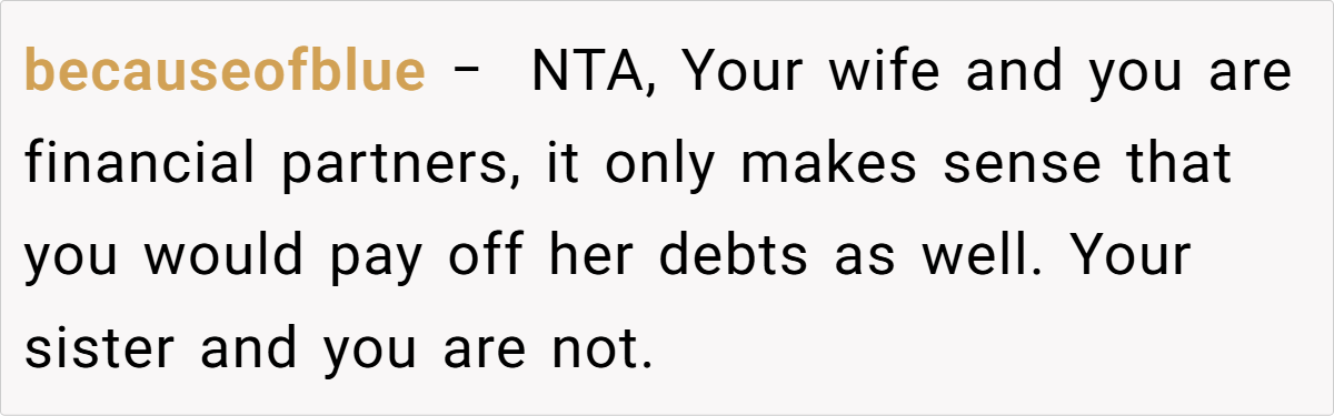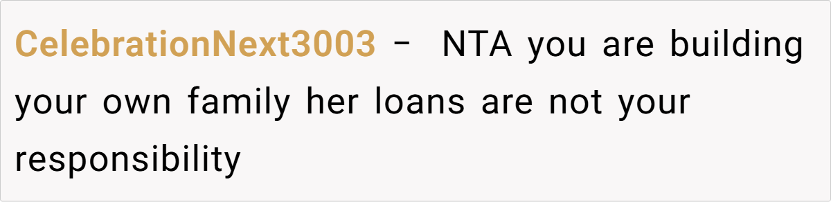 Family therapist Dr. Susan Johnson adds, “When it comes to financial support, it’s important to differentiate between shared responsibilities and individual priorities. Expecting one to subsidize another’s lifestyle can lead to long‑term resentment.” In this scenario, OP views his sister’s student debt as her responsibility, particularly given her casual attitude toward money. His focus remains on ensuring a secure future for his wife and child—a stance supported by his clear pre‑marital discussions about finances.