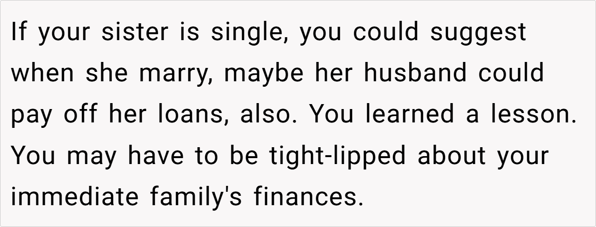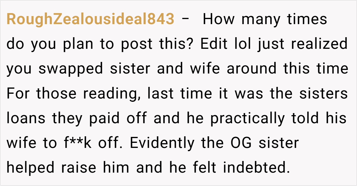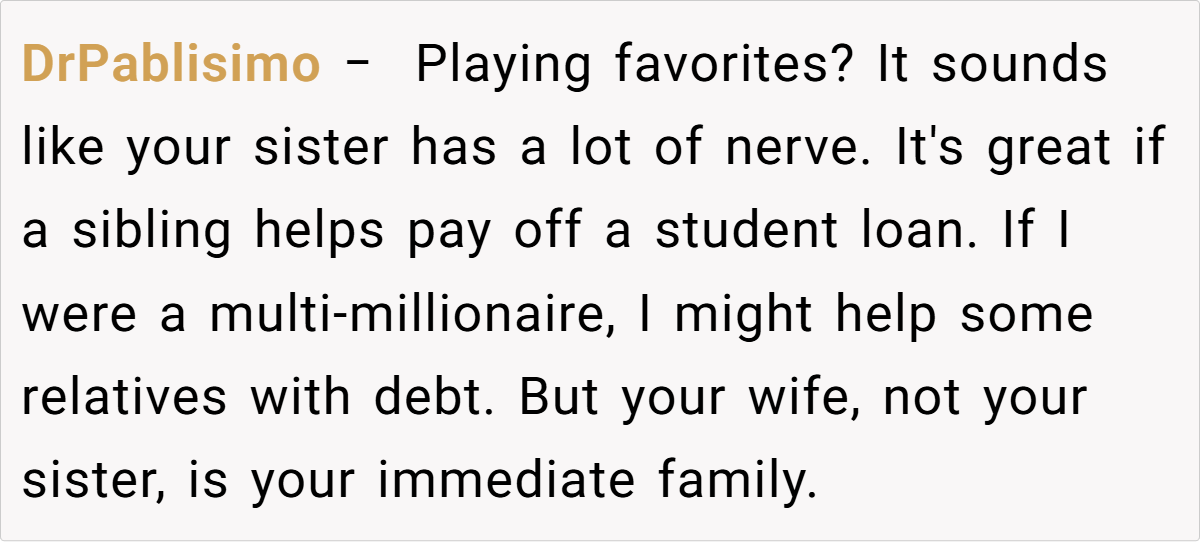In conclusion, our OP’s decision to pay off his wife’s student loans while refusing to help his sister reflects his commitment to securing his family’s future—a boundary he set long before his sister’s request came into play. While some may view this as playing favorites, many agree that financial priorities in a marriage should be clear from the start.