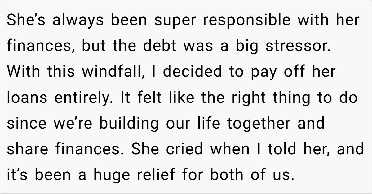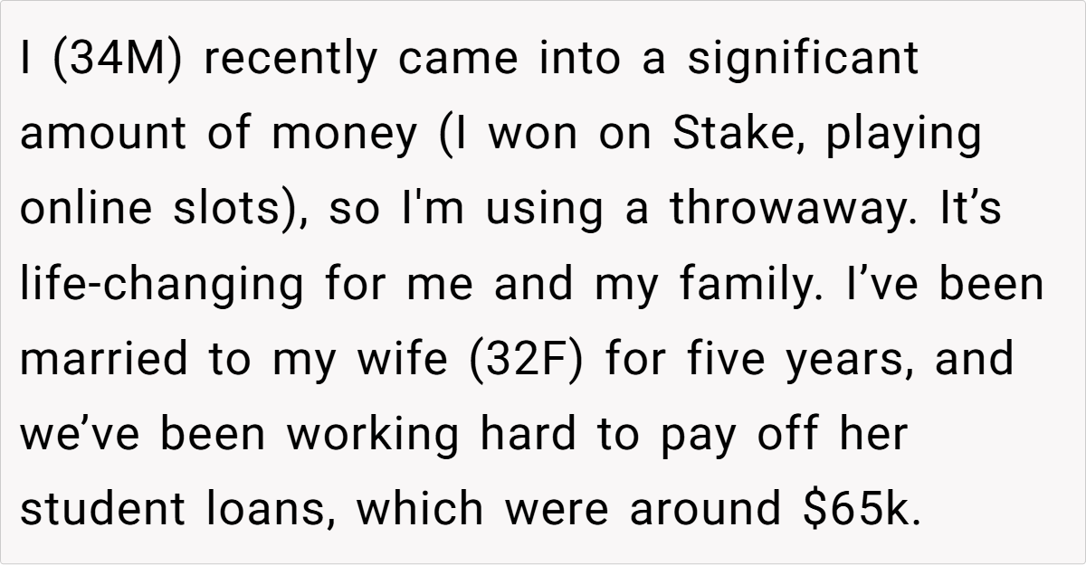 When a windfall offers a chance to rewrite your financial future, tough decisions inevitably follow. Our OP, a 34‑year‑old man, recently scored big from online slots and decided to use the windfall to pay off his wife’s hefty $65K student loans—a move that brought tears of relief and set a promising tone for their shared future. However, the plot thickened when his sister, who carries about $50K in student debt, asked for similar help. Raised in a family where “we help each other out” is the norm, this request sparked a heated debate over priorities and fairness.