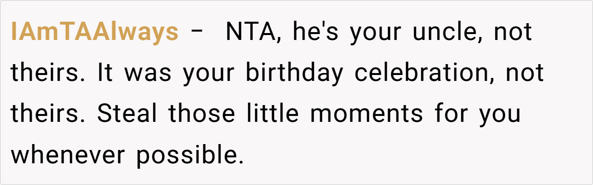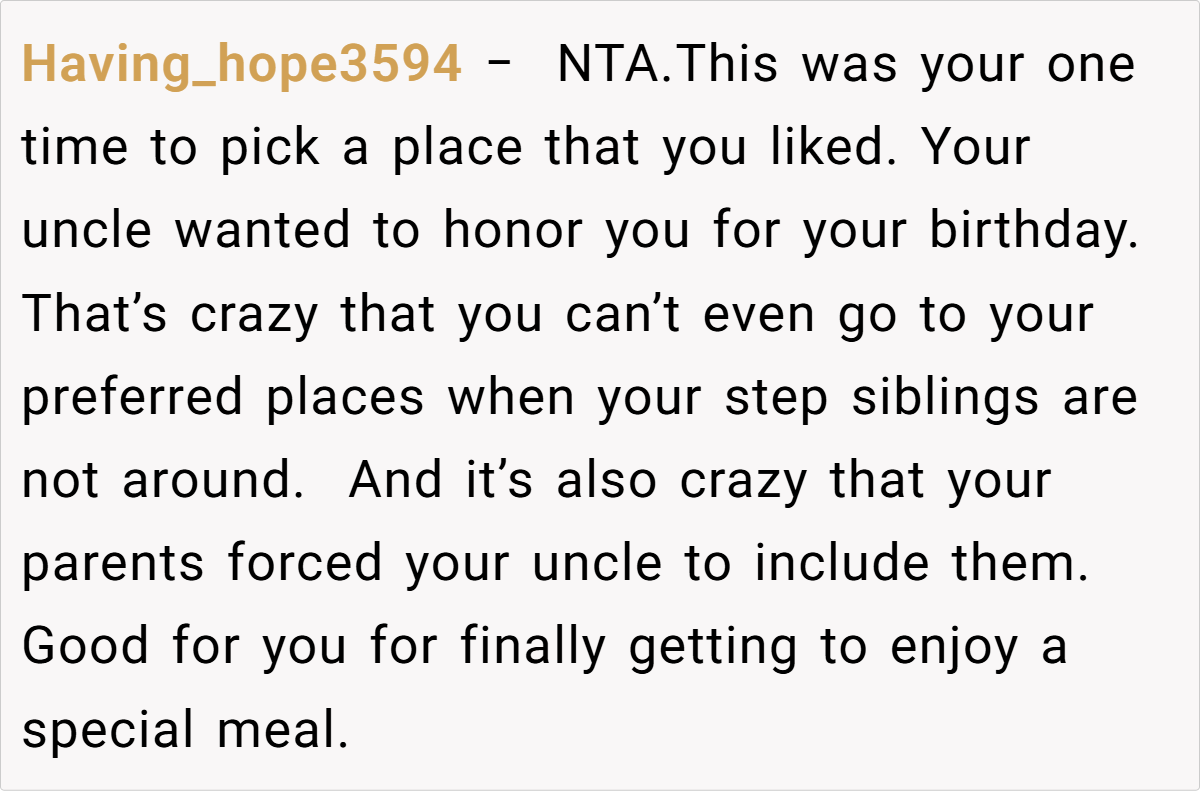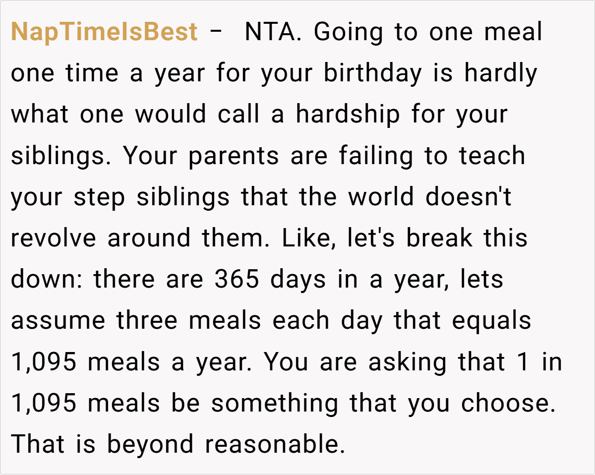 Many people in the Reddit community have expressed sympathy and support for your decision in this situation. They believe that you have the right to choose your favorite restaurant, especially on your birthday, and that it is unfair that you cannot do so for a long time. Some people have emphasized that it is unfair that you cannot choose your favorite restaurant for a long time. They encourage you to take advantage of such moments to reward yourself.