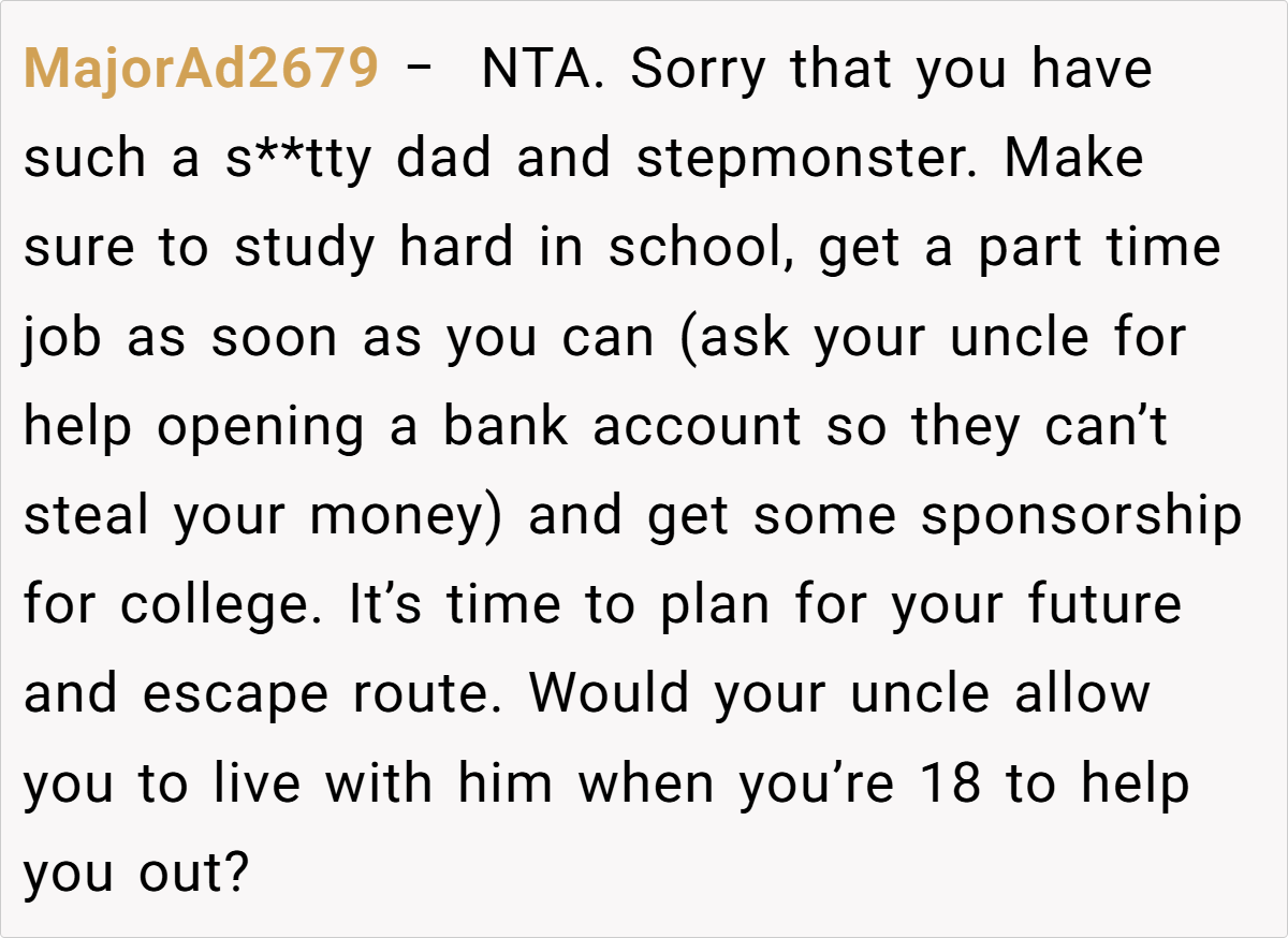 It’s not your step-siblings fault, though. There was literally nothing they eat there? Nothing they could drink? No snacks that could have been picked up ahead of time and taken there for them? How would you feel if the situation was reversed. Yeah, I think you were an AH to your step-siblings because you took out your resentment against your folks on them. The greater AHs, however, are your father and stepmother. You shouldn’t have to always be the one who never gets their way.
