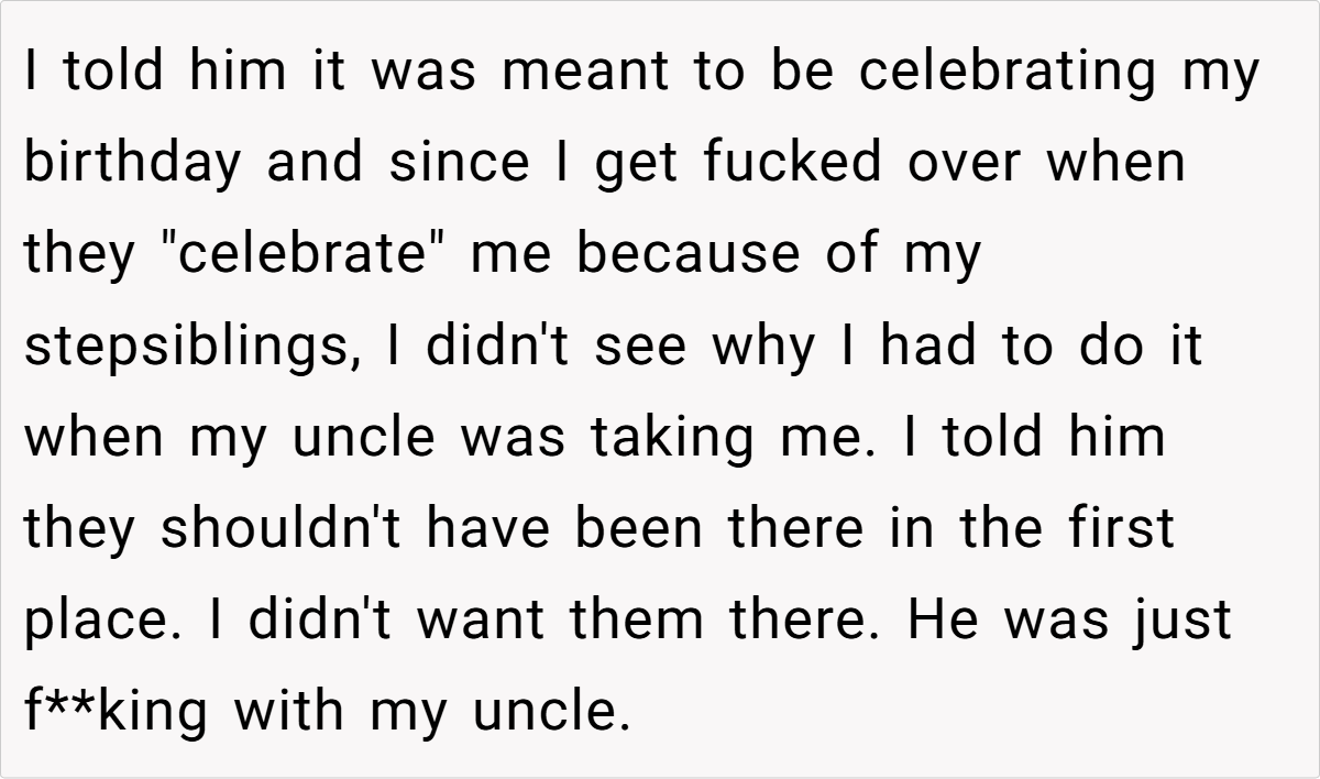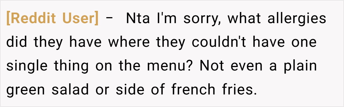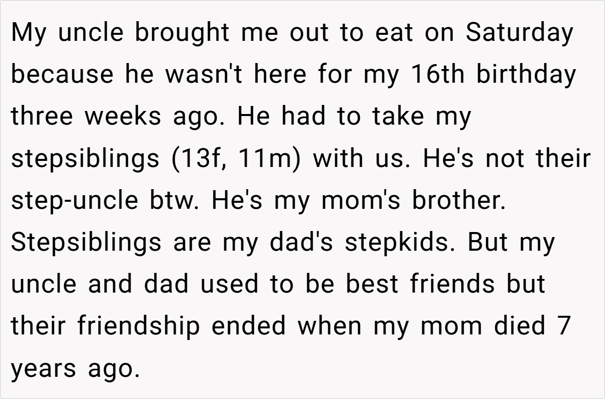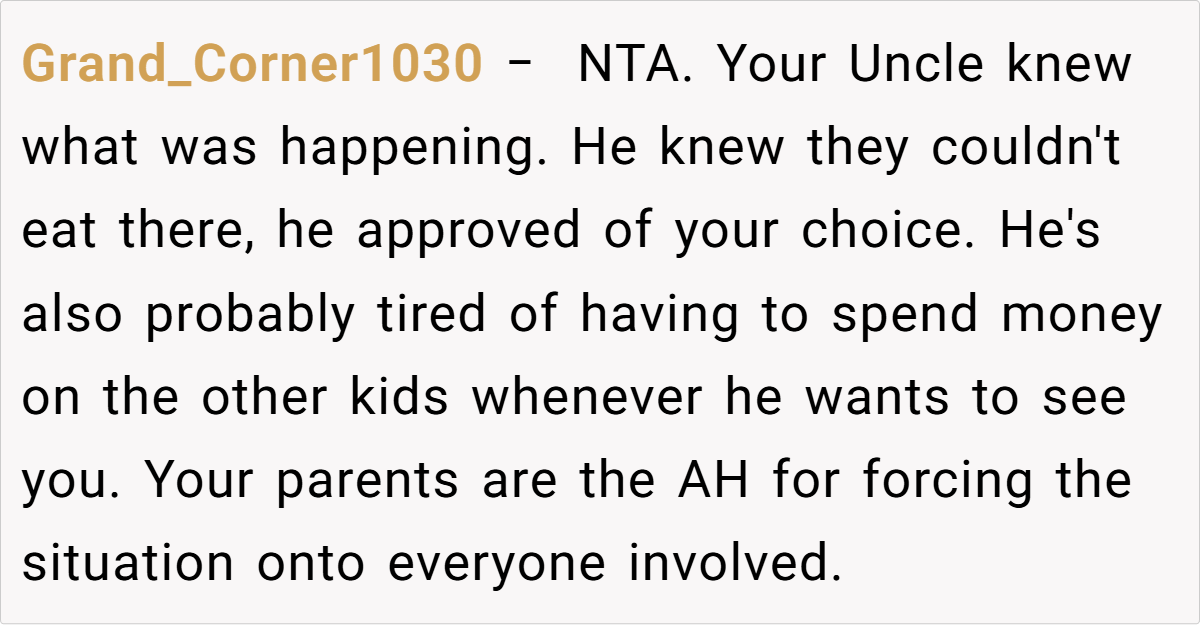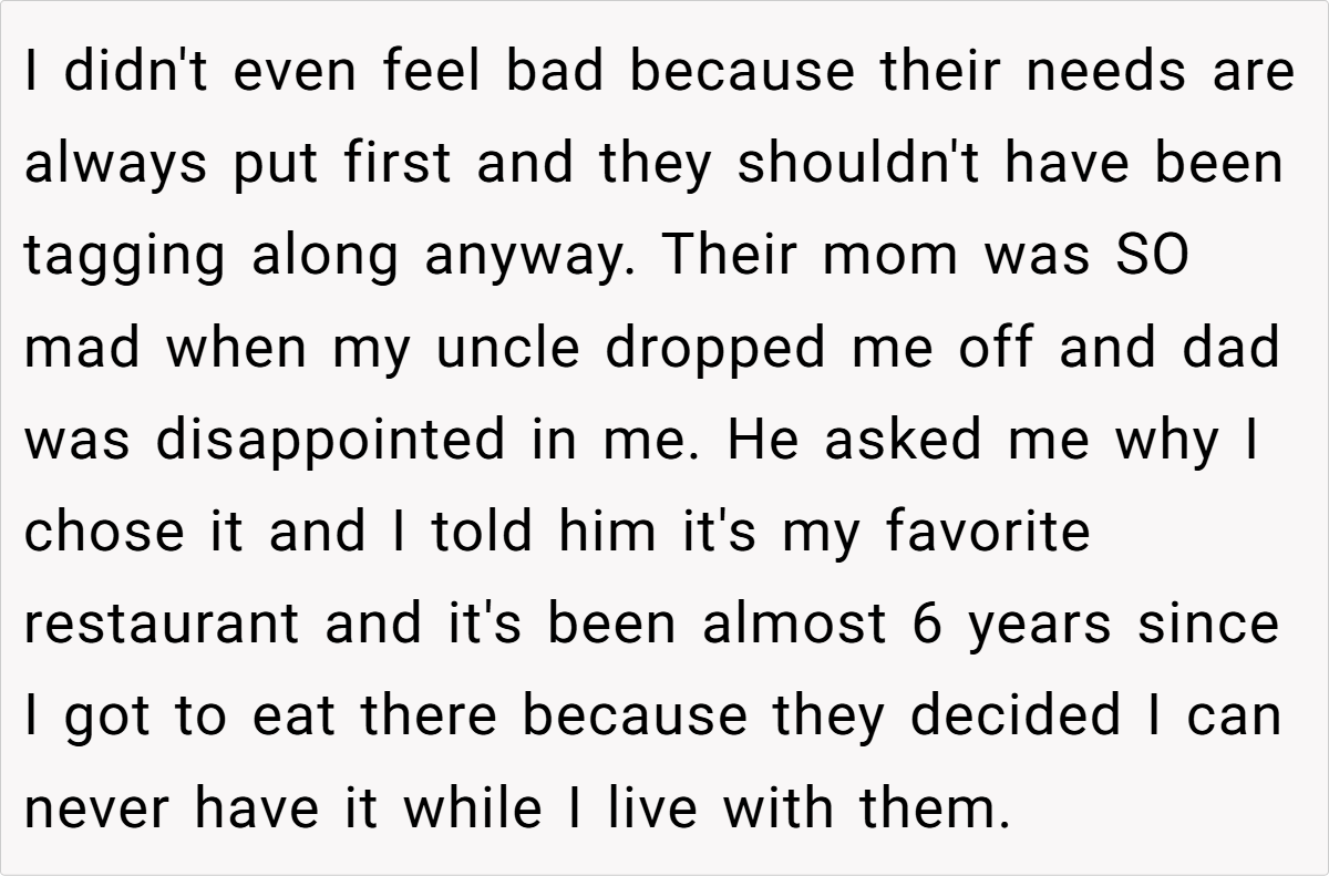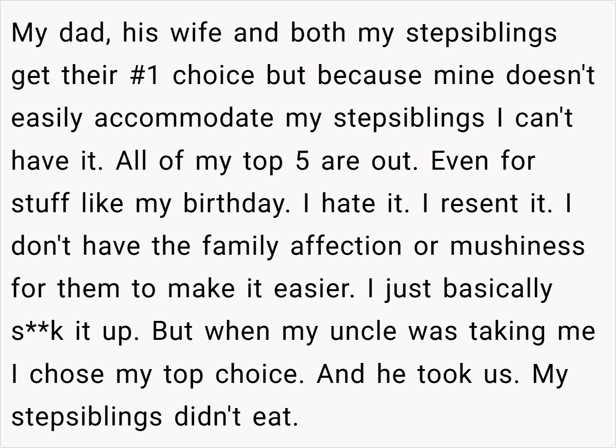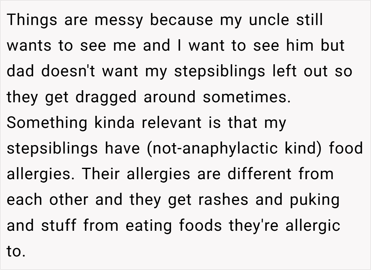 A Reddit user is grappling with family dynamics after choosing a restaurant for a birthday celebration with her uncle that her stepsiblings couldn’t eat at. After years of accommodating her stepsiblings’ food allergies, which often dictated family dining choices, she finally opted for her favorite place when given the chance.