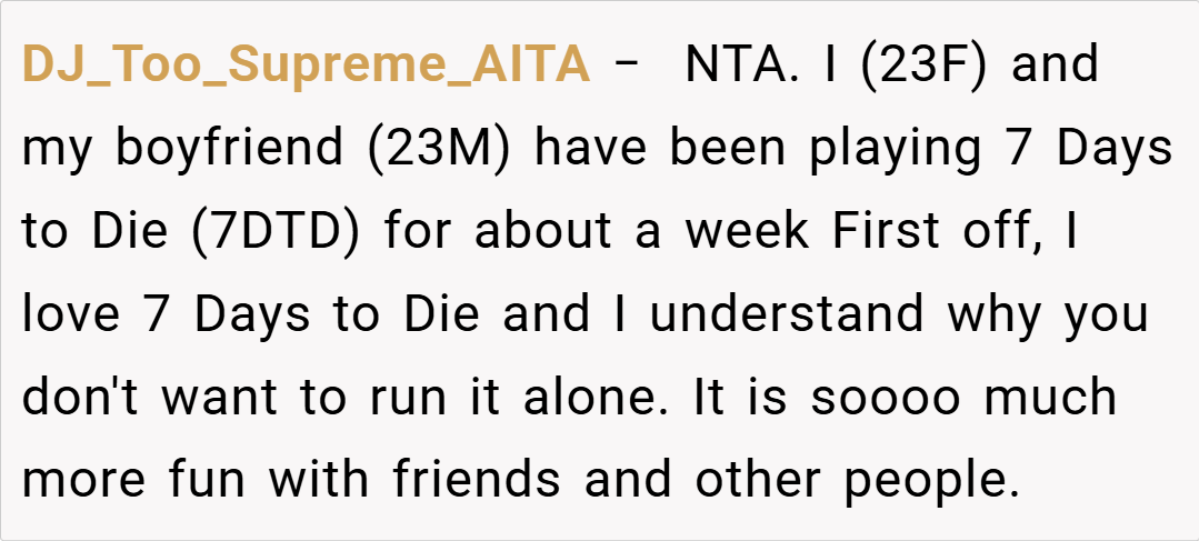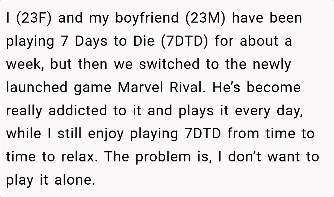 Sometimes gaming isn’t just a way to relax—it’s a shared activity that helps keep a relationship connected. I (23F) have been playing 7 Days to Die (7DTD) with my boyfriend (23M) for about a week, a game that I genuinely enjoy for its relaxed pace and creativity. However, since his interest shifted to the newly launched Marvel Rival, which he now plays every day, I’ve found myself frequently left to play 7DTD on my own.