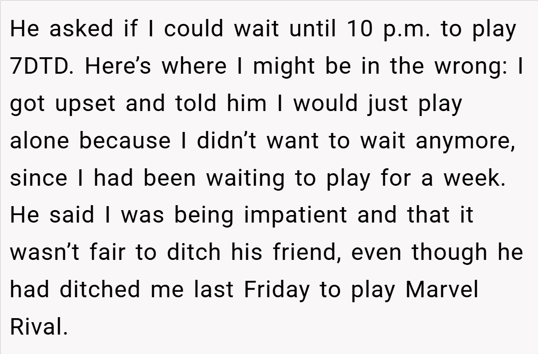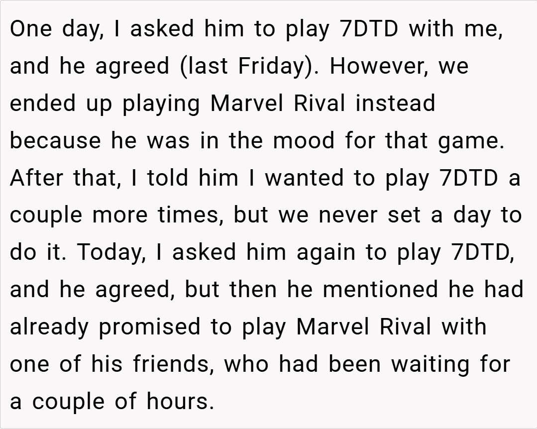 I value our gaming time together, and after waiting for days to set aside a slot for 7DTD, I grew frustrated when he later asked me to wait until 10 p.m. because he had already promised Marvel Rival time with a friend who’d been waiting for hours.