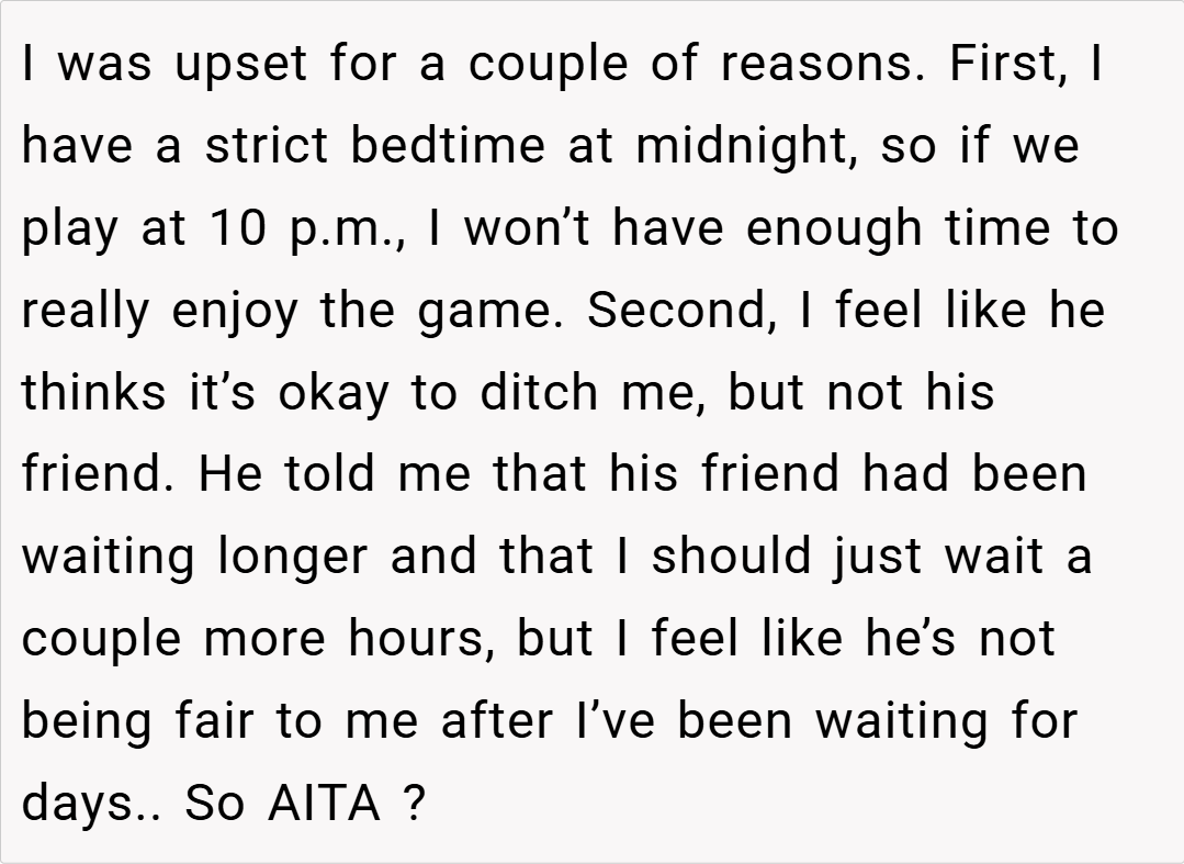 Several redditors expressed strong support for your decision. One user commented, “If you’ve been waiting for days and have a strict bedtime, you’re not the asshole for opting to play alone. Your time is valuable, too.”
