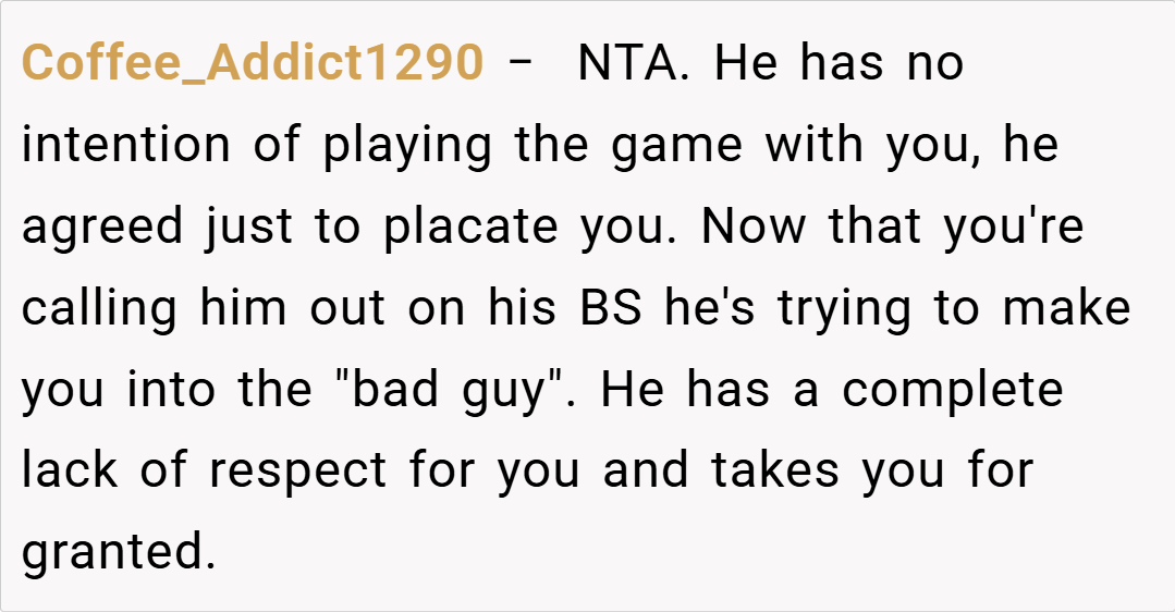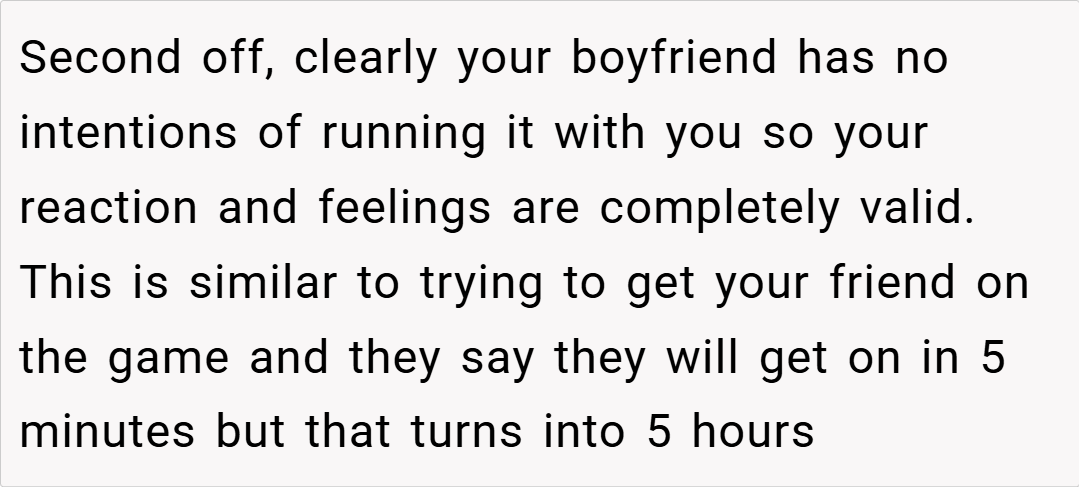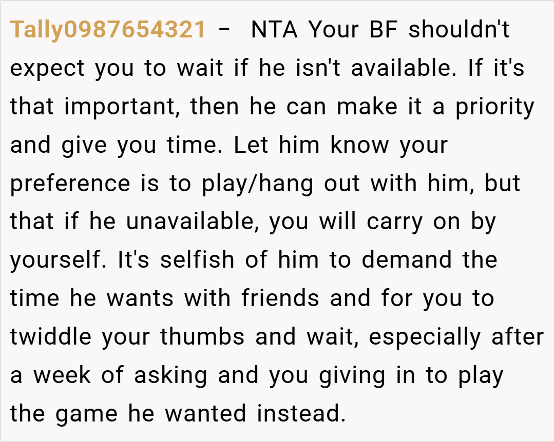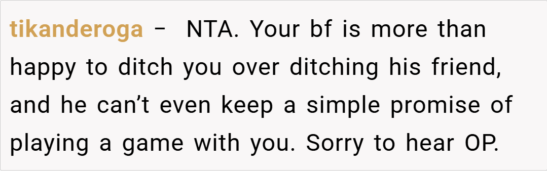 Another shared, “It sounds like your boyfriend’s been inconsistent about prioritizing your gaming time. Sometimes tough love means insisting on respect for your schedule. You’re justified in feeling upset if he ditched you before.”