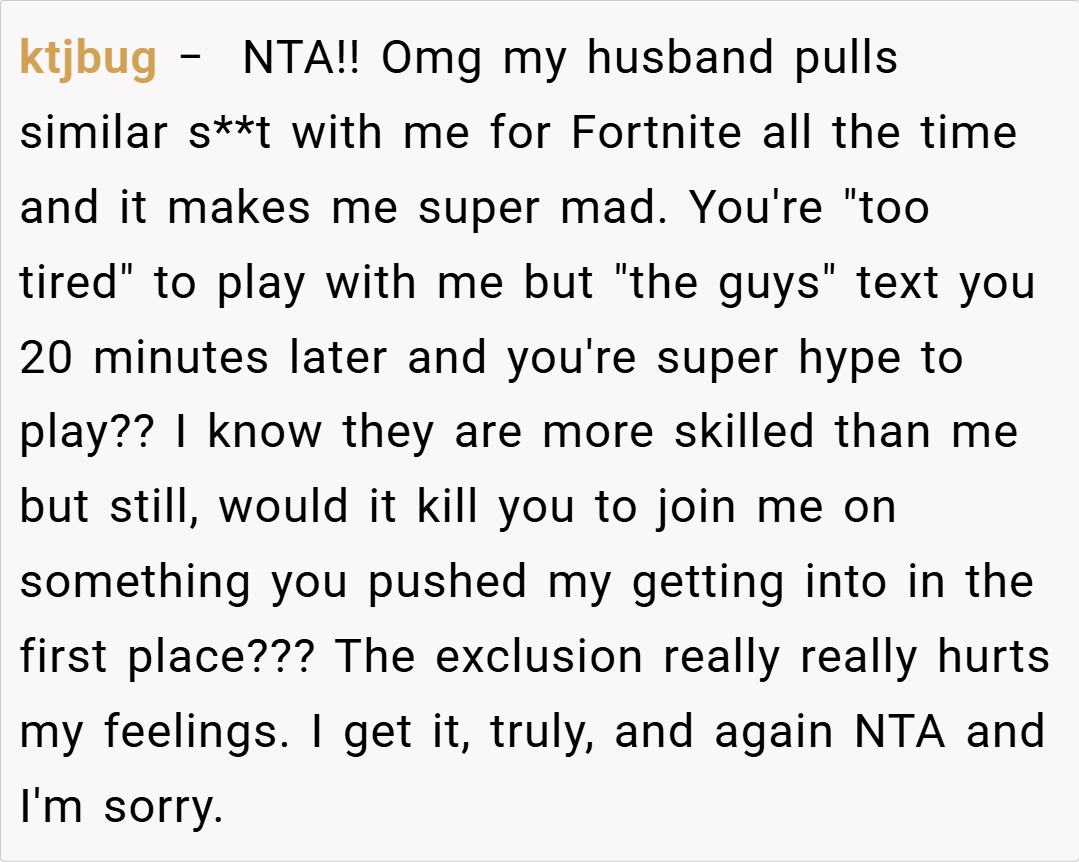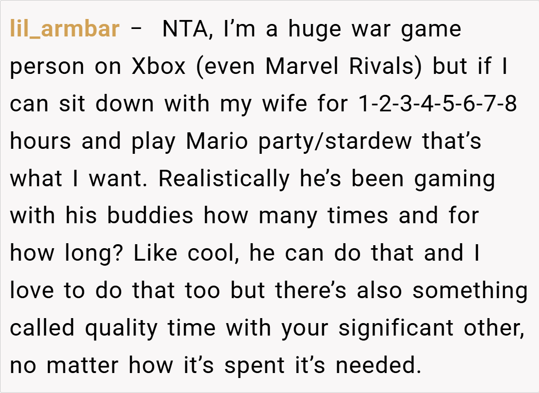 She adds, “In this situation, your frustration is valid—especially when clear communication about expectations hasn’t translated into reliable shared time. Your decision to play alone is a form of setting boundaries that protect your own enjoyment and schedule. However, it could be beneficial to revisit these conversations calmly to reach a compromise that works for both of you.”