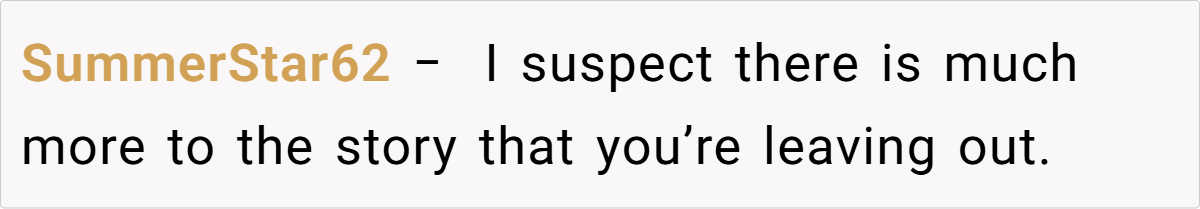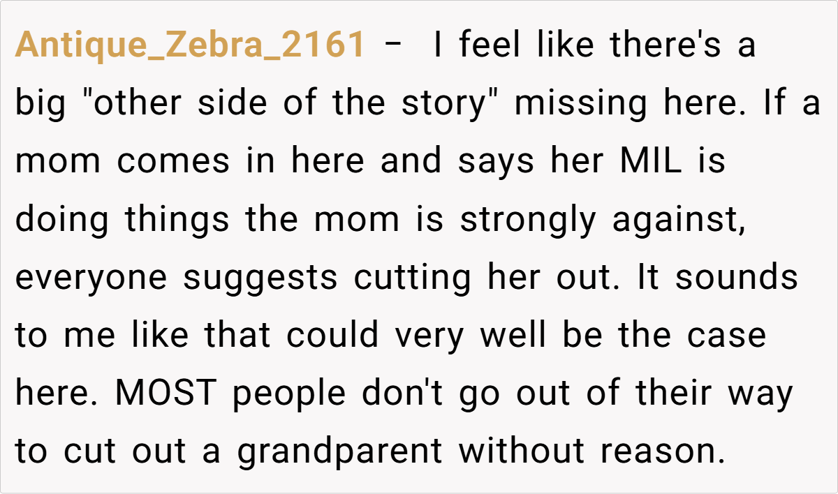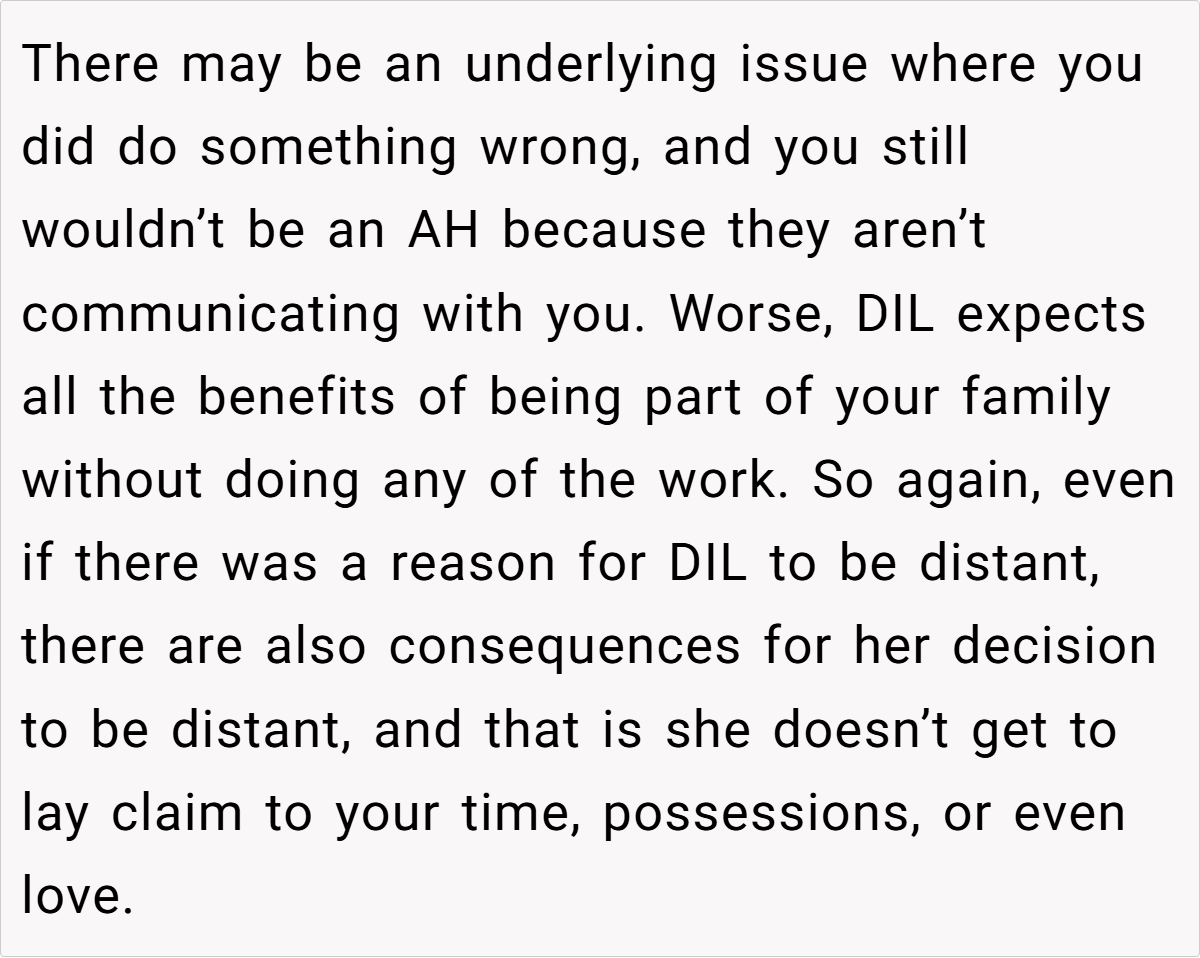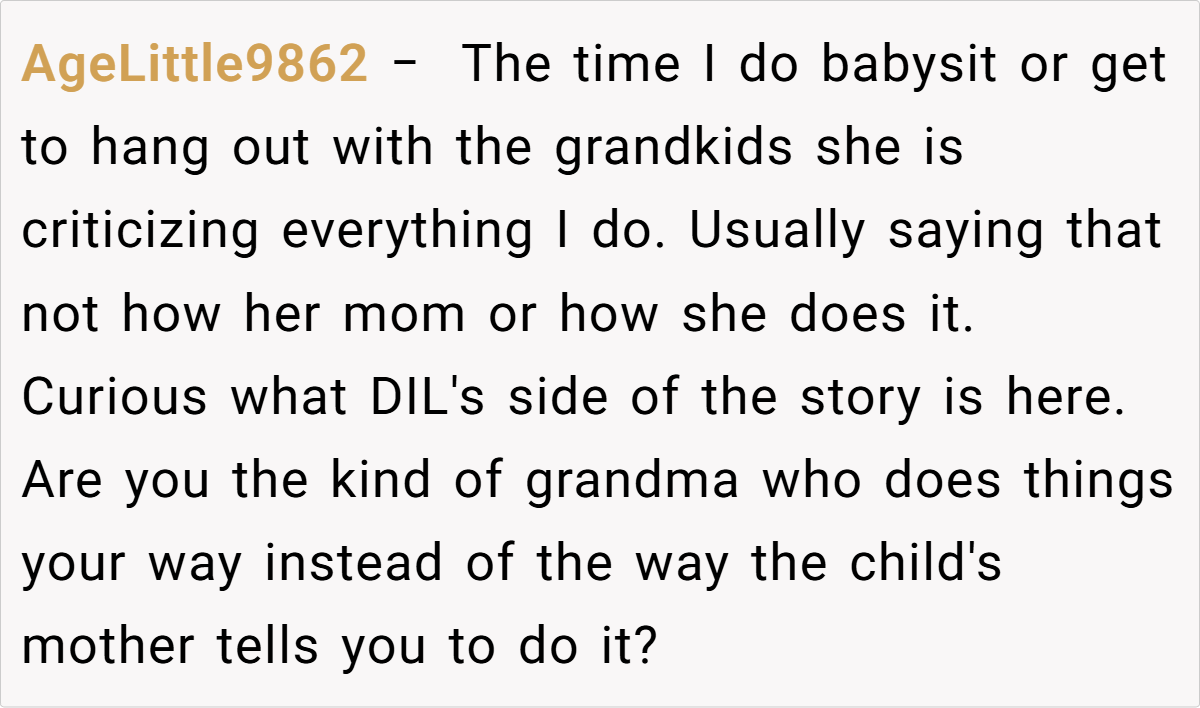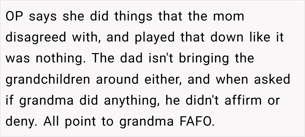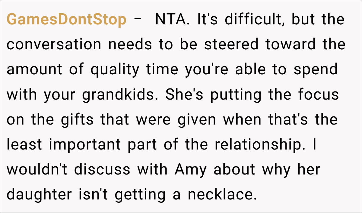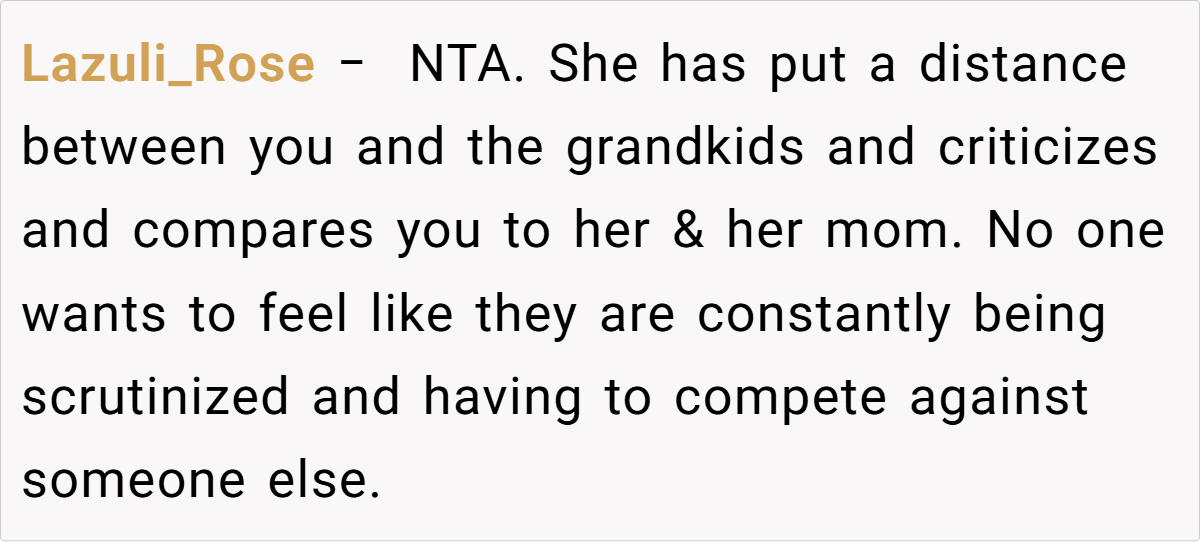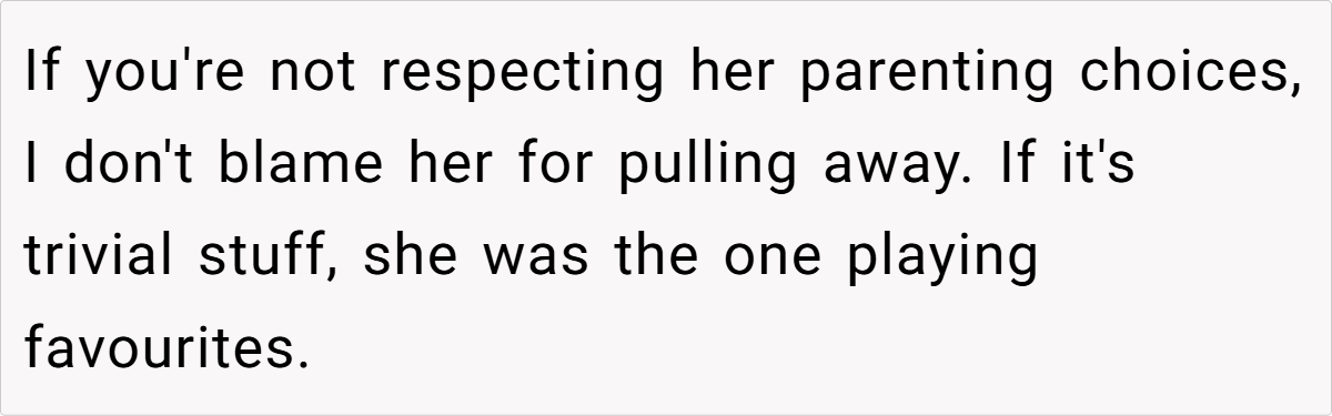 Community reactions are mixed. Some feel the grandmother is justified, arguing that her response is a natural outcome of feeling consistently criticized and sidelined. Others believe she should have handled the situation differently, suggesting that favoritism—real or perceived—can fracture family bonds further. Many agree that both sides could benefit from open, honest communication and possibly family counseling to bridge their differences.
