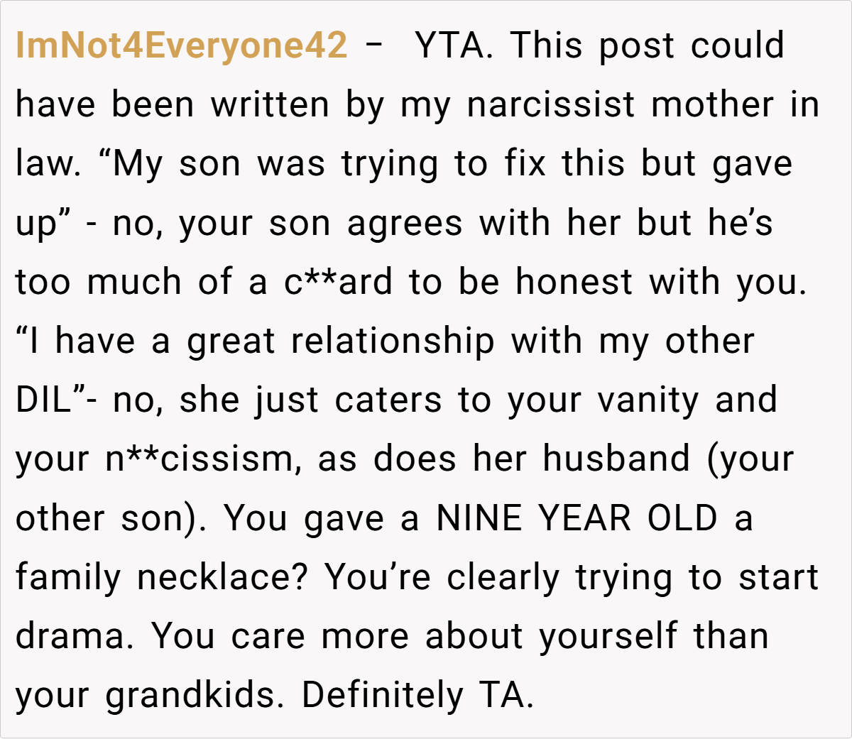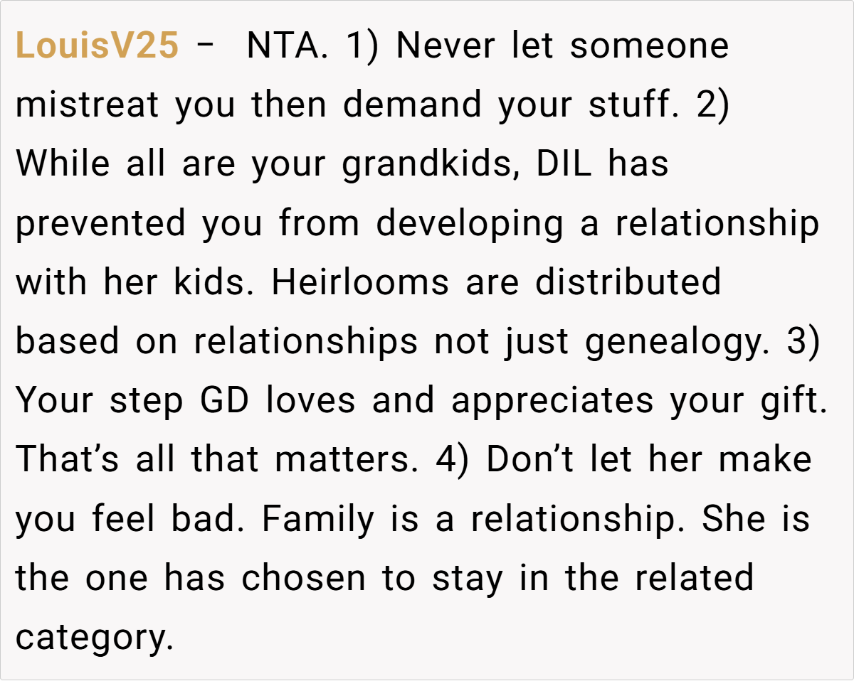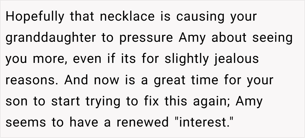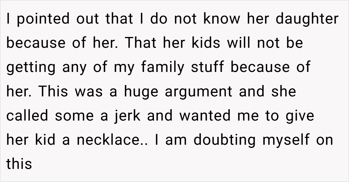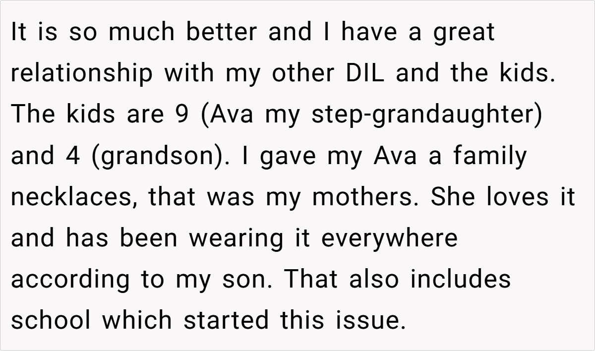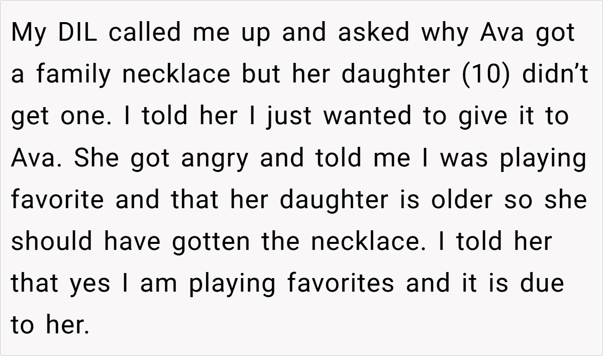 Feeling increasingly unappreciated and pushed aside, she eventually reached a breaking point. When she gifted a cherished family necklace—an heirloom passed down from her mother—to her step-granddaughter, her daughter-in-law exploded, accusing her of favoritism. In response, the grandmother bluntly stated that her actions were a direct result of the strained relationship, leaving everyone to wonder: Is she in the wrong for setting these boundaries, or is her frustration justified?