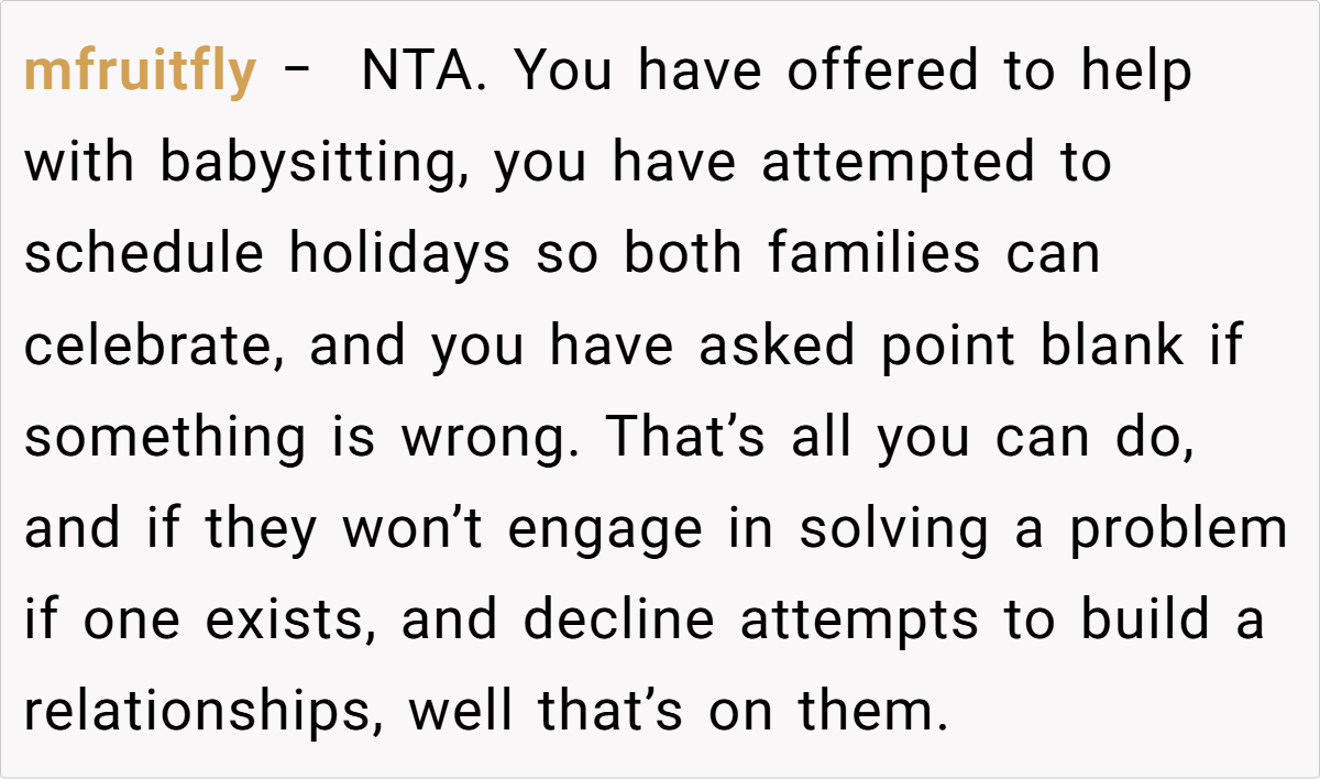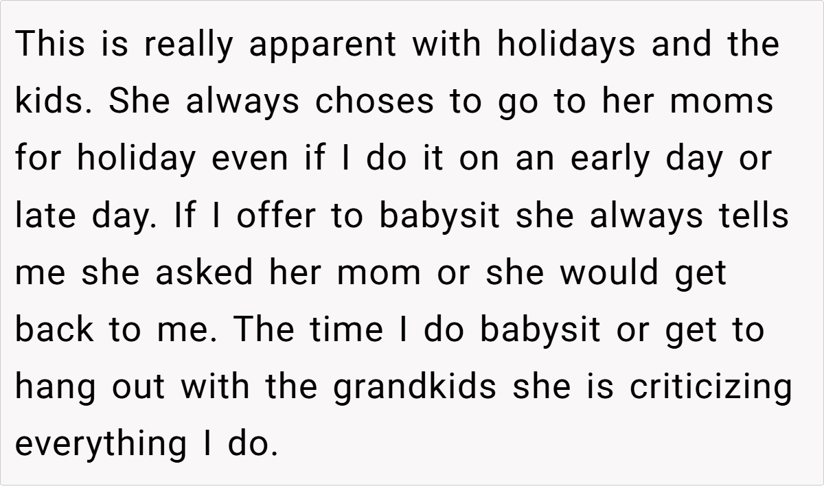 Despite her initial efforts to build a good rapport with her daughter-in-law, ongoing conflicts and subtle criticisms left her feeling sidelined. The tension became particularly evident during holiday gatherings and routine babysitting, where her contributions were constantly compared to those of her daughter-in-law’s family.