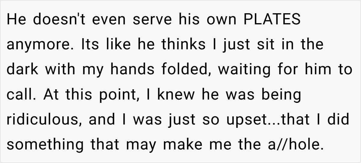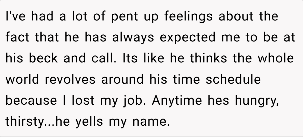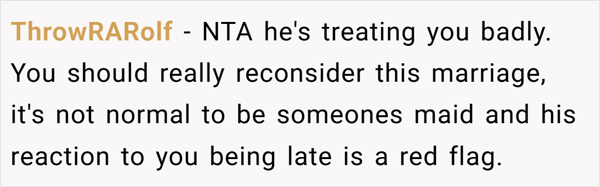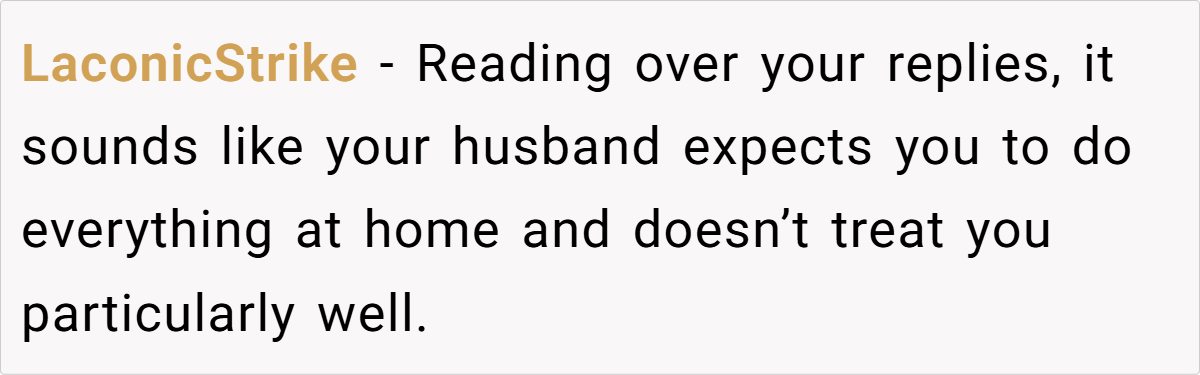 For OP, this dynamic is clear—her husband has positioned himself as the dominant decision-maker, expecting her to cater to his every whim. This isn’t a balanced partnership; it’s control disguised as routine.