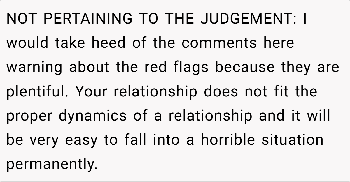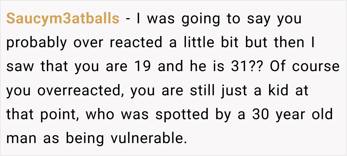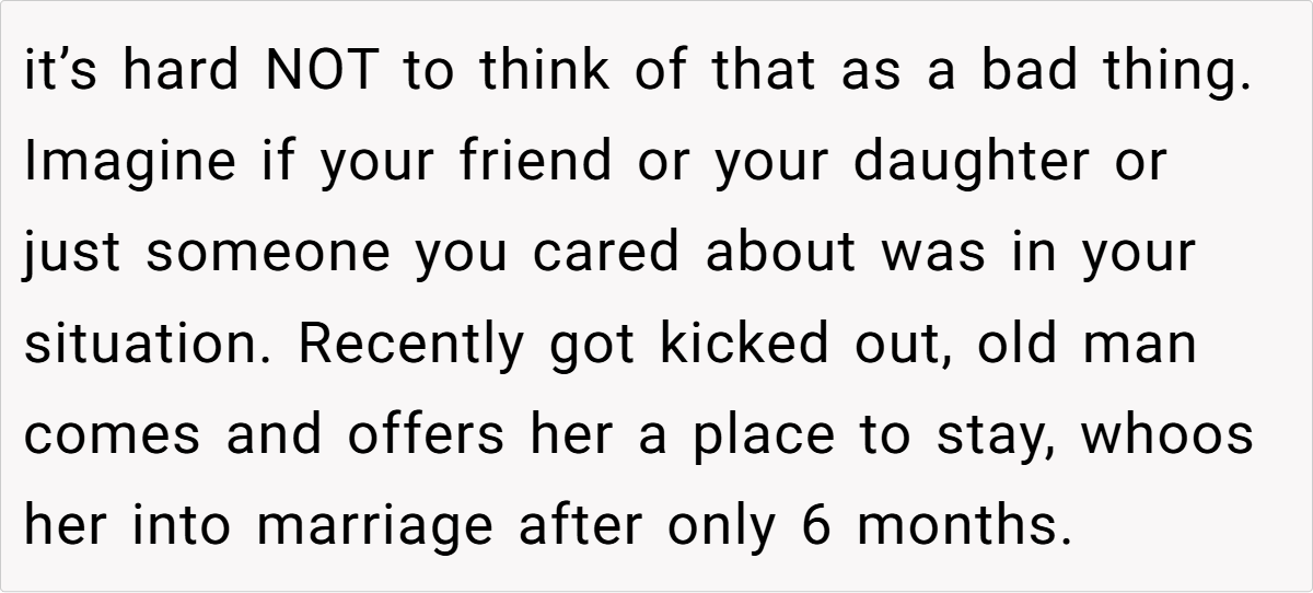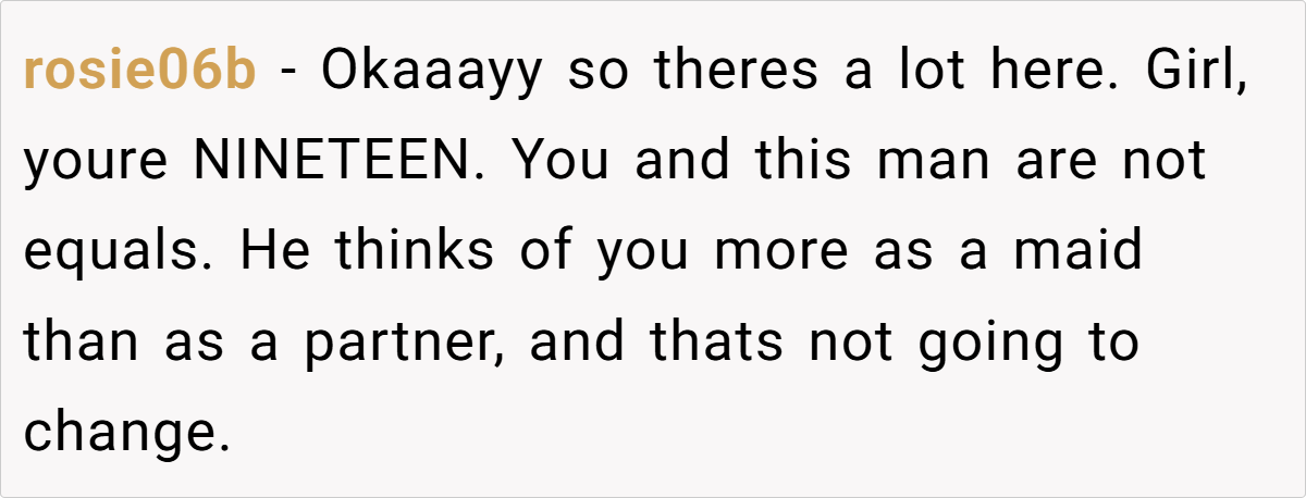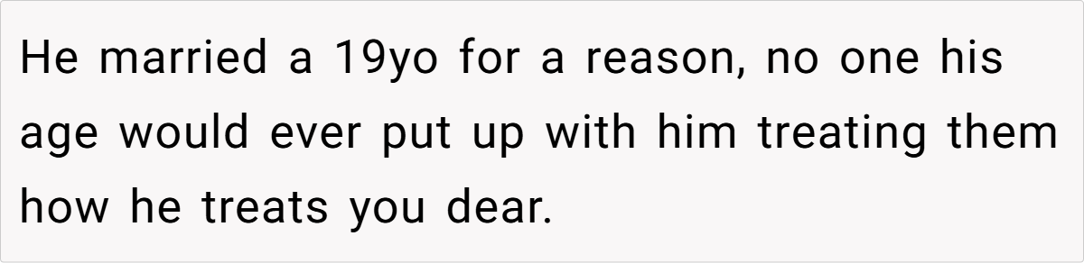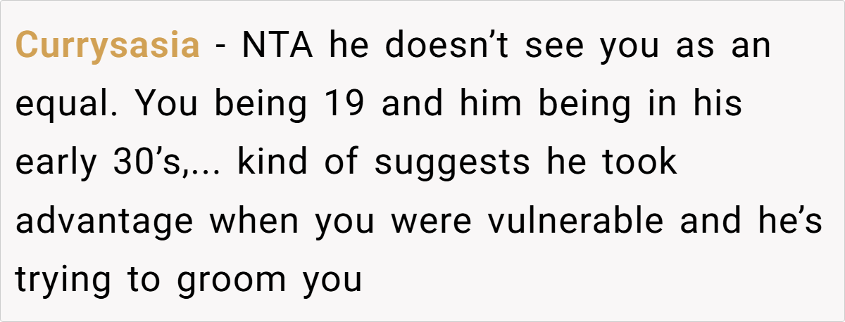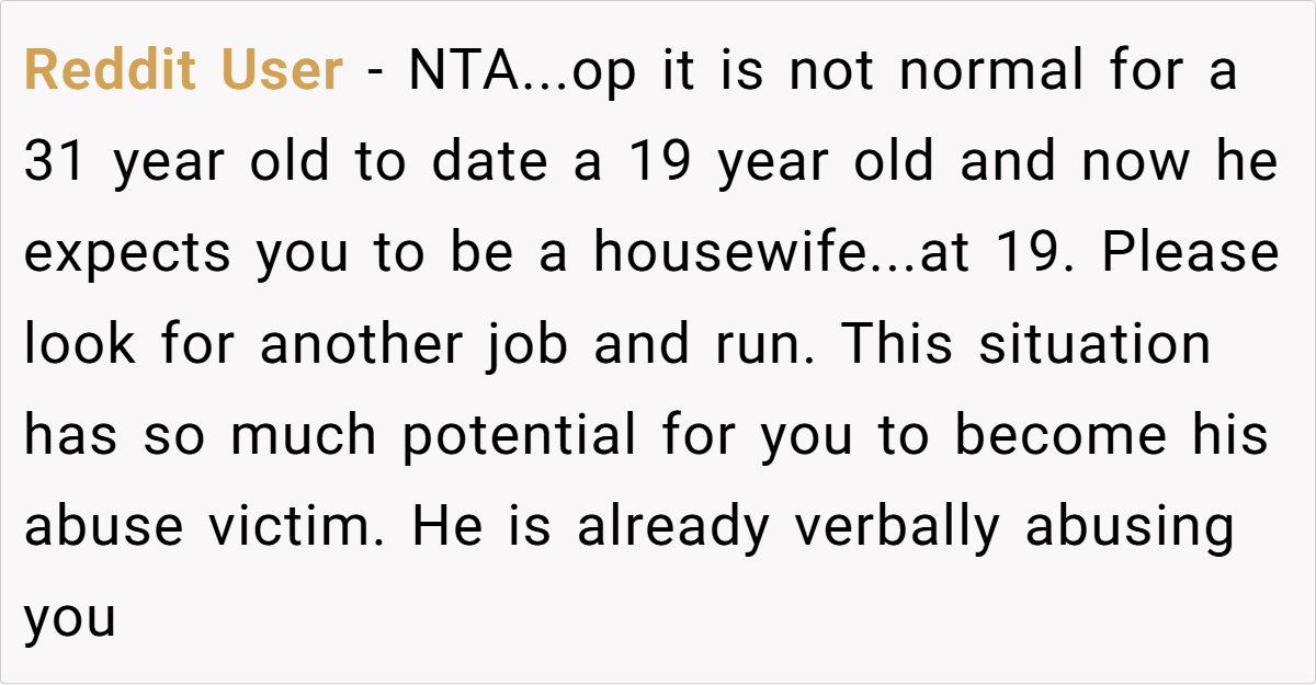 A key concern that many Redditors raised was OP’s age. She is 19, while her husband is 31. While age gaps alone aren’t necessarily an issue, they can create imbalances in life experience, financial power, and emotional maturity.