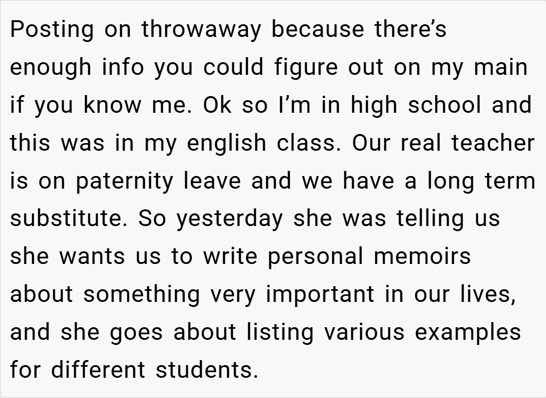 In the quiet confines of a high school English classroom, what started as a routine writing assignment quickly transformed into an unexpected lesson about privacy, assumptions, and the delicate nature of discussing personal matters in public settings. A substitute teacher’s well-intentioned but misguided attempt to engage students in memoir writing led to a memorable encounter that has sparked discussions about boundaries and respect in educational settings.