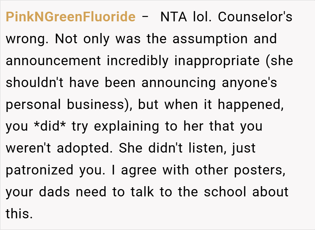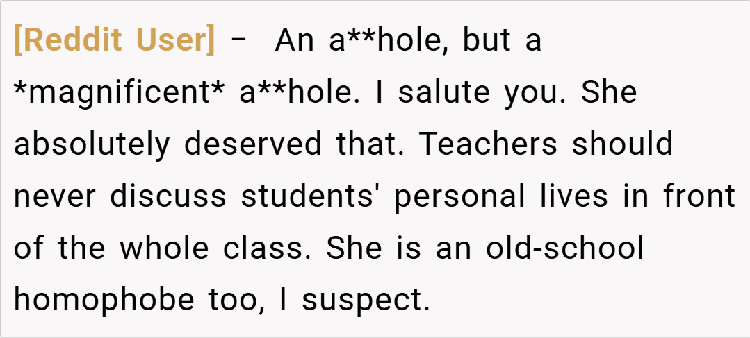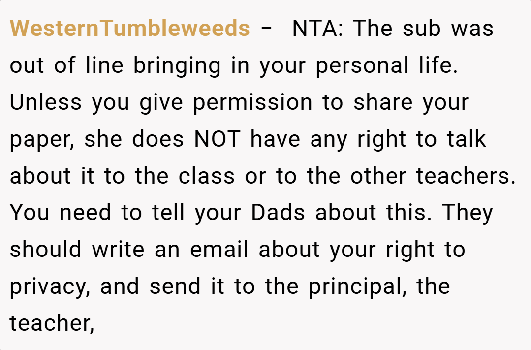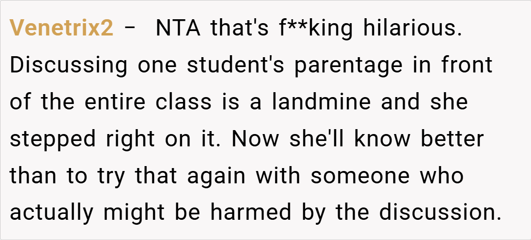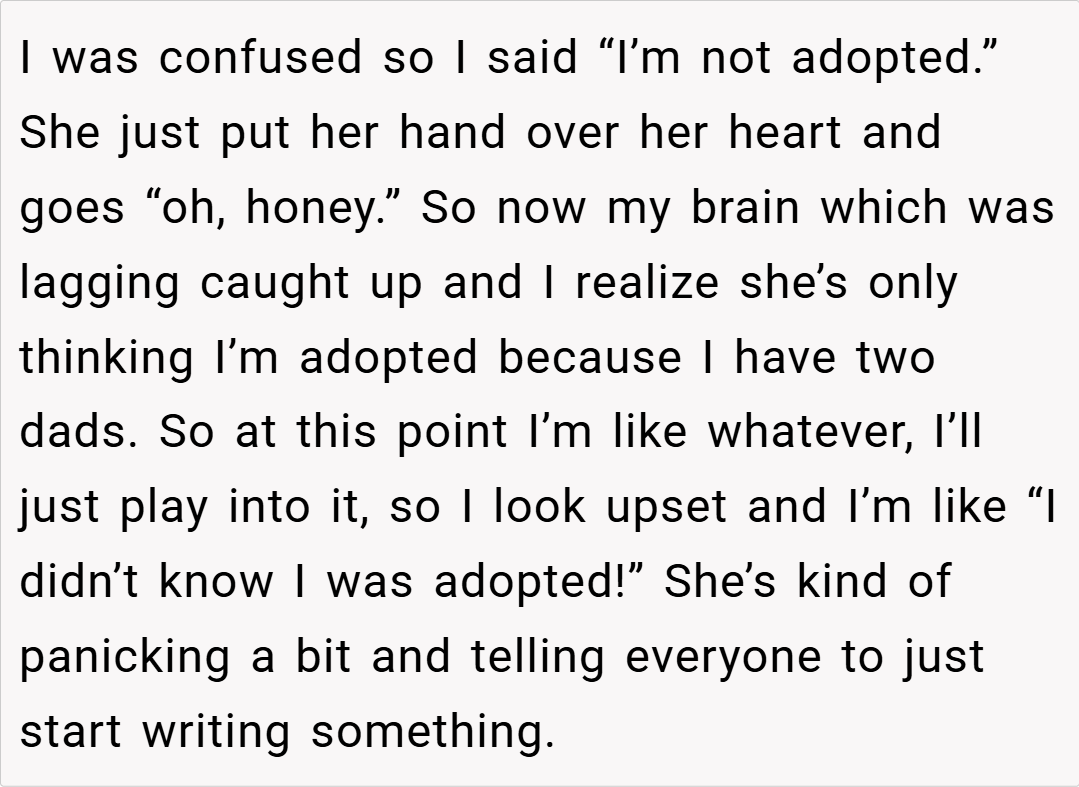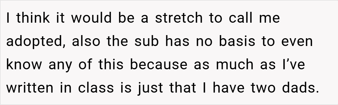 The story centers around a high school student with two fathers, one of whom is their biological parent through surrogacy. When their substitute English teacher incorrectly assumed the student was adopted and announced this assumption to the entire class, what followed was a masterclass in creative comeuppance that left the teacher flustered and fellow students stifling their laughter.