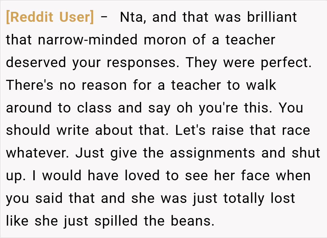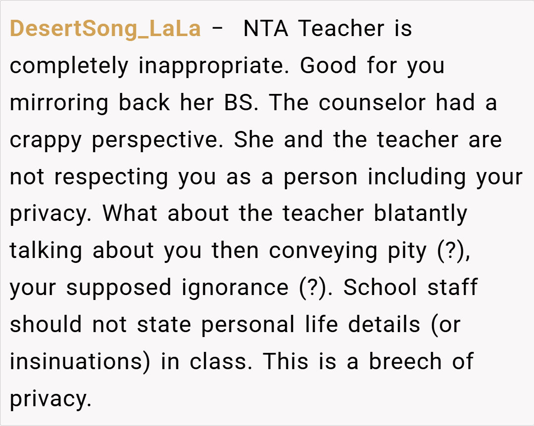 What do you think about this situation? Have you ever experienced something similar in your academic journey? Share your thoughts on how teachers can better navigate discussions about personal experiences in the classroom while maintaining appropriate boundaries.