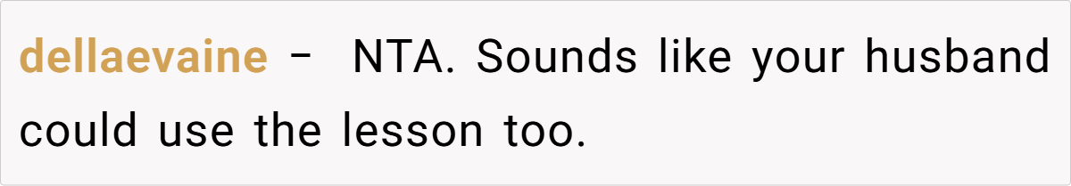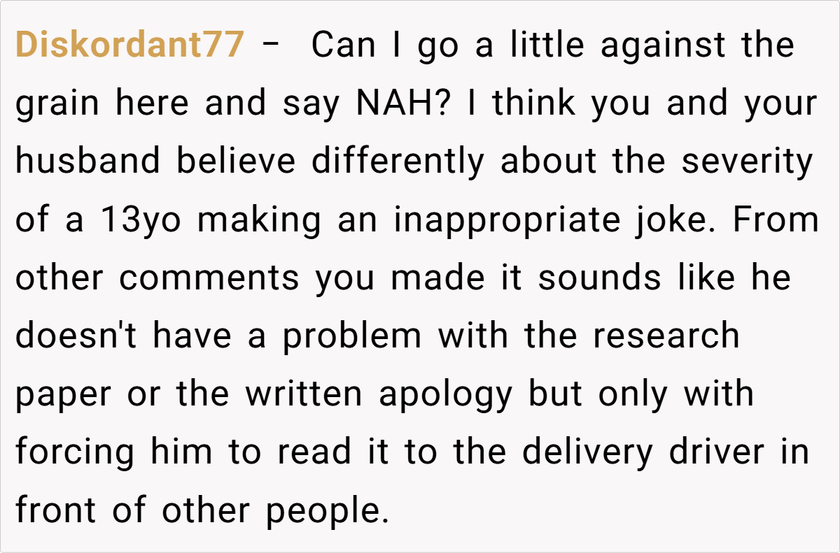 NTA by a long shot! Kudos to you and your excellent parenting. Your kid is 13 and is old enough for this type of discipline, and it’s a lesson that will stick. Your hubby, on the other hand, needs to get with the program and understand the seriousness of the situation. Just a joke?? If that’s truly what Dad thinks, then he’s the AH.