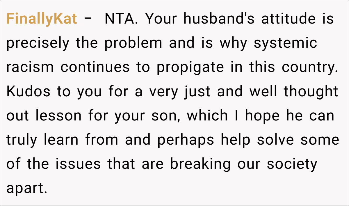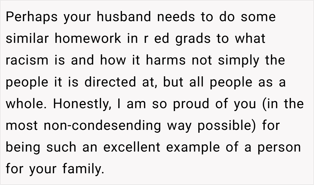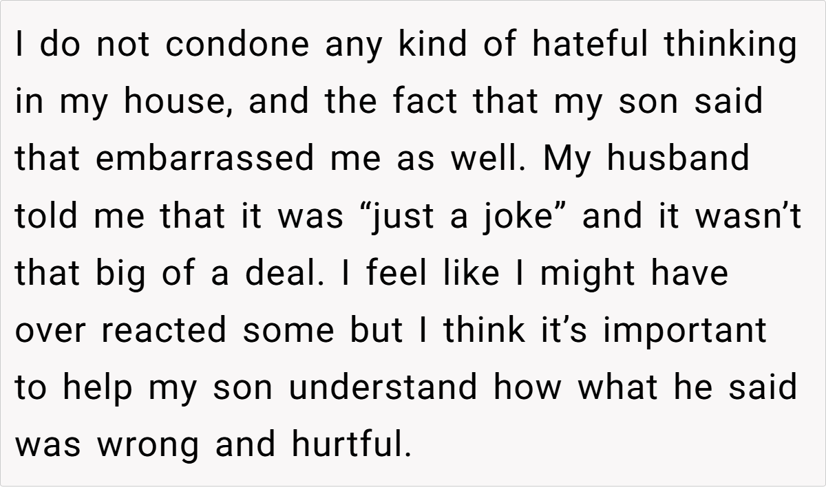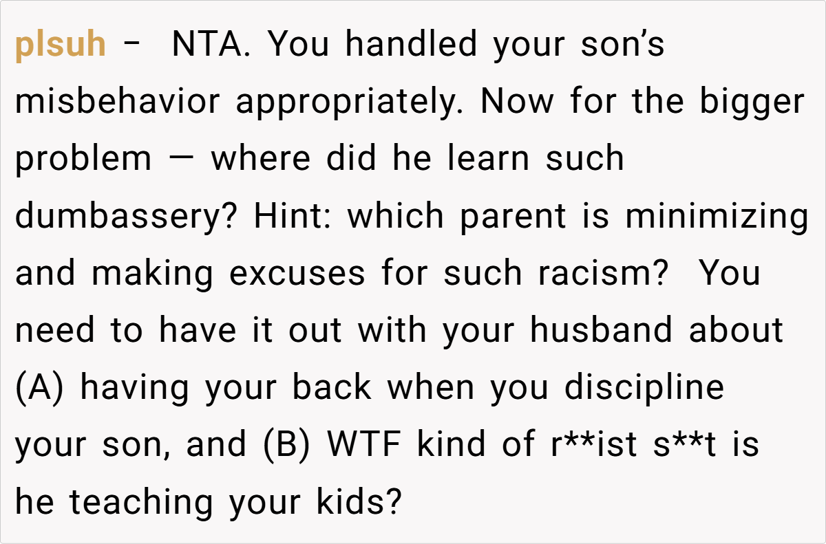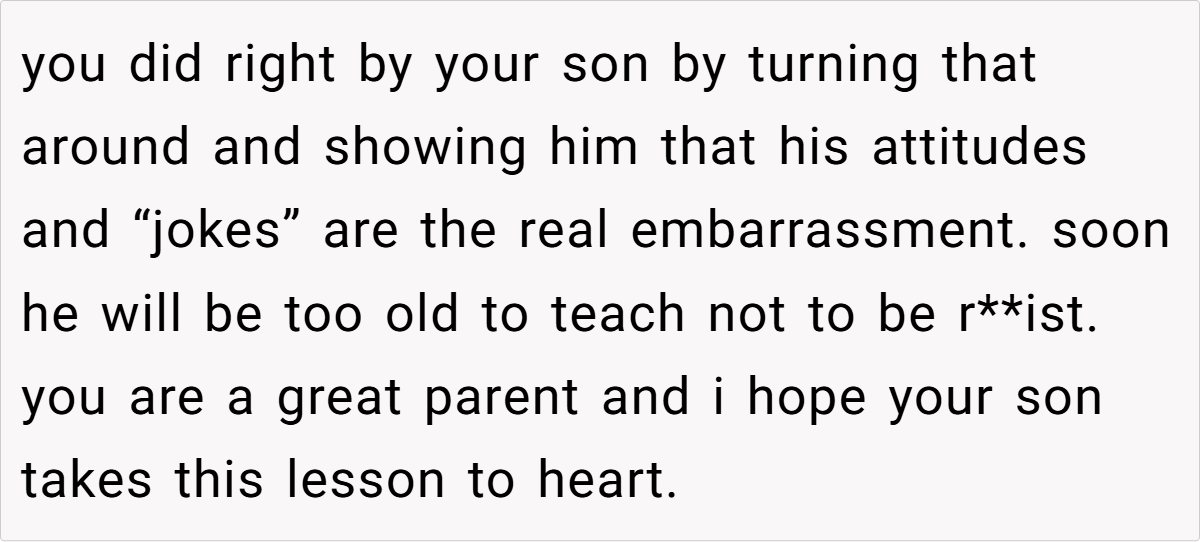 Many redditors support the mother’s decision, arguing that racist remarks—especially from a young child—must be addressed decisively. They commend her for taking the incident seriously and using it as an opportunity for education, rather than letting the comment slide as “just a joke.”