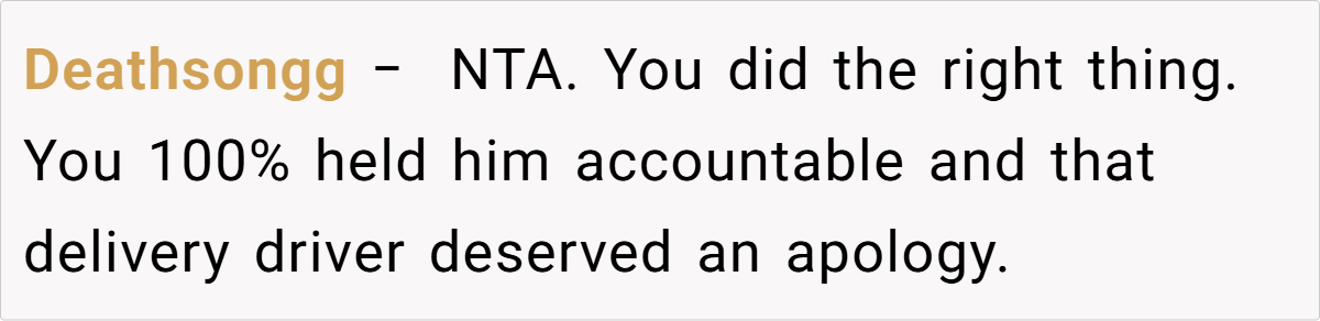 While her actions were appreciated by the delivery person, they also sparked an argument with her husband, who felt the punishment was too harsh and humiliating. The central question remains: was her reaction justified, or did she overreact?
