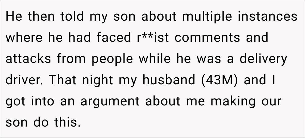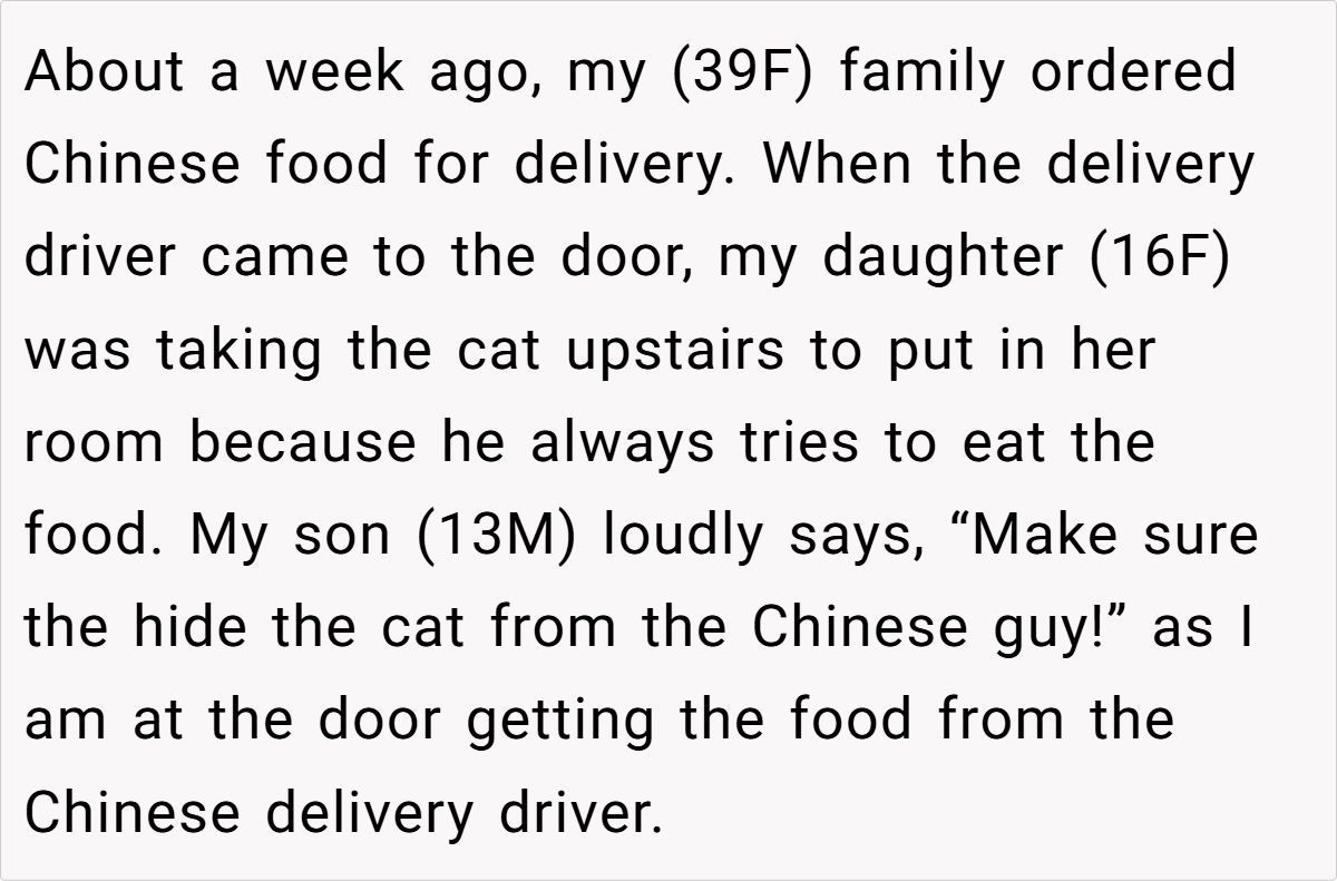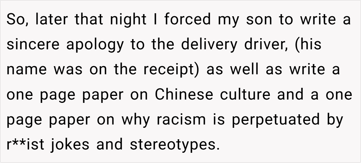 This article addresses a difficult situation involving racism, accountability, and parental discipline. A 39-year-old mother describes how her 13-year-old son made a racist, offensive remark while delivering Chinese food and how she decided to punish him to help him understand the harm such language could cause.
