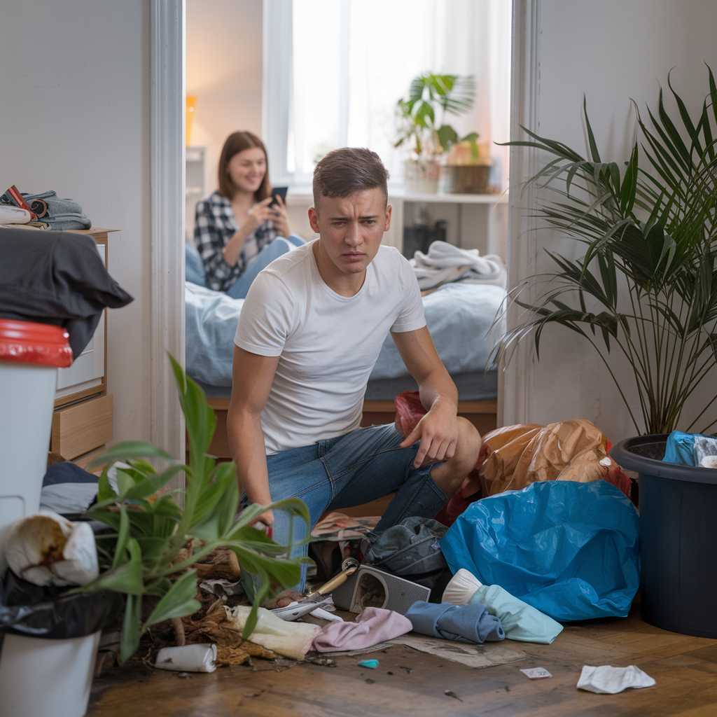 Recently, she has stopped cleaning and instead plays a virtual cleaning game, which frustrates him. After a particularly messy week, he reacted out of anger by making a huge mess before leaving for a five-day work trip.