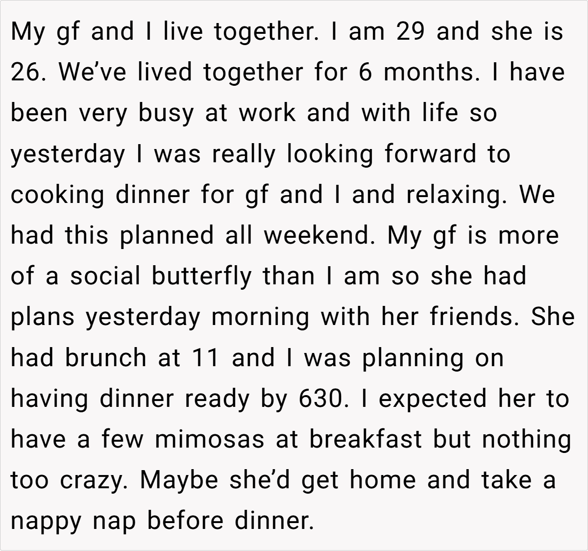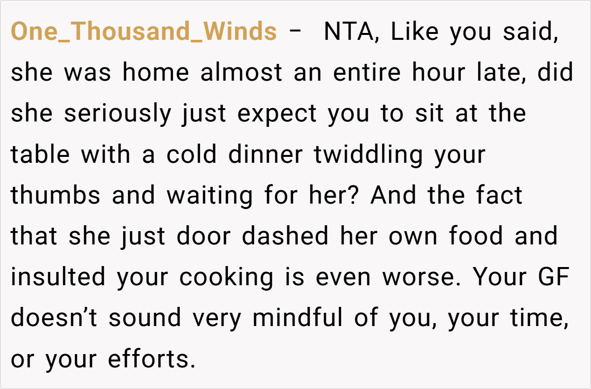 Picture a quiet evening at home, the promise of a lovingly prepared dinner after a long, busy week igniting hope for a much-needed moment of connection. The OP eagerly anticipated cooking dinner for his girlfriend—a planned retreat from life’s chaos—where every detail was meant to foster intimacy and relaxation. Yet, the stage was set for unforeseen disappointment.