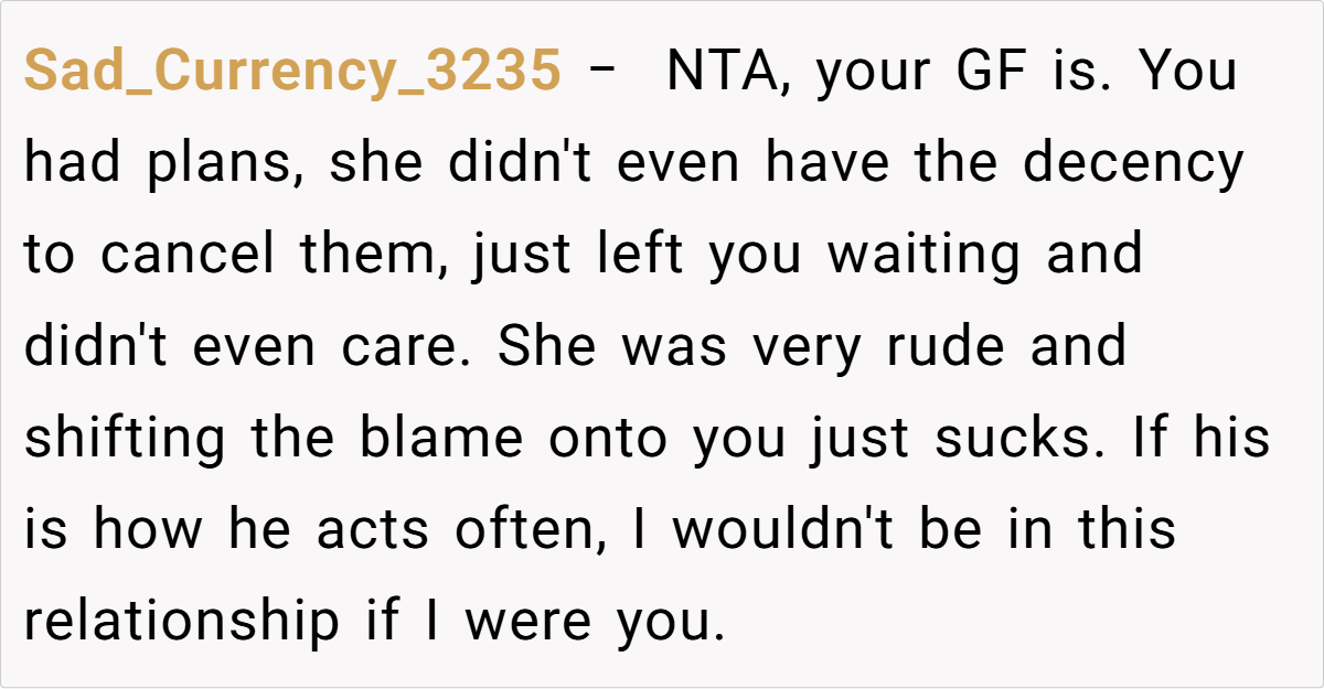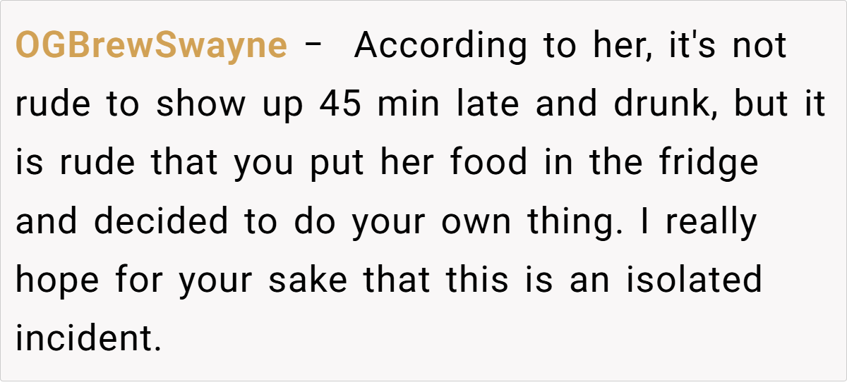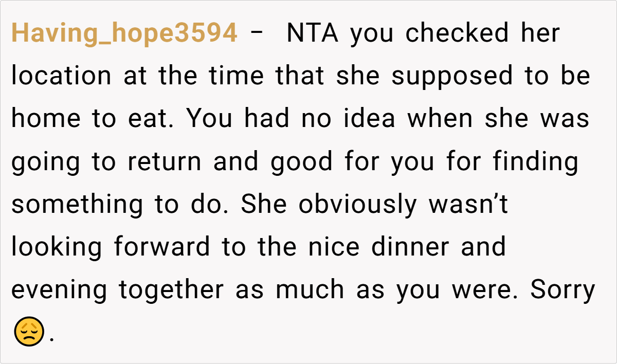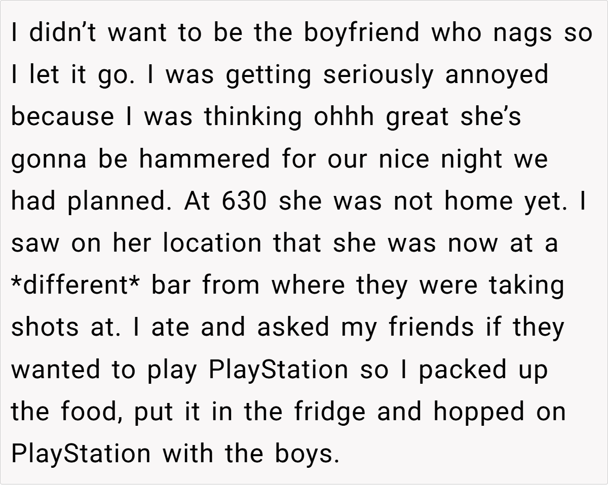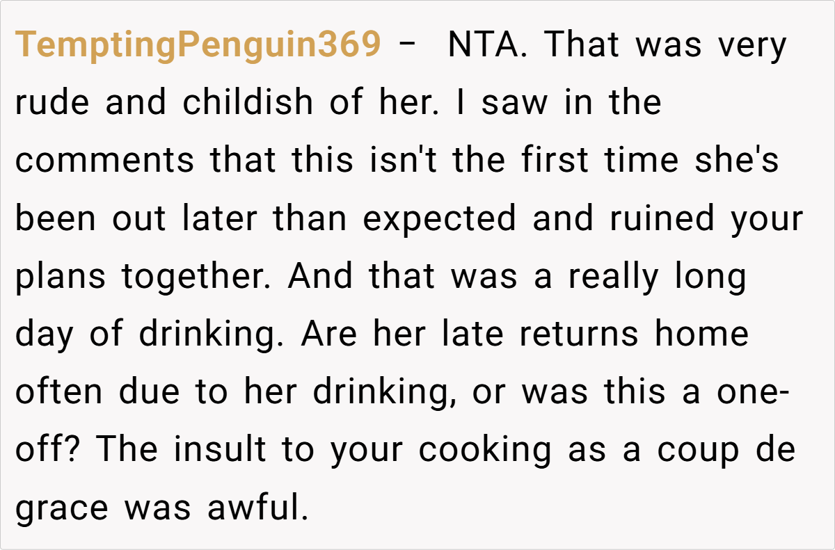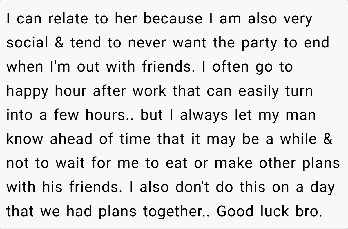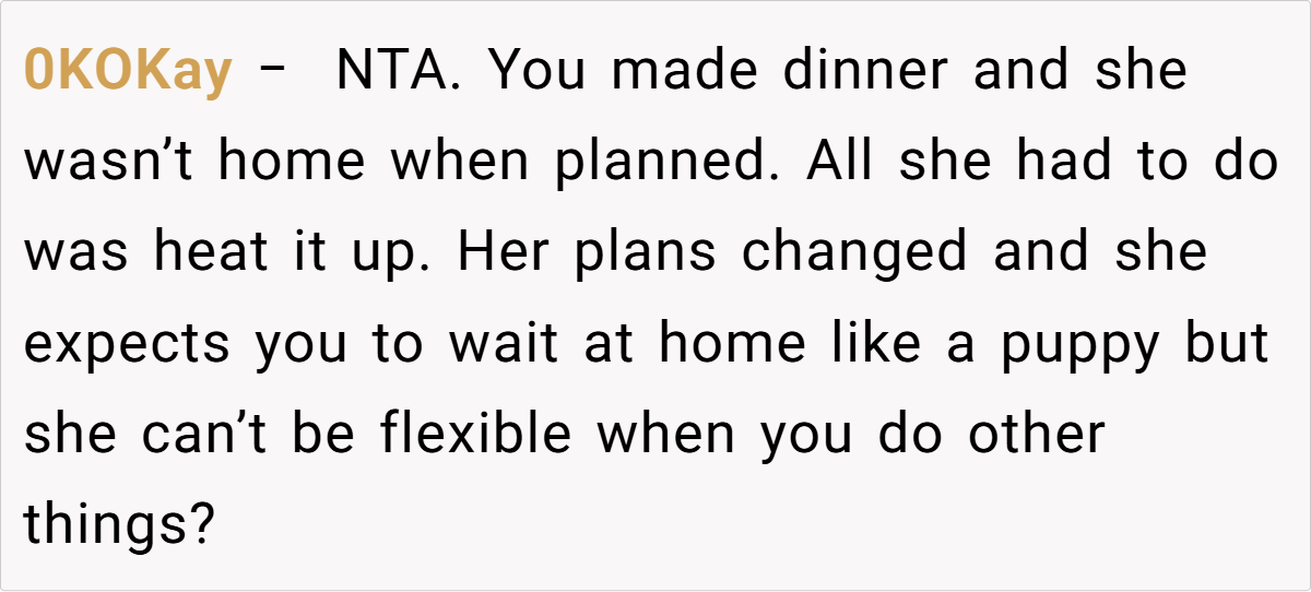 When plans get derailed, it can leave both partners feeling disoriented. In this case, the OP’s frustration is palpable as his well-laid plans for a cozy dinner unravel due to last-minute social escapades. Such moments remind us that relationships are often a delicate balance between personal desires and unexpected disruptions, where clear communication is paramount. The evening’s disappointment underscores the importance of mutual respect for each other’s time.