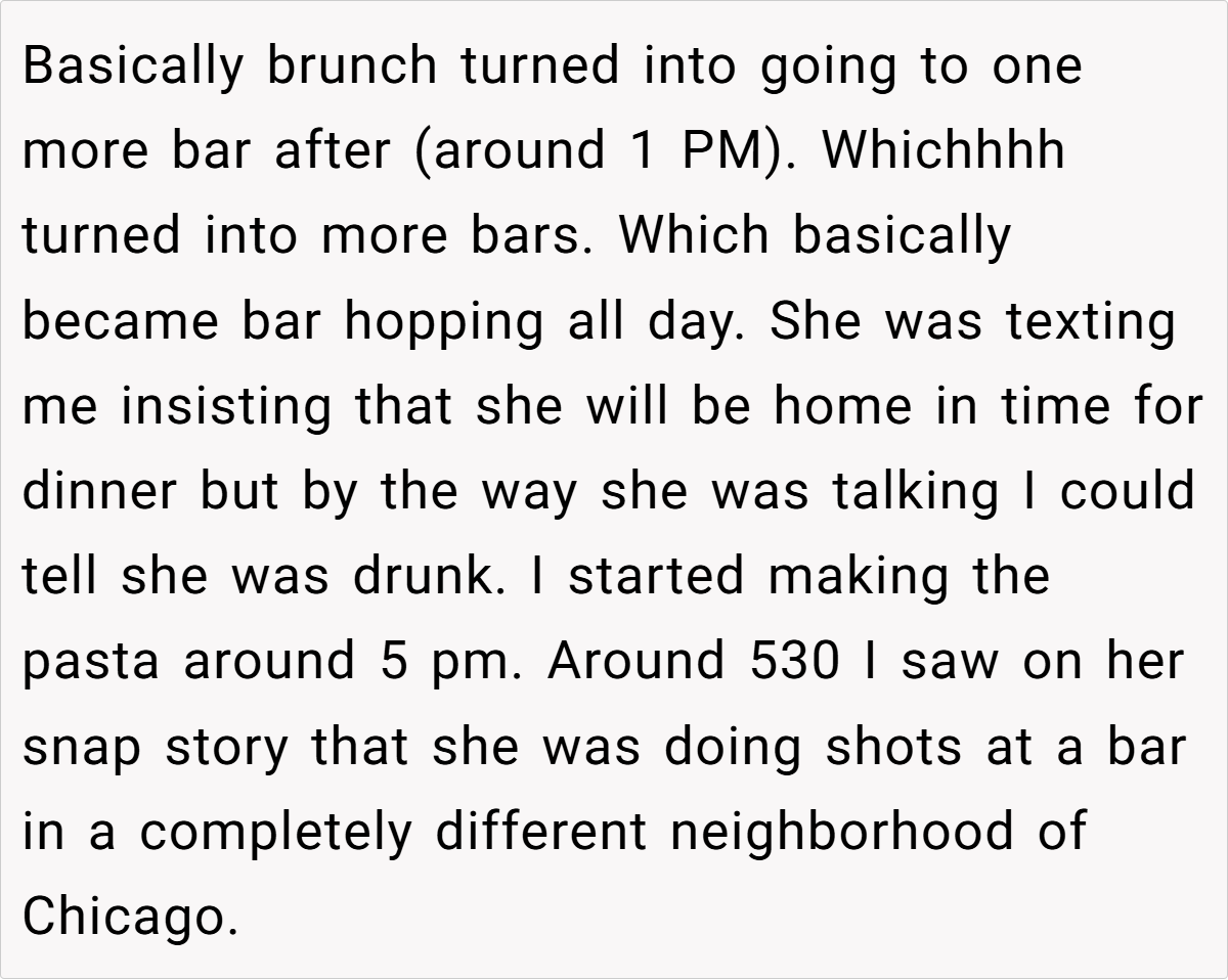 However, the carefully drawn blueprint of a serene night unraveled when his partner’s social escapade took over the day. Instead of a brief brunch with a few mimosas, her plans evolved into an all-day bar hop across Chicago. This unexpected turn not only derailed their plans but also left both questioning the balance between spontaneity and commitment.