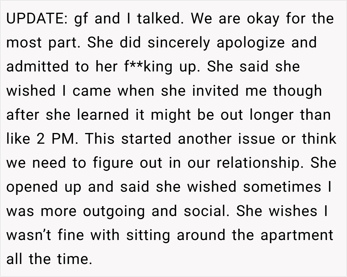 Analyzing the situation reveals two clashing lifestyles: one partner who thrives on spontaneous social outings and another who cherishes planned, quiet evenings. The OP’s disappointment stems from unmet expectations and the lack of communication about his partner’s changing plans. While a vibrant social life injects energy into one’s days, it can inadvertently lead to neglecting shared commitments. Both perspectives highlight the challenge of balancing personal freedom with the responsibilities that come with a relationship.