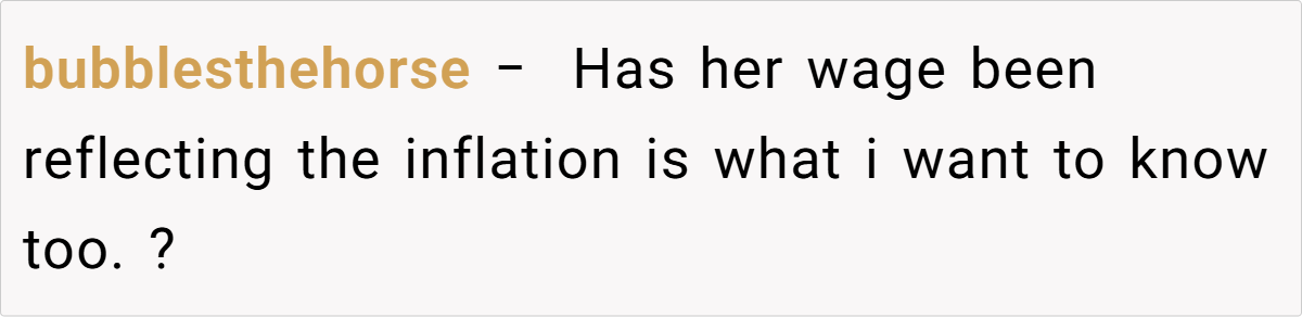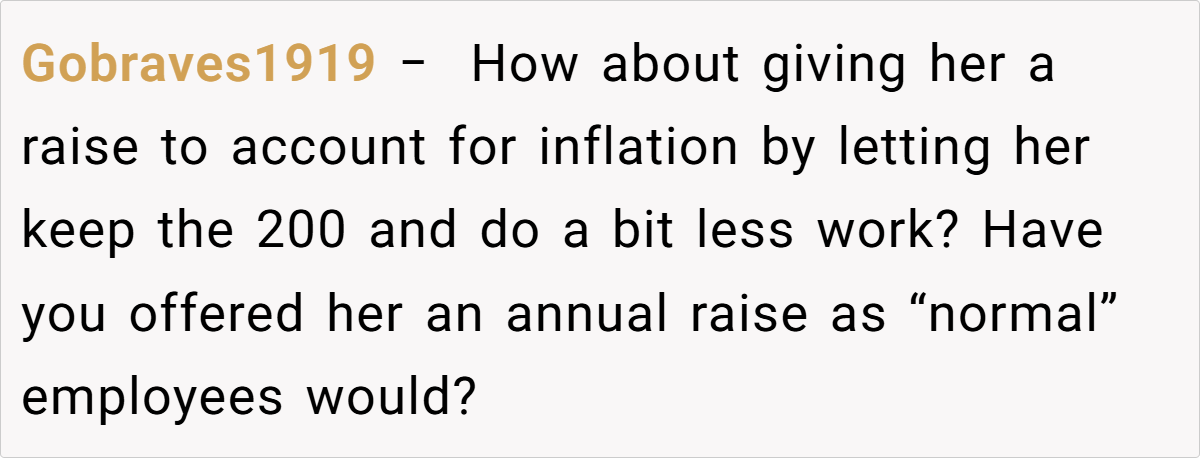 Financial advisor Ramit Sethi, author of I Will Teach You to Be Rich, critiques stagnant wages: “If you haven’t adjusted her pay for inflation in five years, you’re already underpaying her. A ‘raise’ to maintain her current rate is basic fairness.” The Bureau of Labor Statistics reports a 20% cumulative inflation rate since 2019, meaning her 200 today is worth 160 in 2019 dollars.