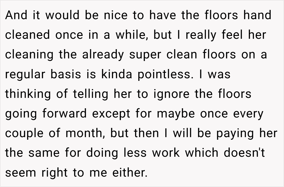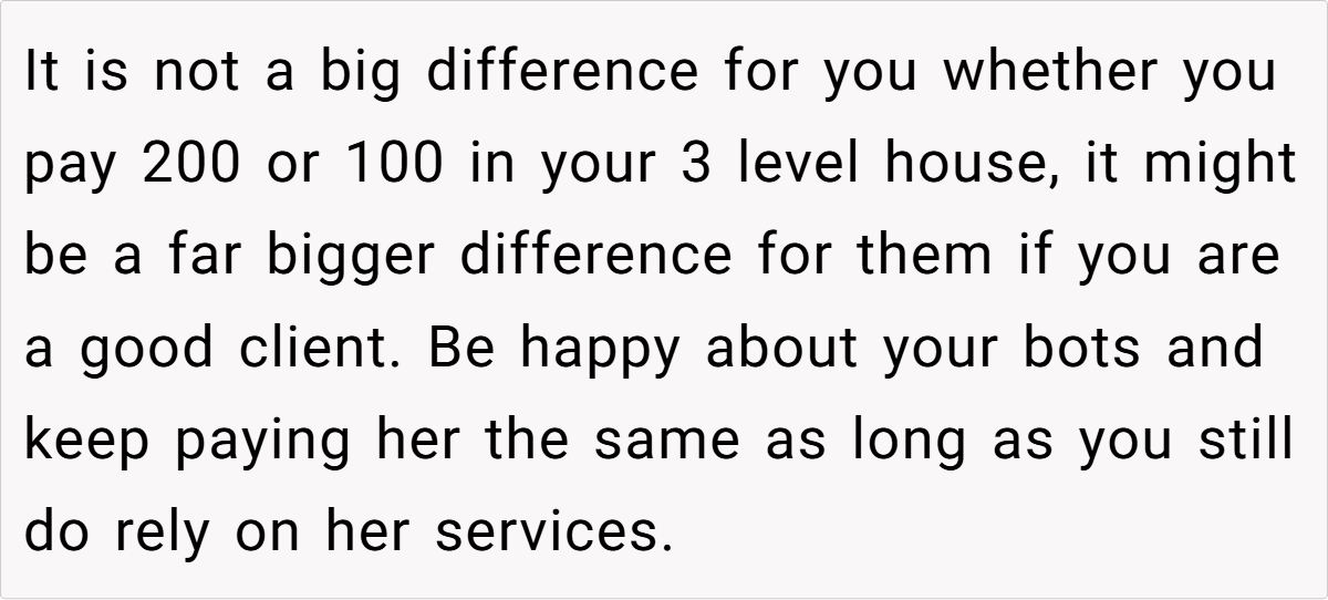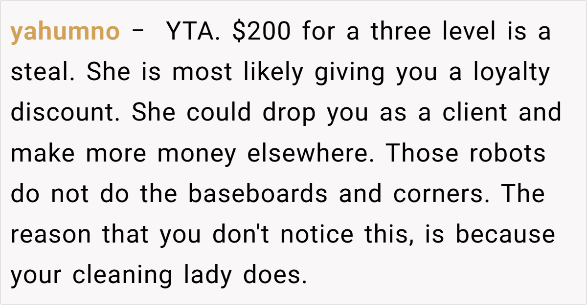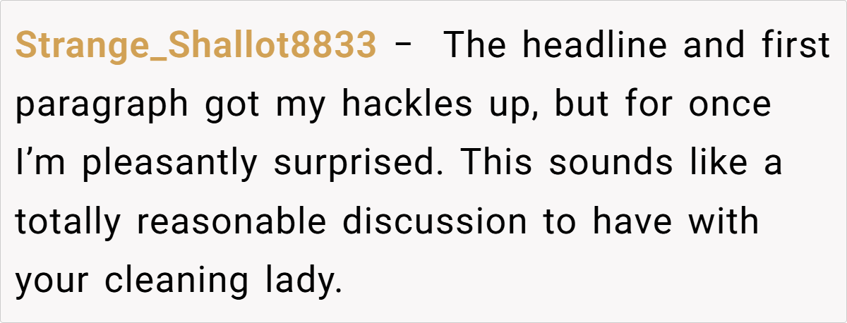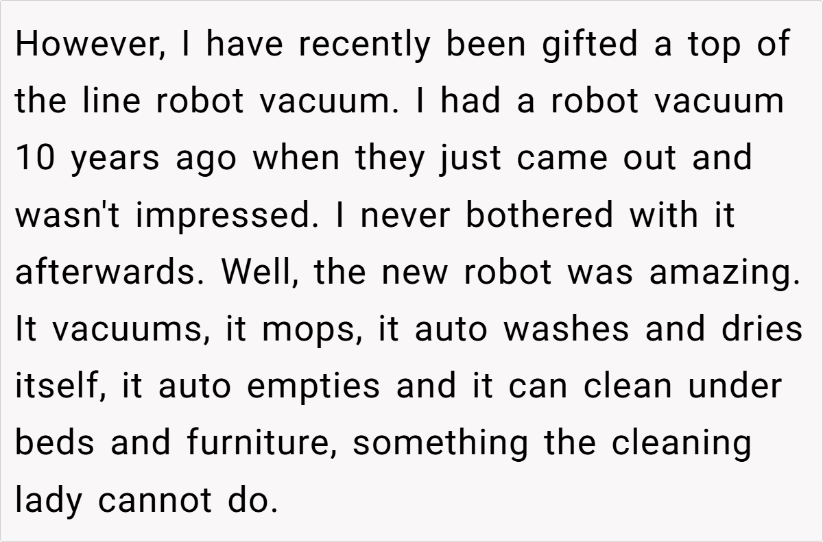 This story highlights the tension between embracing automation and honoring human labor. While robots streamline chores, they can’t replicate the nuanced care of a trusted cleaner. Reducing pay risks undermining years of reliability, but adjusting tasks or frequency could align services with evolving needs.