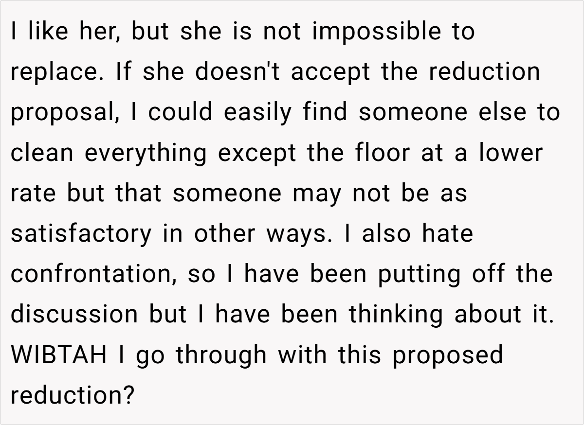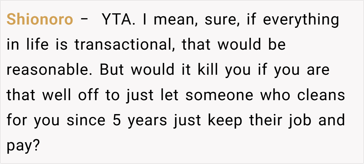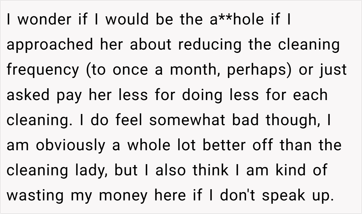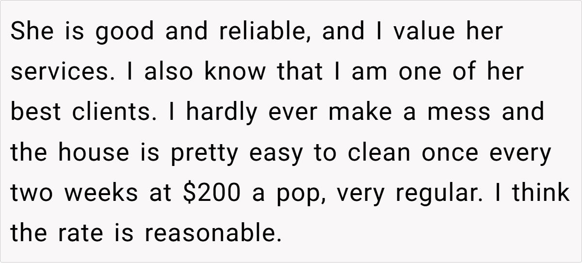 This story highlights the tension between embracing automation and honoring human labor. While robots streamline chores, they can’t replicate the nuanced care of a trusted cleaner. Reducing pay risks undermining years of reliability, but adjusting tasks or frequency could align services with evolving needs.